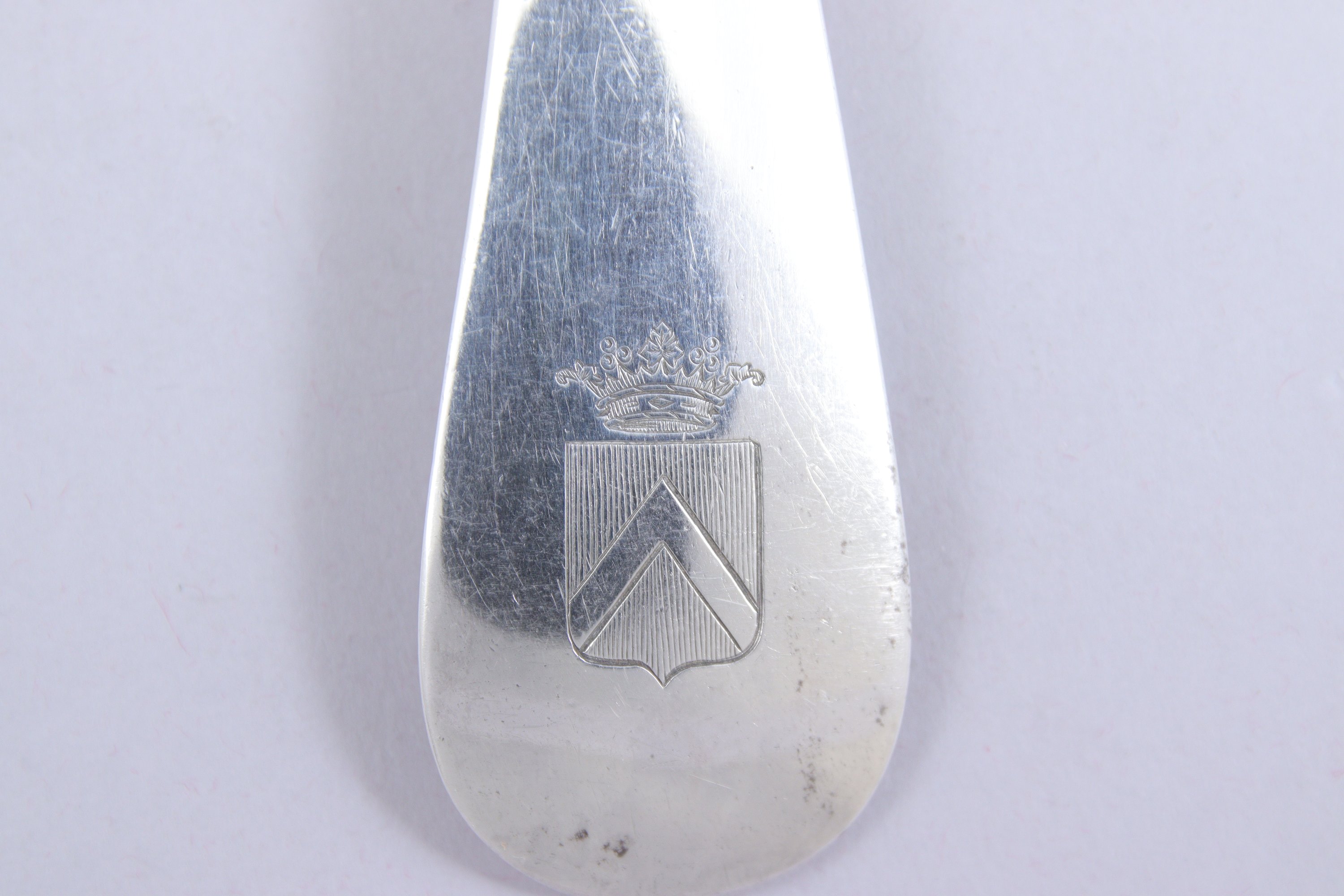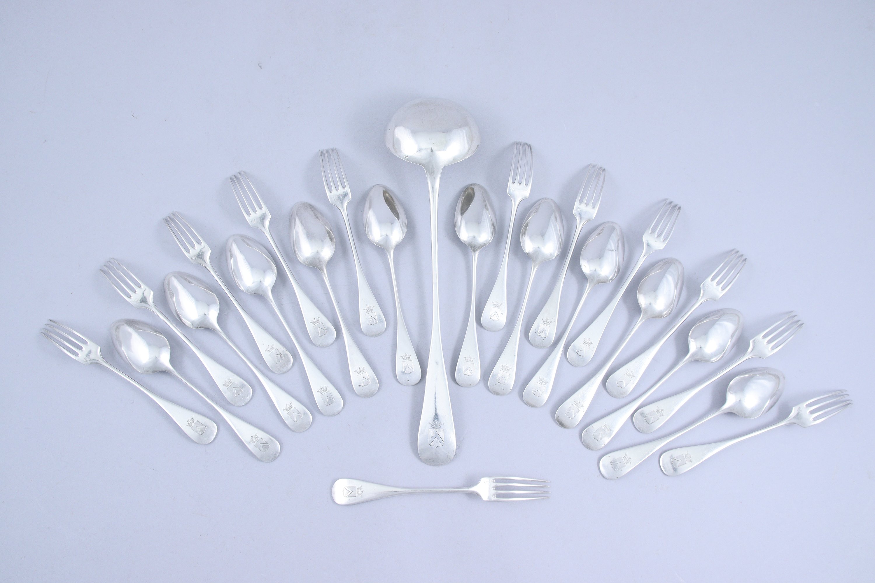 ONZE COUVERTS et une FOURCHETTE à DESSERT en argent et une grande LOUCHE armoriée.