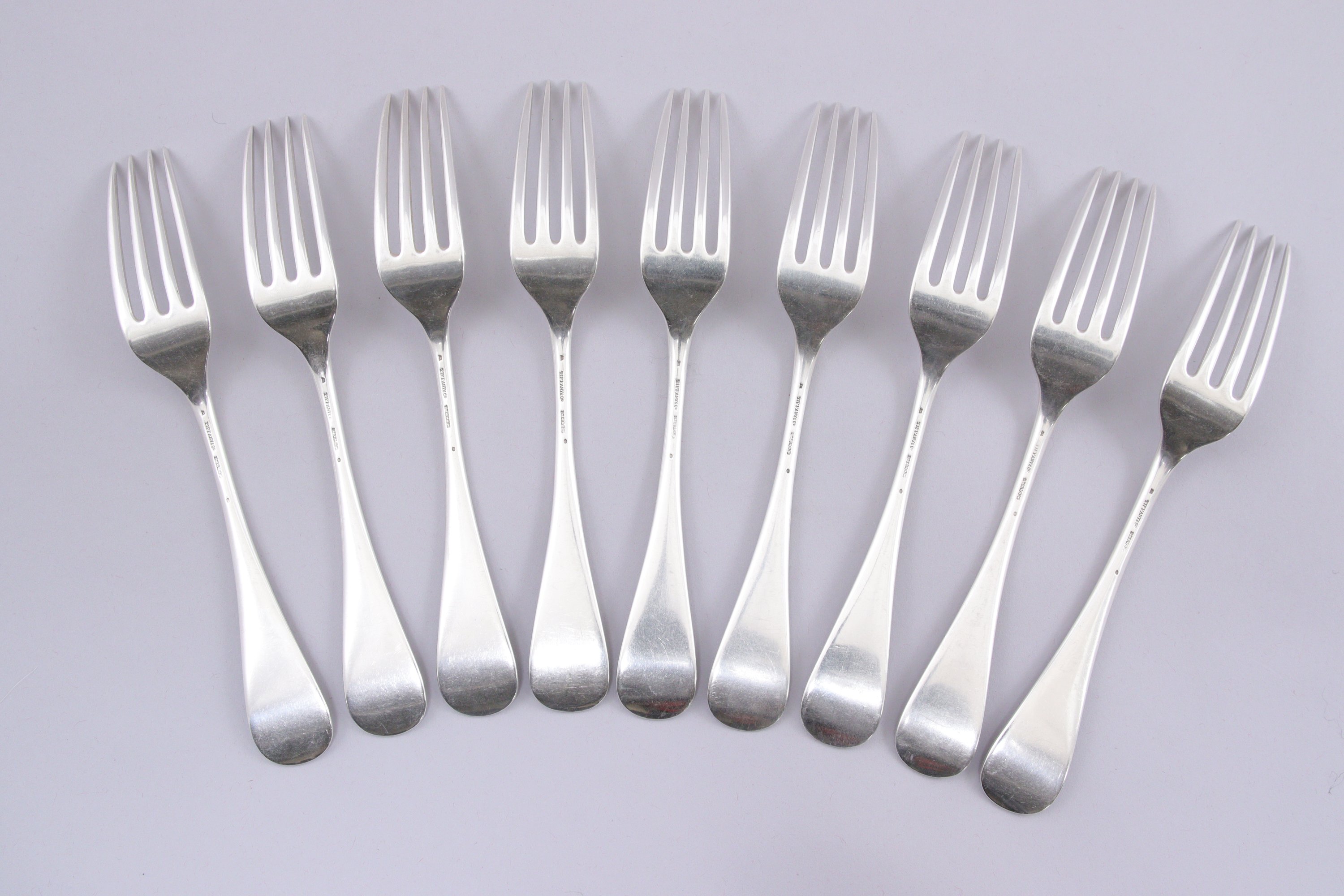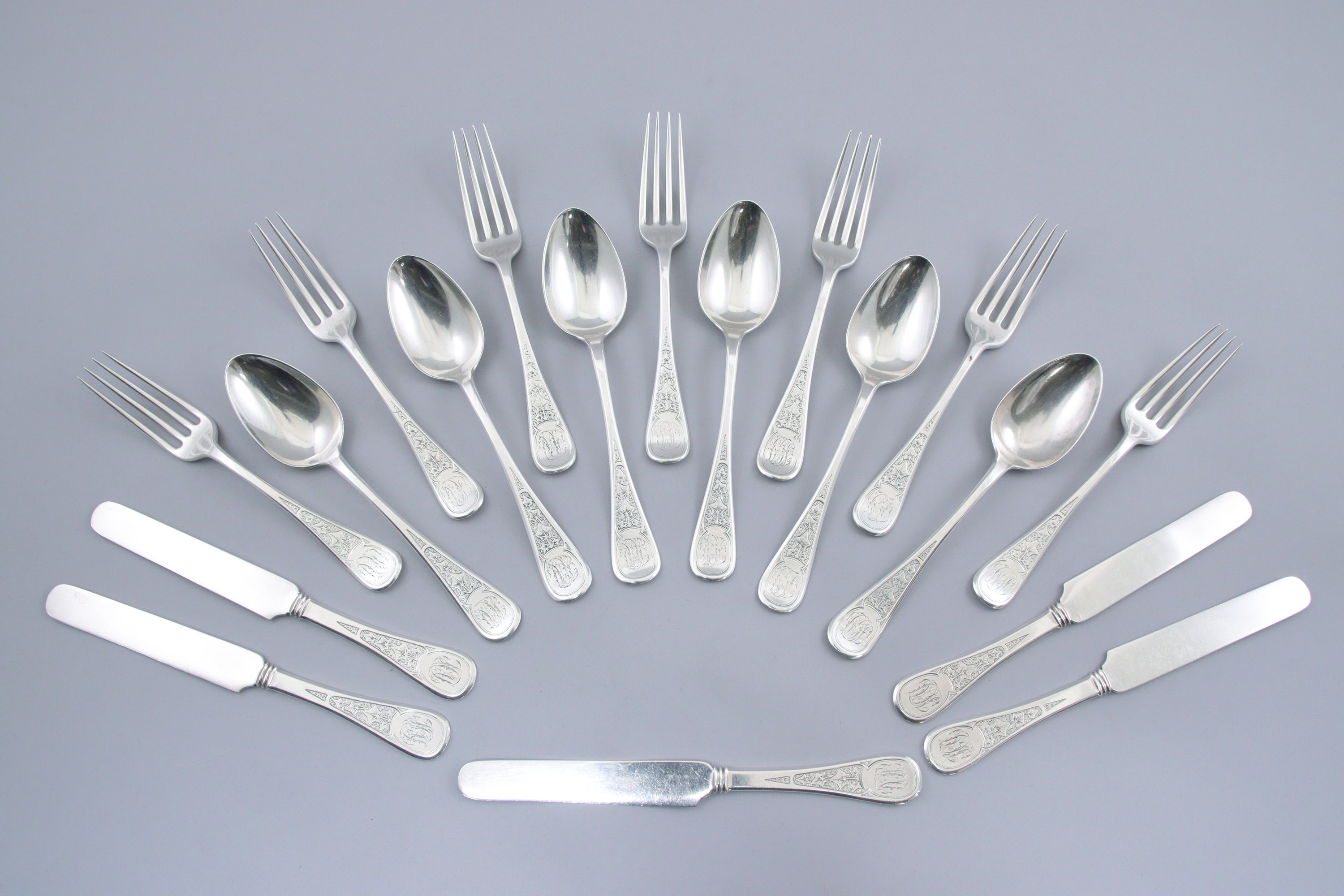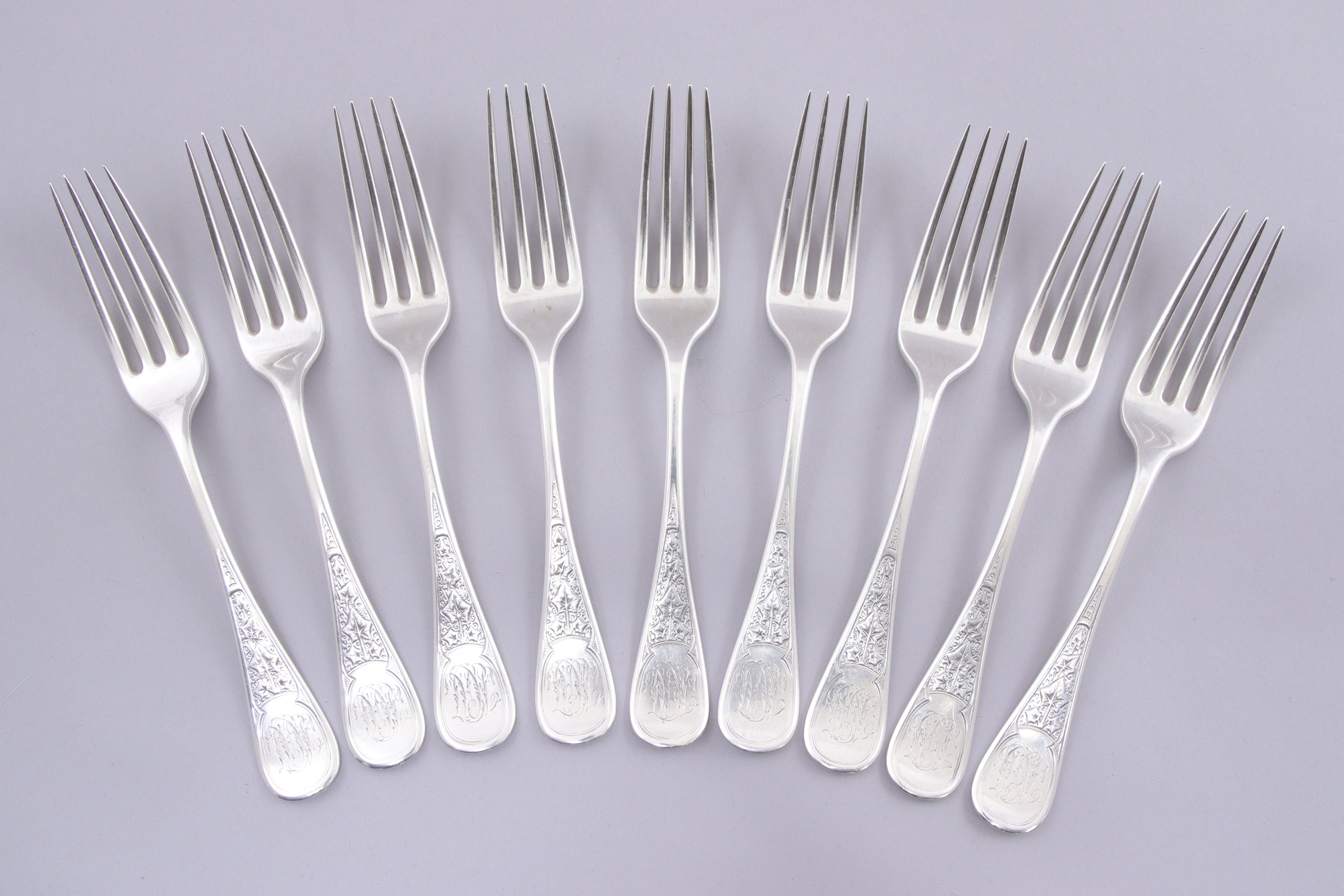 TIFFANY and Co. PARTIE de SERVICE de VINGT-SEPT PIÈCES à décor gravé de feuilles de lierre et monogrammé dans des cartouches, comprenant SIX COUVERTS de TABLE et TROIS FOURCHETTES de TABLE et SEPT FOURCHETTES à ENTREMETS et CINQ COUTEAUX à ENTREMETS.