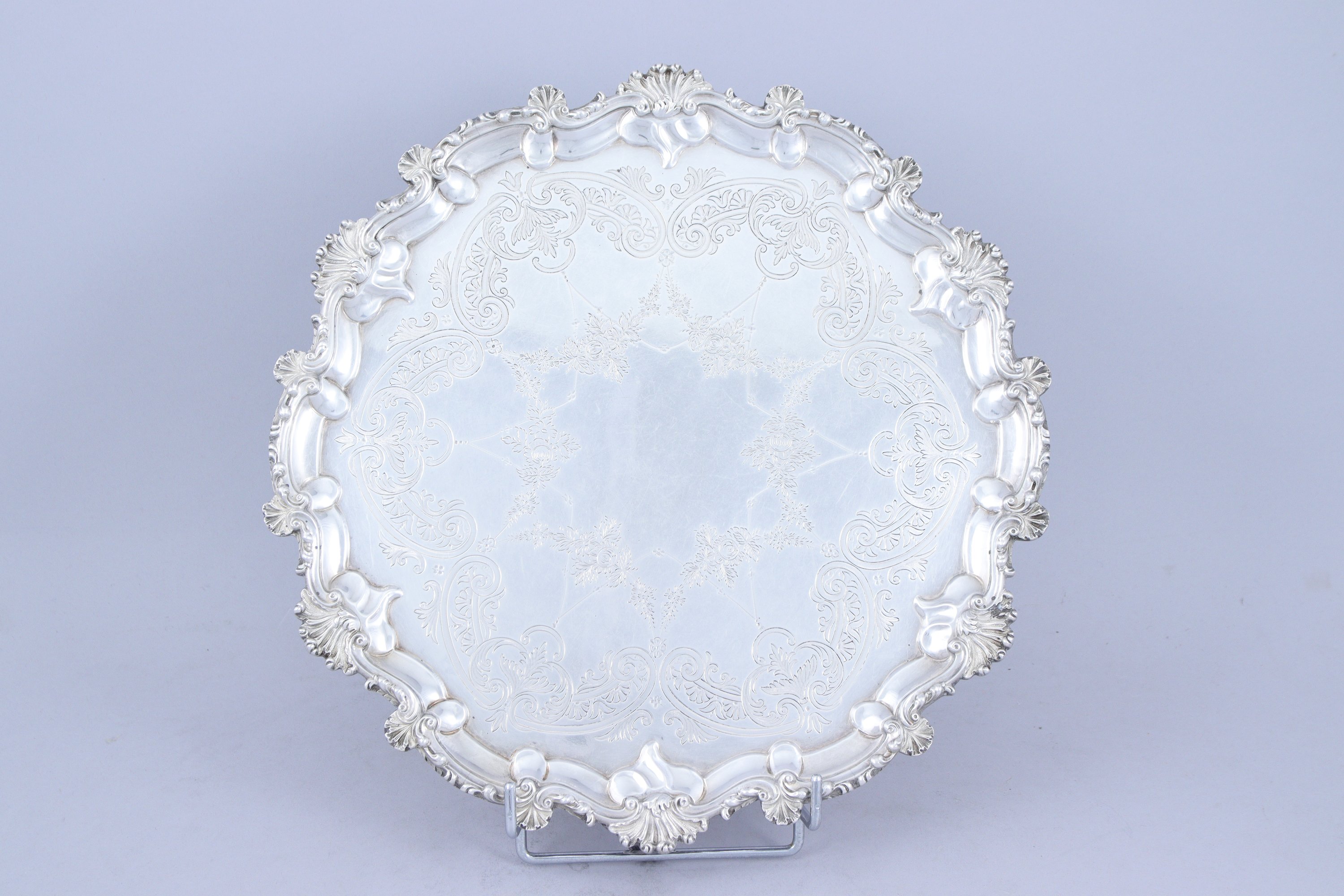 JOINT: PLAT en argent de forme circulaire, l'aile à décor de coquilles entourées de frises de godrons. Il repose sur quatre pieds en enroulement. Poinçons anglais. Londres. Lettre-date F (1901). Orfèvre M. Bros. Diam. 33 cm. Poids 1105 g.