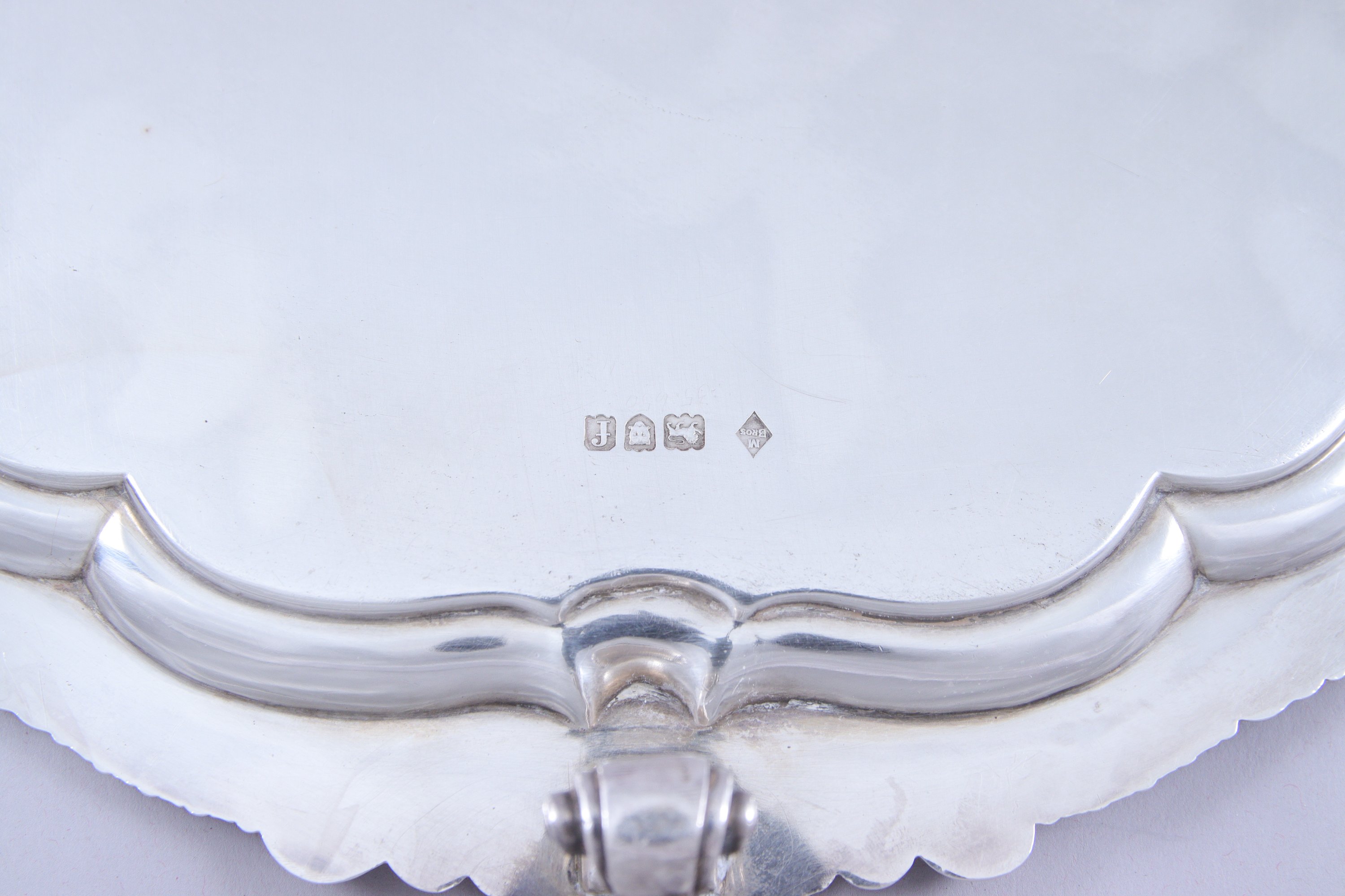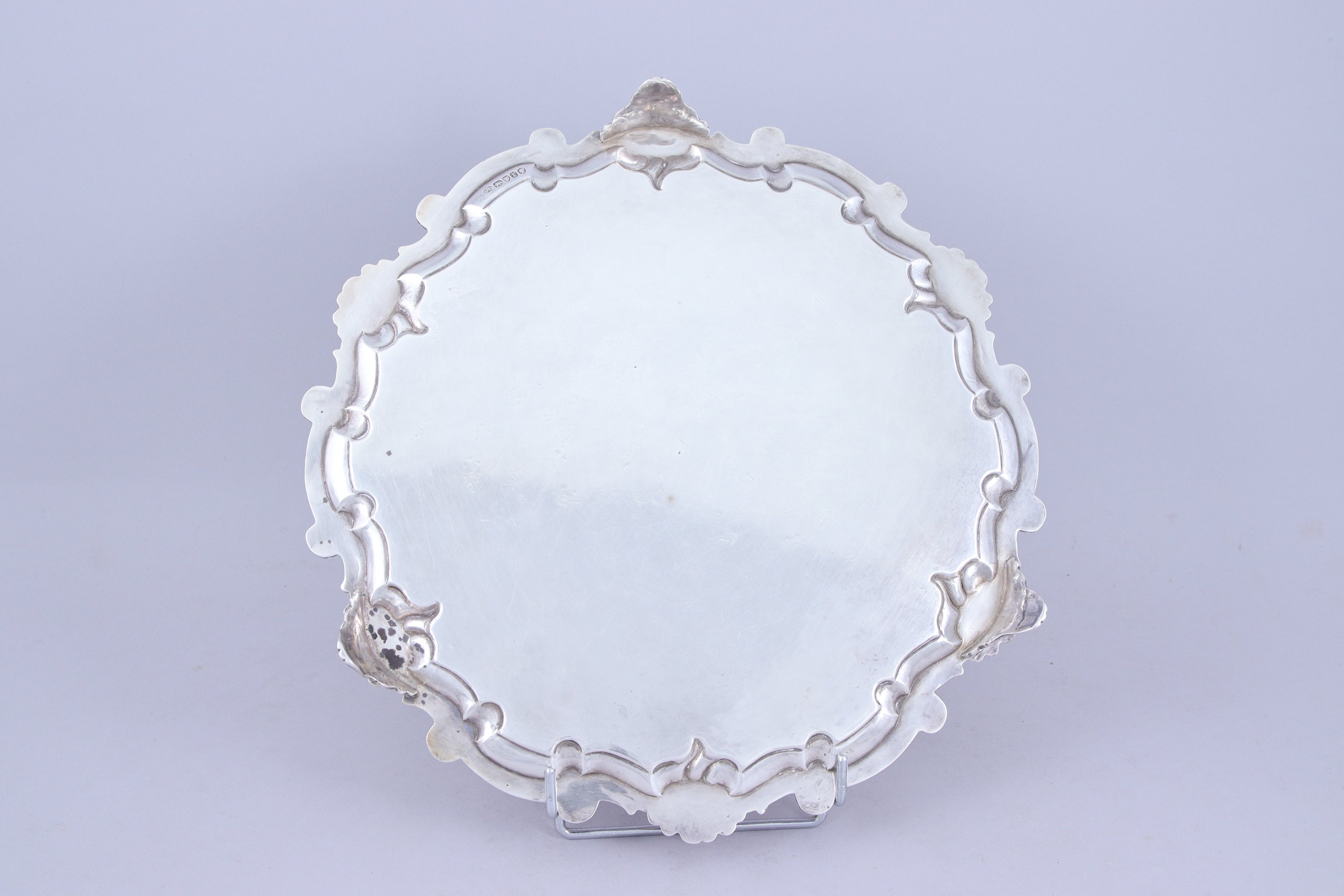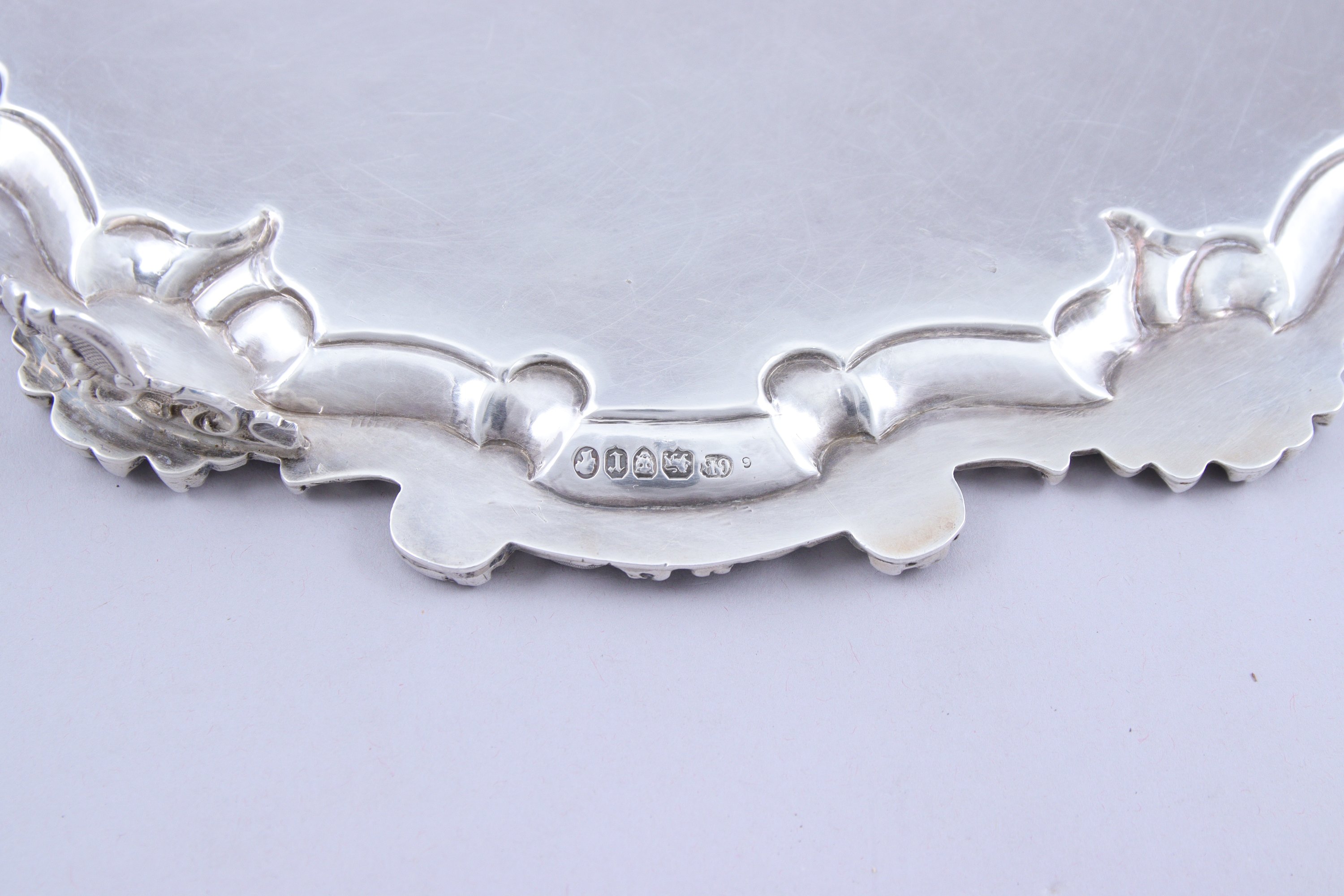 ANGLETERRE, 1902. PLAT en argent de forme circulaire, l'aile à décor de coquilles et rinceaux. L'intérieur est gravé d'une étoile à douze branches ornée d'une guirlande fleurie et inscrit dans un cartouche polylobé. Il repose sur trois pieds.