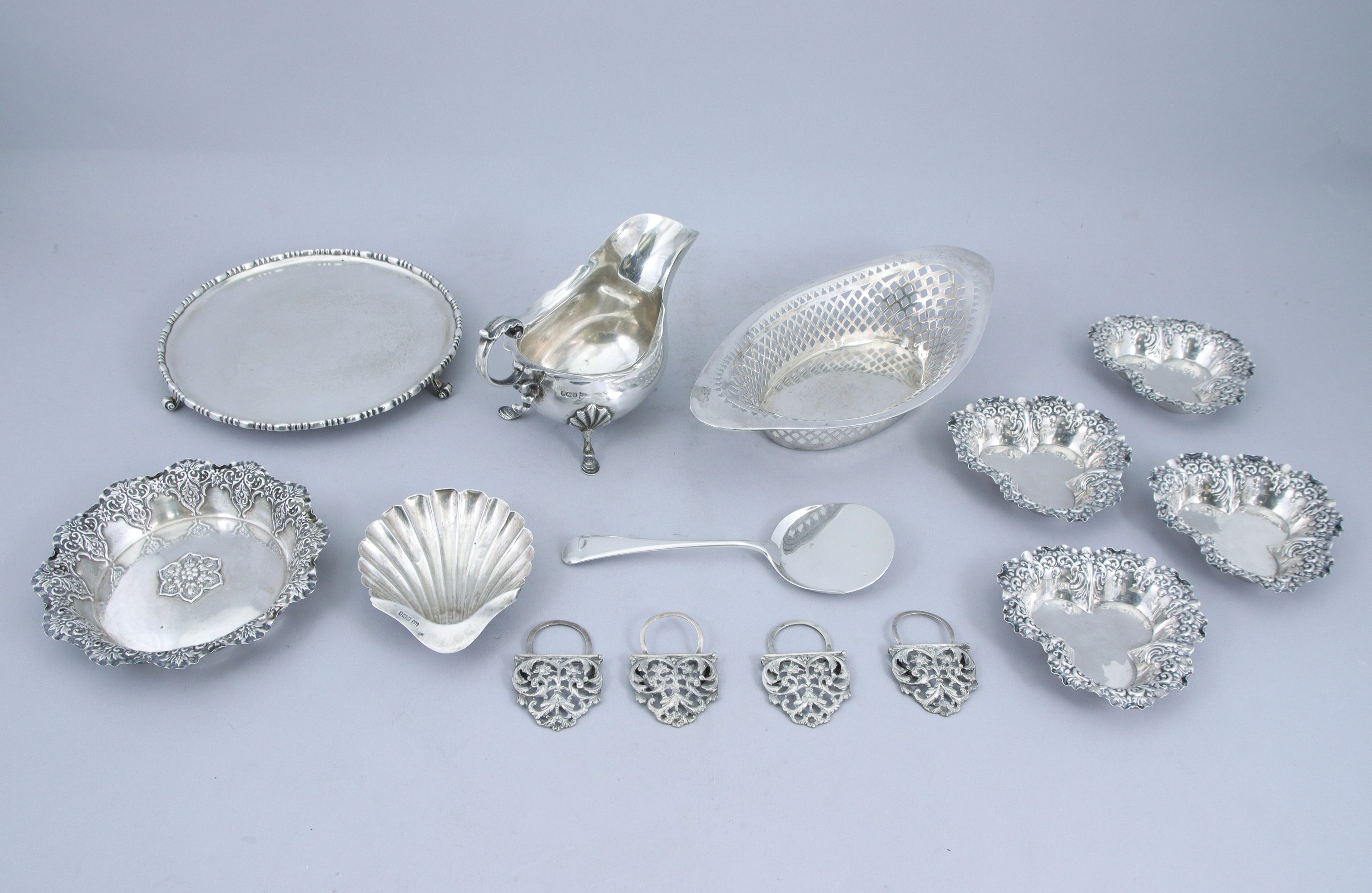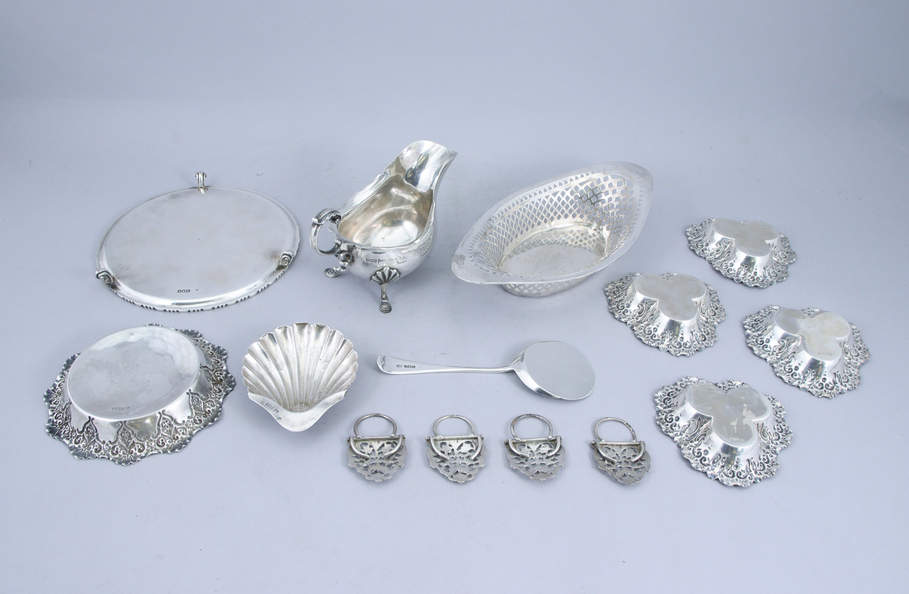 - Quatre COUPELLES trilobées à motif d'enroulements et motifs végétaux. Sheffield. Lettre-date h et k (1900 et 1902). Diam. 12 cm. Poids 210 g.