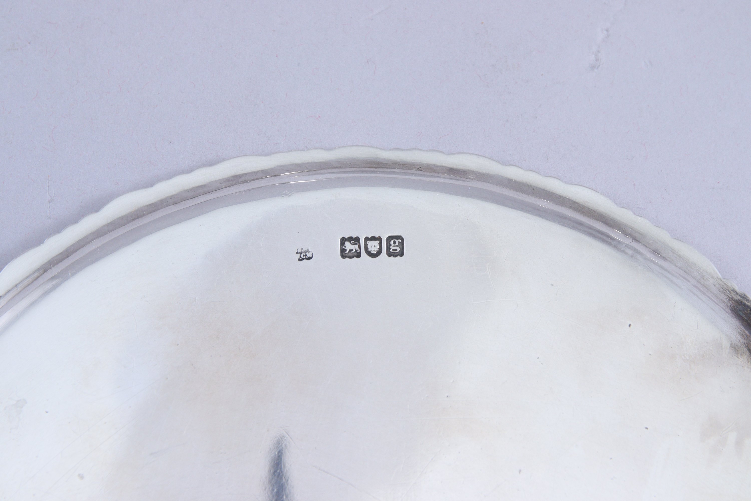- Un DESSOUS de PLAT à décor de perles. Repose sur trois pieds. Londres. Lettre-date g (1902). Diam. 21,5 cm. Poids 425 g.