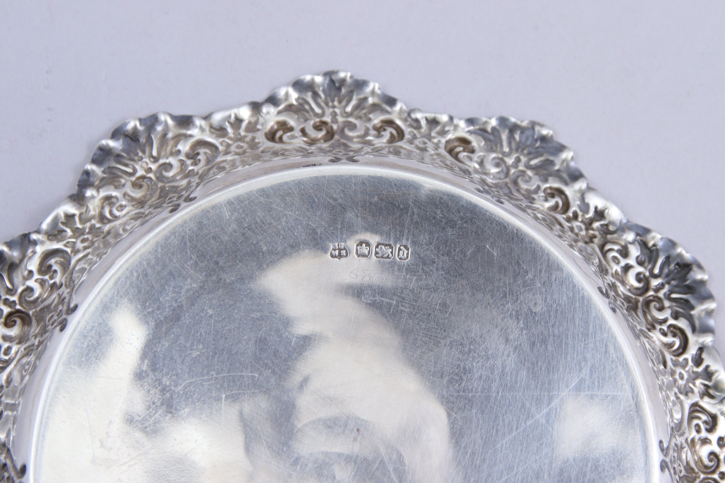 - Un DESSOUS de BOUTEILLE de forme circulaire à décor d'enroulements et motifs végétaux. L'intérieur orné d'une fleur épanouie. Sheffield. Lettre-date d (1896). Orfèvre "S?ws". Diam. 16 cm. Poids 95 g.