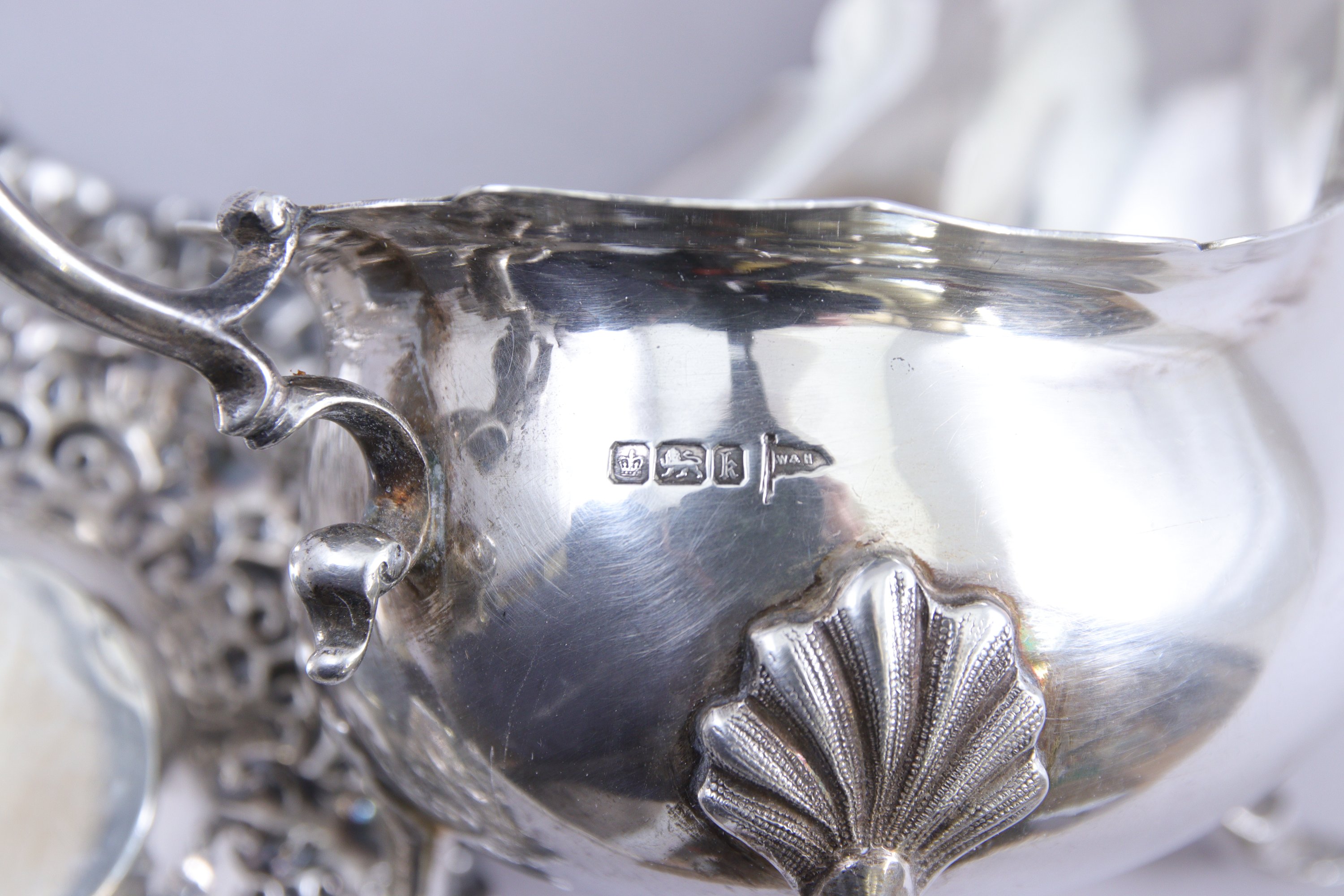 - Une PANIÈRE de forme oblongue. La panse ajourée de losanges. Sheffield. Lettre date k (1902). Orfèvre HA. Long. 28,5 cm. Poids 195 g.