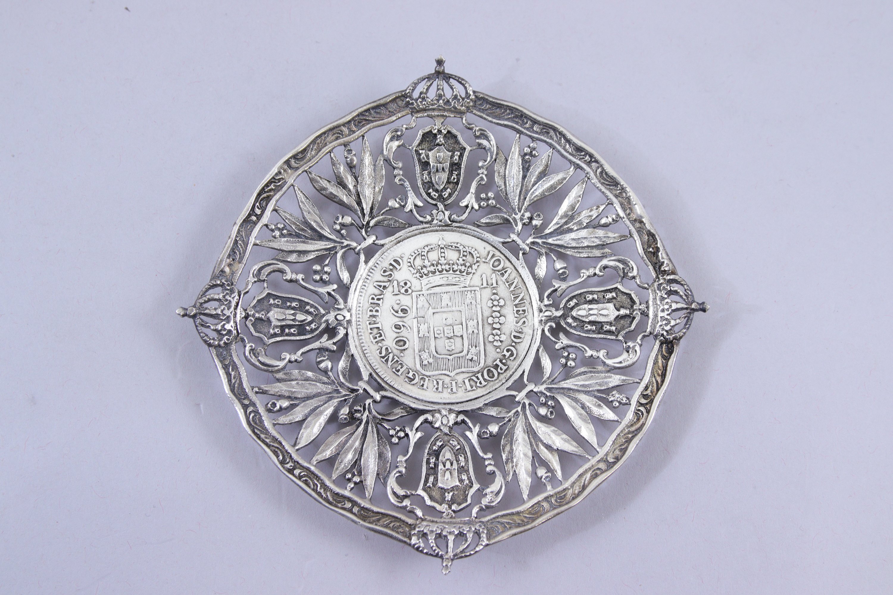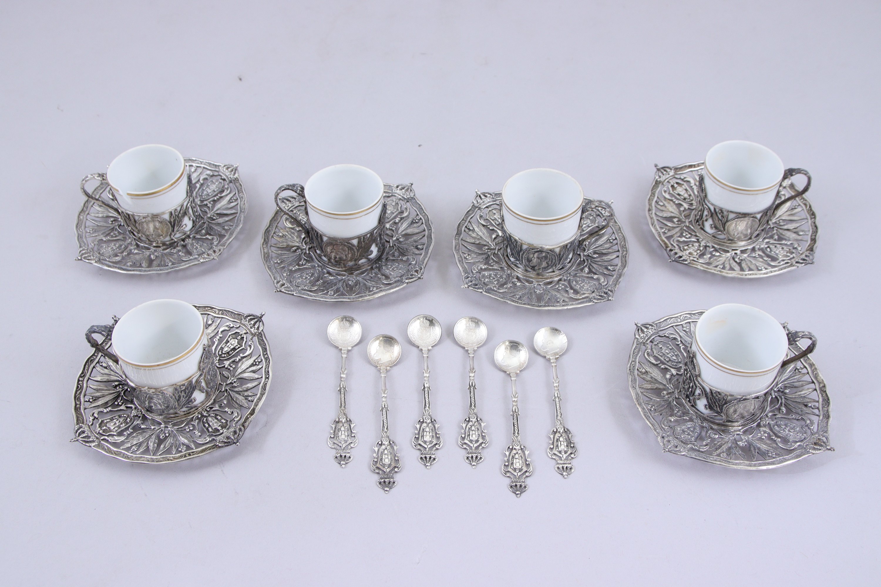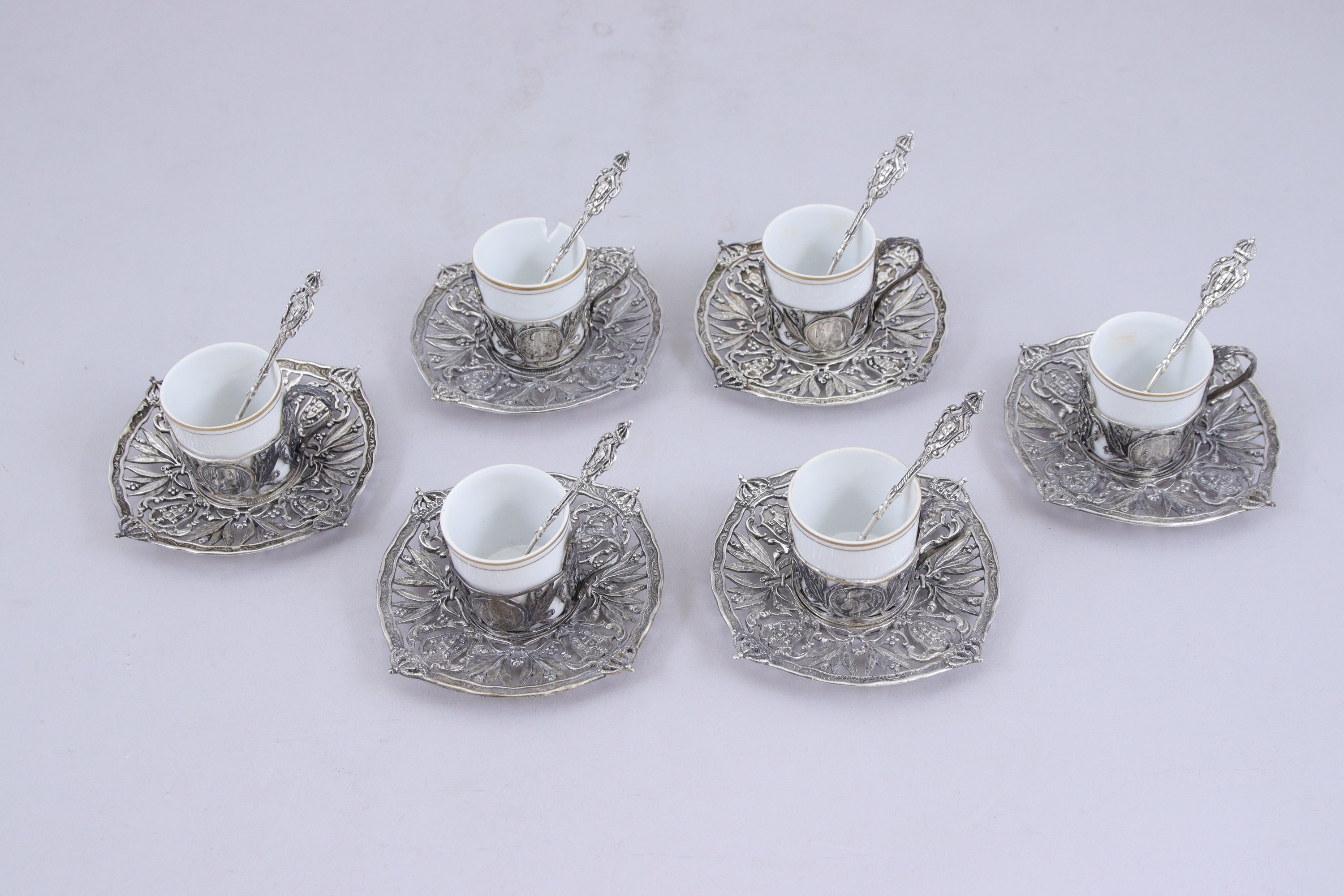 PORTUGAL, XIXe. SERVICE à MOKA aux ARMES ROYALES du PORTUGAL en argent comprenant six TASSES et SOUS-TASSES et six CUILLERS à MOKA, composé à partir de monnaies d'argent portugaises frappées entre 1811 et 1820 pour les sous-tasses et des années 1860 pour les tasses. Les tasses en porcelaine (l'une ébréchée).