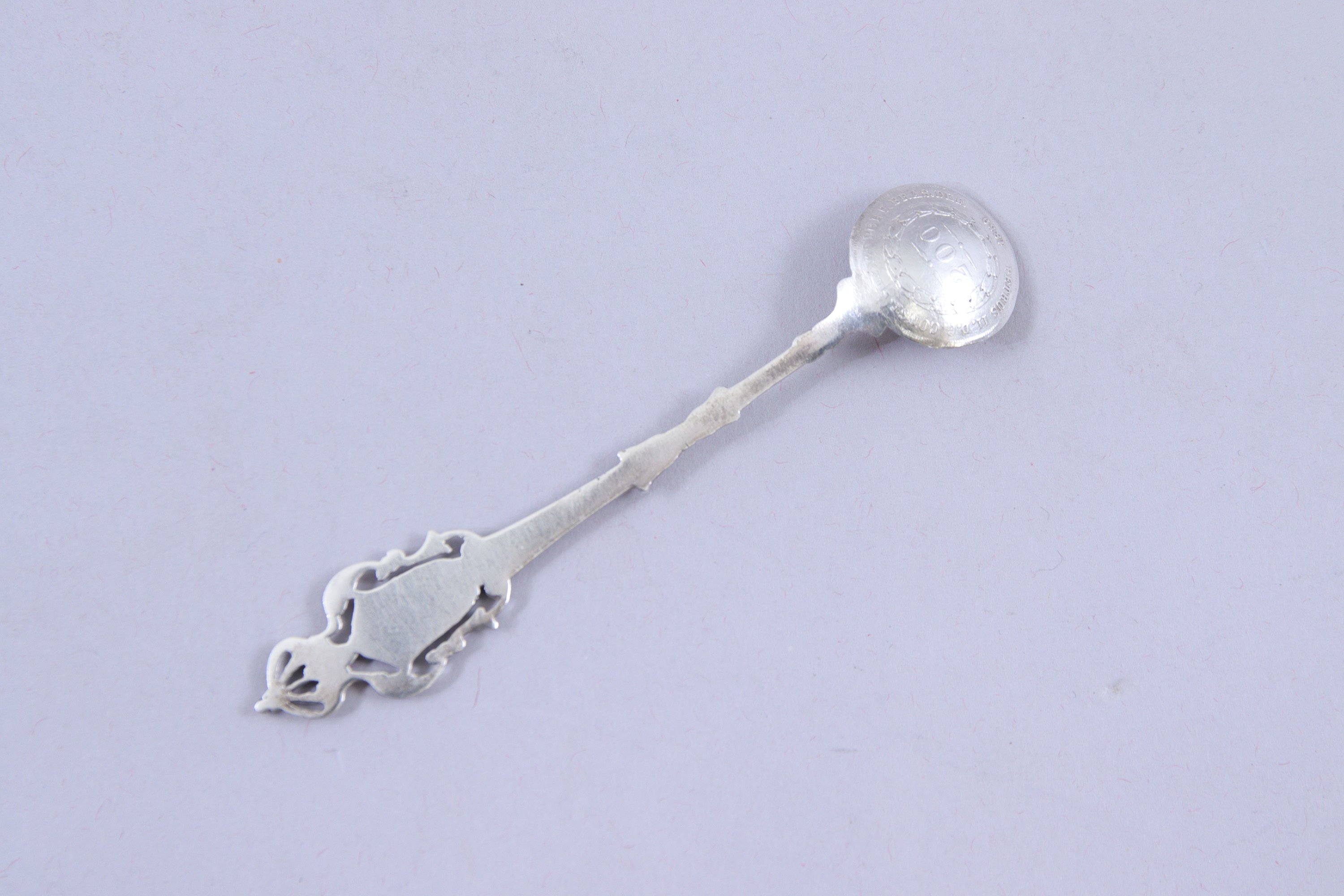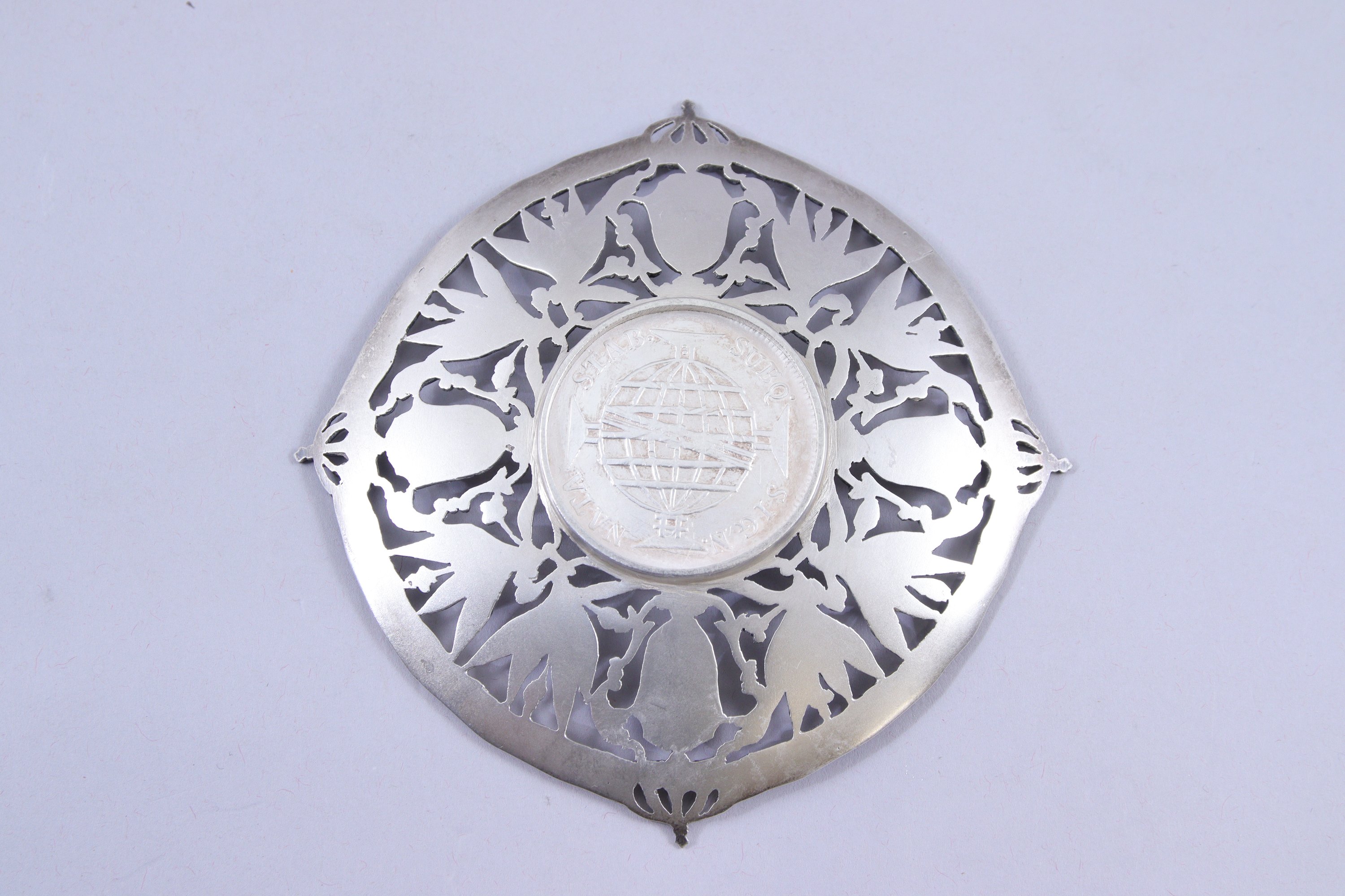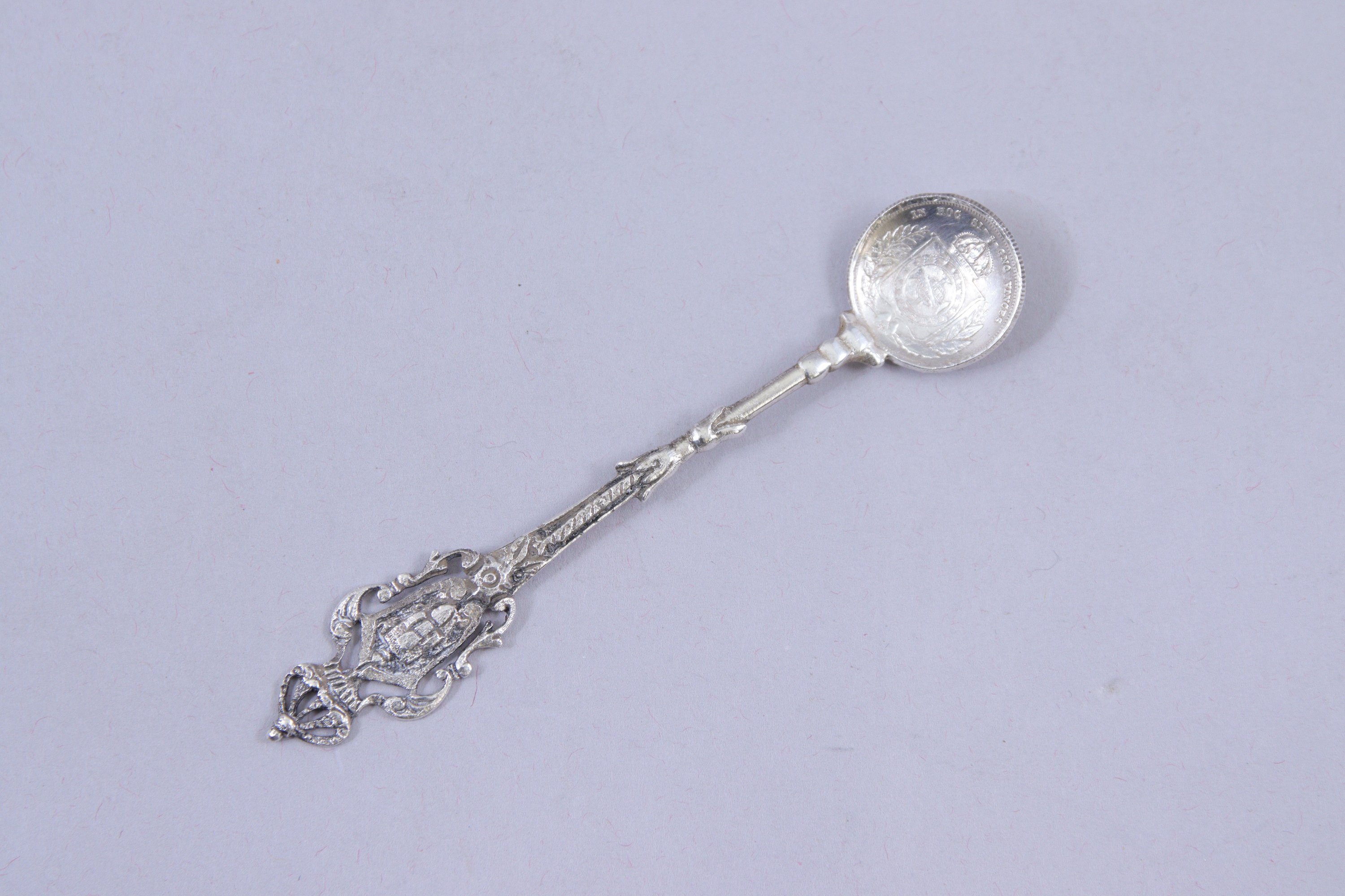 PORTUGAL, XIXe. SERVICE à MOKA aux ARMES ROYALES du PORTUGAL en argent comprenant six TASSES et SOUS-TASSES et six CUILLERS à MOKA, composé à partir de monnaies d'argent portugaises frappées entre 1811 et 1820 pour les sous-tasses et des années 1860 pour les tasses. Les tasses en porcelaine (l'une ébréchée).