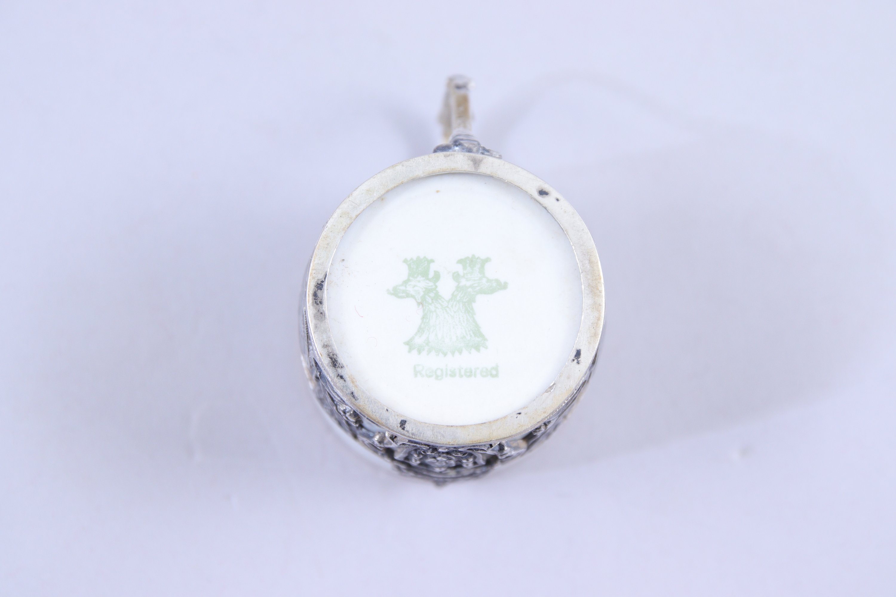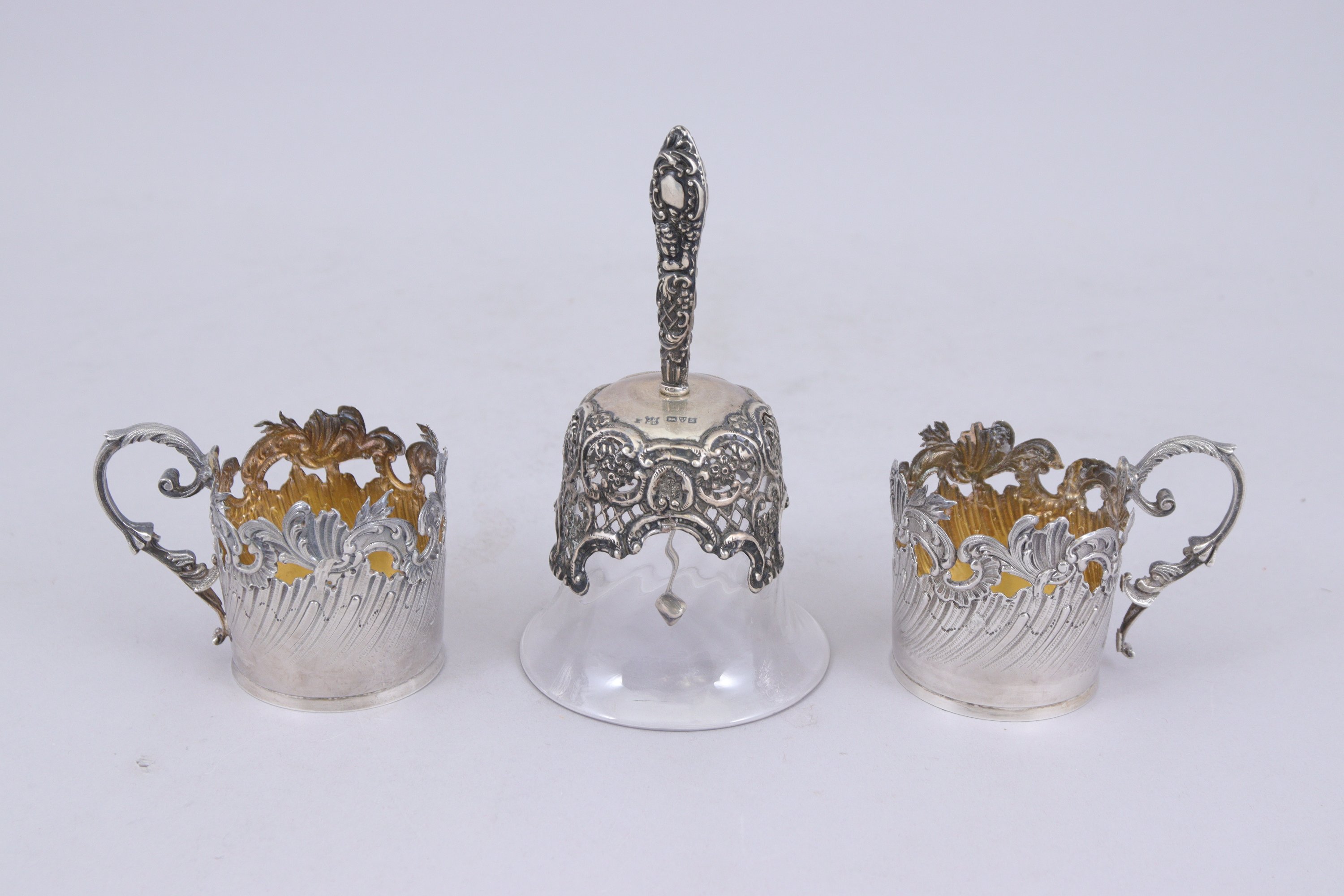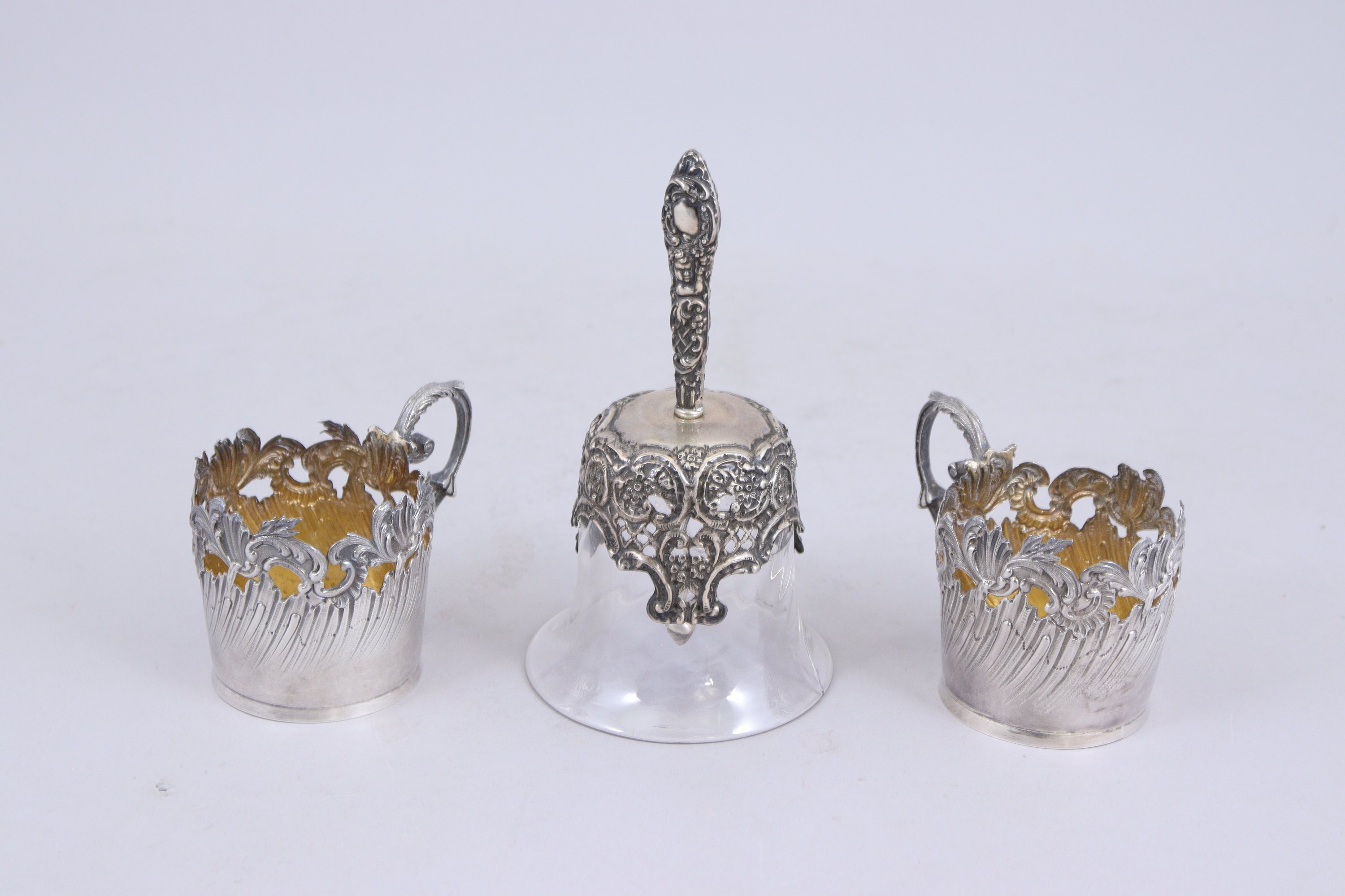 JOINTS: deux PORTE-TASSES en argent et une CLOCHE de SERVICE en argent et en verre (ébréché).