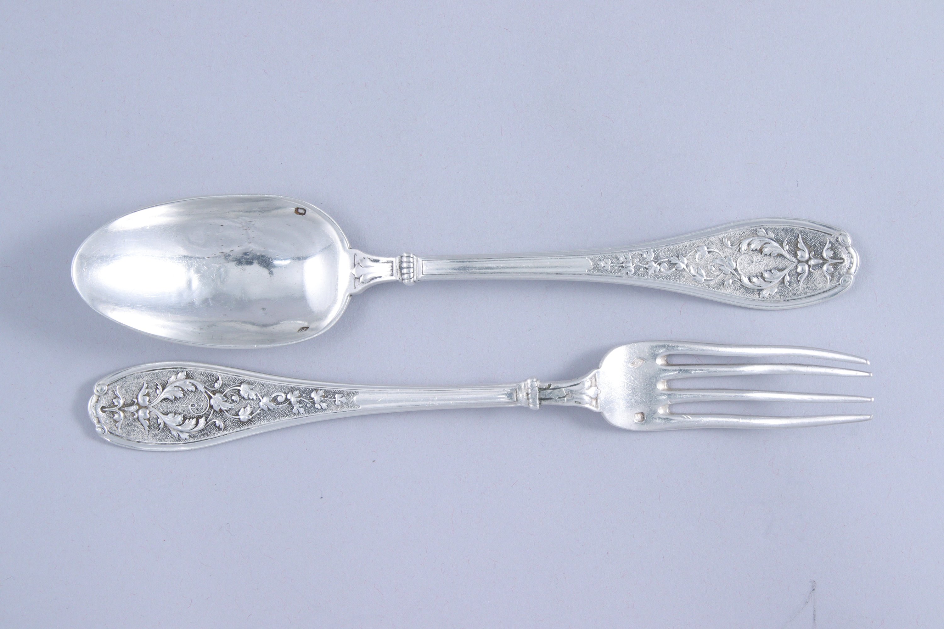 JOINT: COUVERT en argent à décor de guirlandes de rinceaux et en revers un masque grotesque. Monogrammé "PG". Poinçon Minerve. Maître-orfèvre: "HCr" Poids Poids net 105 g.