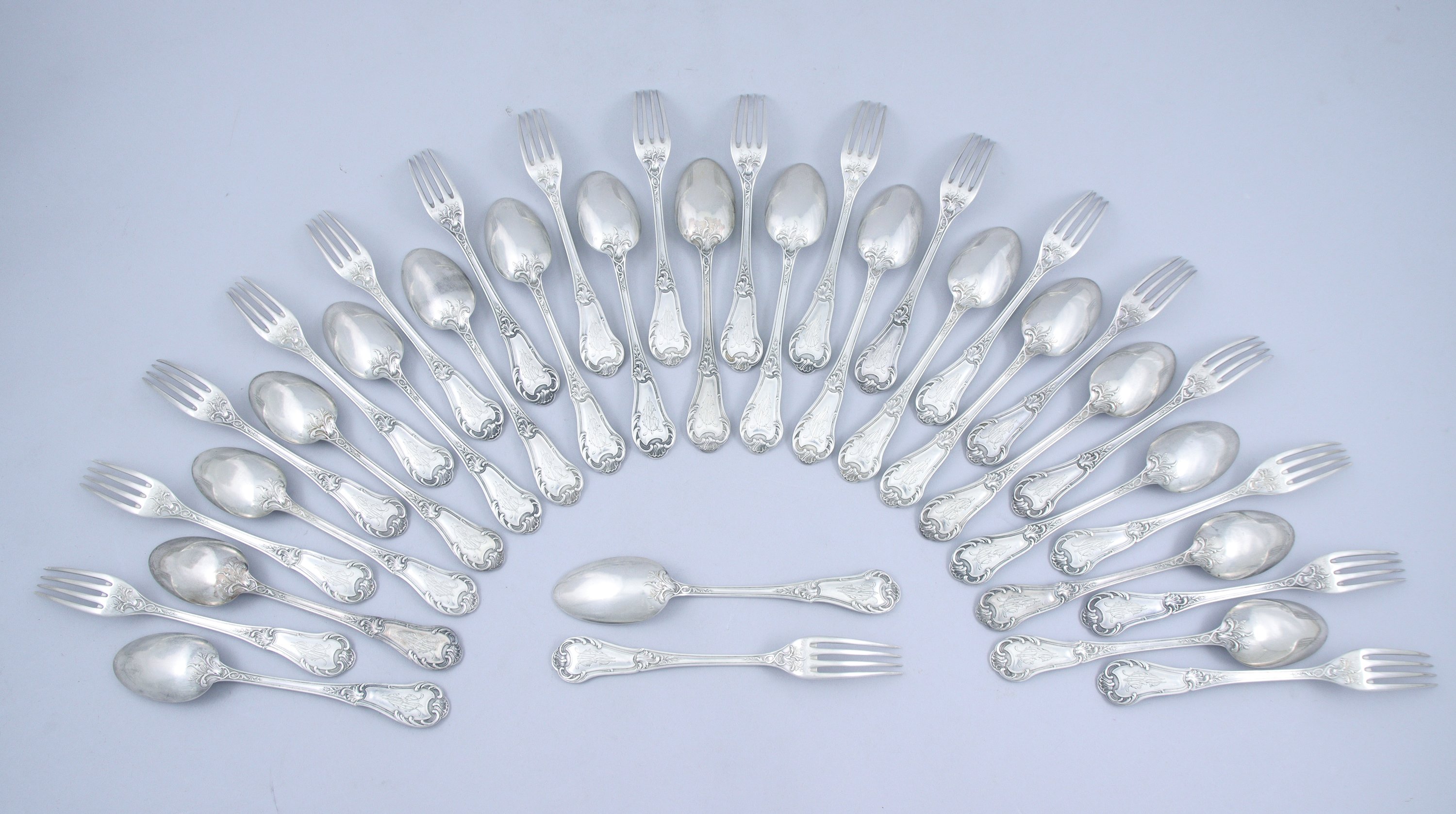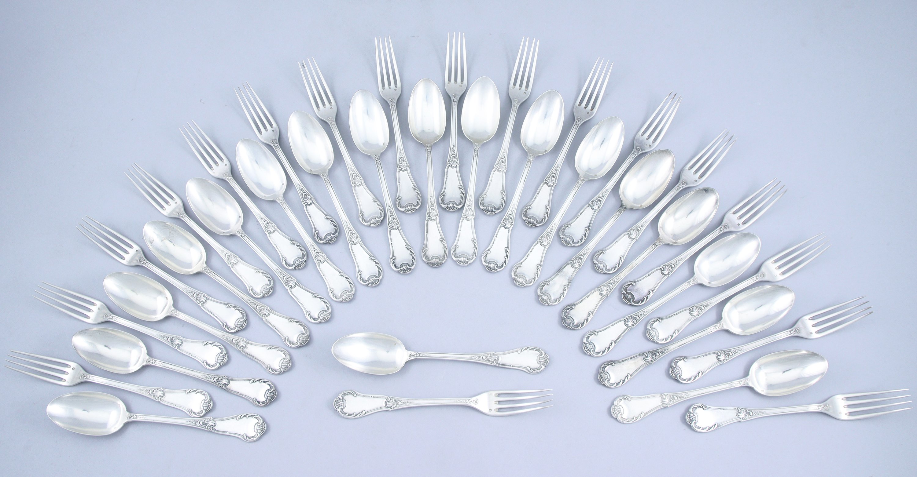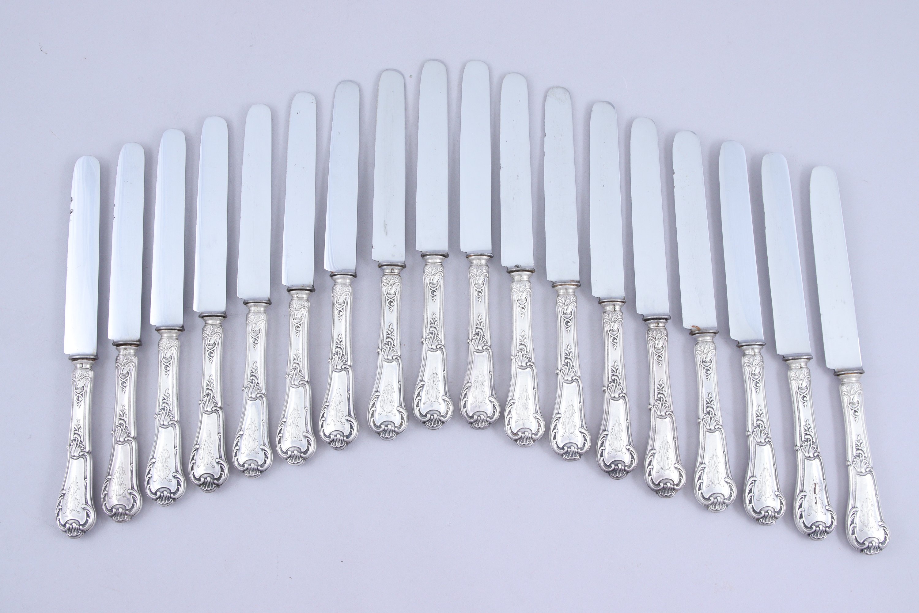 MÉNAGÈRE de SOIXANTE-DOUZE pièces en argent à motifs agrafes et feuillage, monogrammée CM, comprenant DIX-HUIT GRANDS COUVERTS, DIX-HUIT GRANDS COUTEAUX (manche en argent fourré), SIX COUVERTS à DESSERT, SIX COUTEAUX à FROMAGE ET SIX COUTEAUX à FRUIT lame argent (manches en argent fourré)