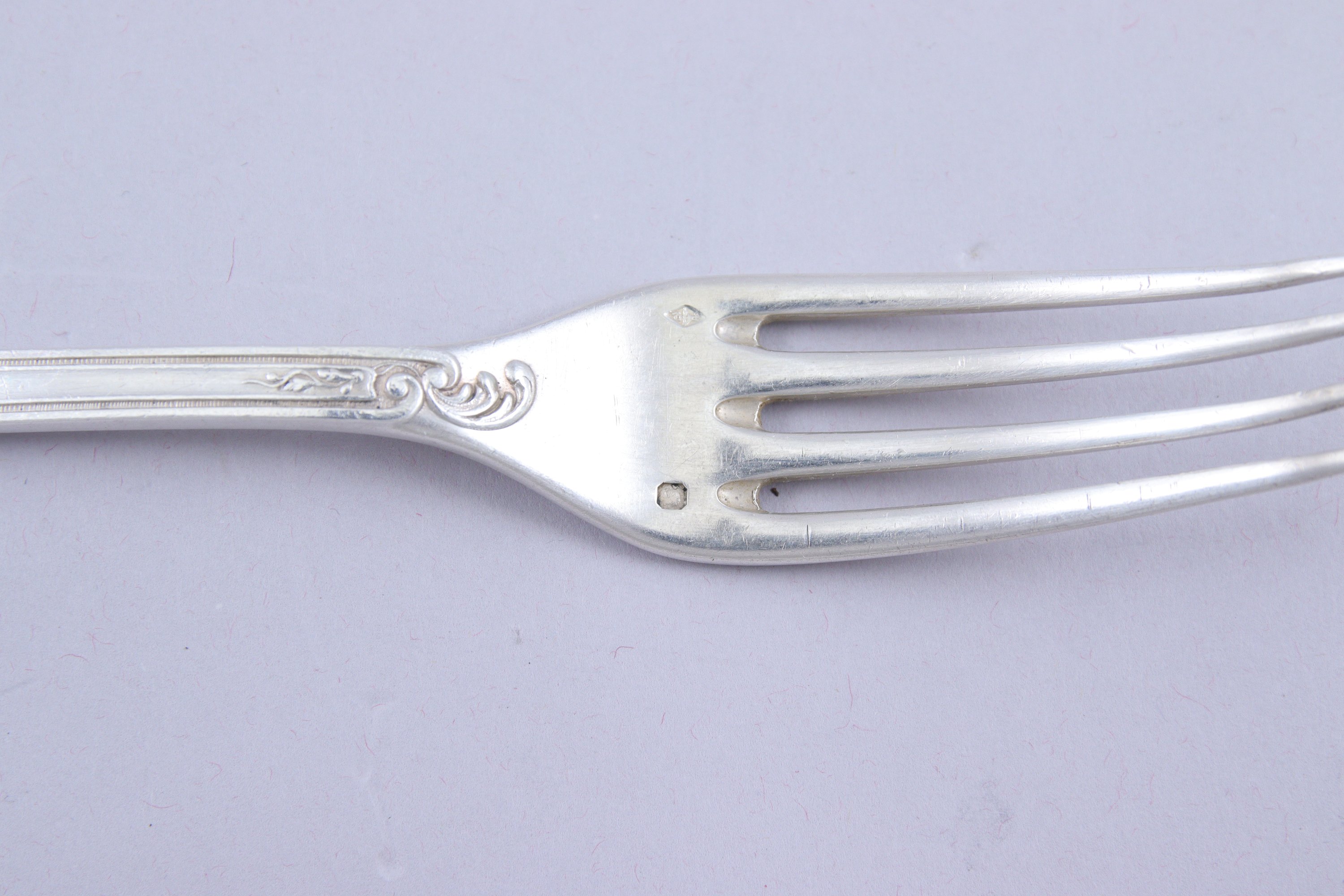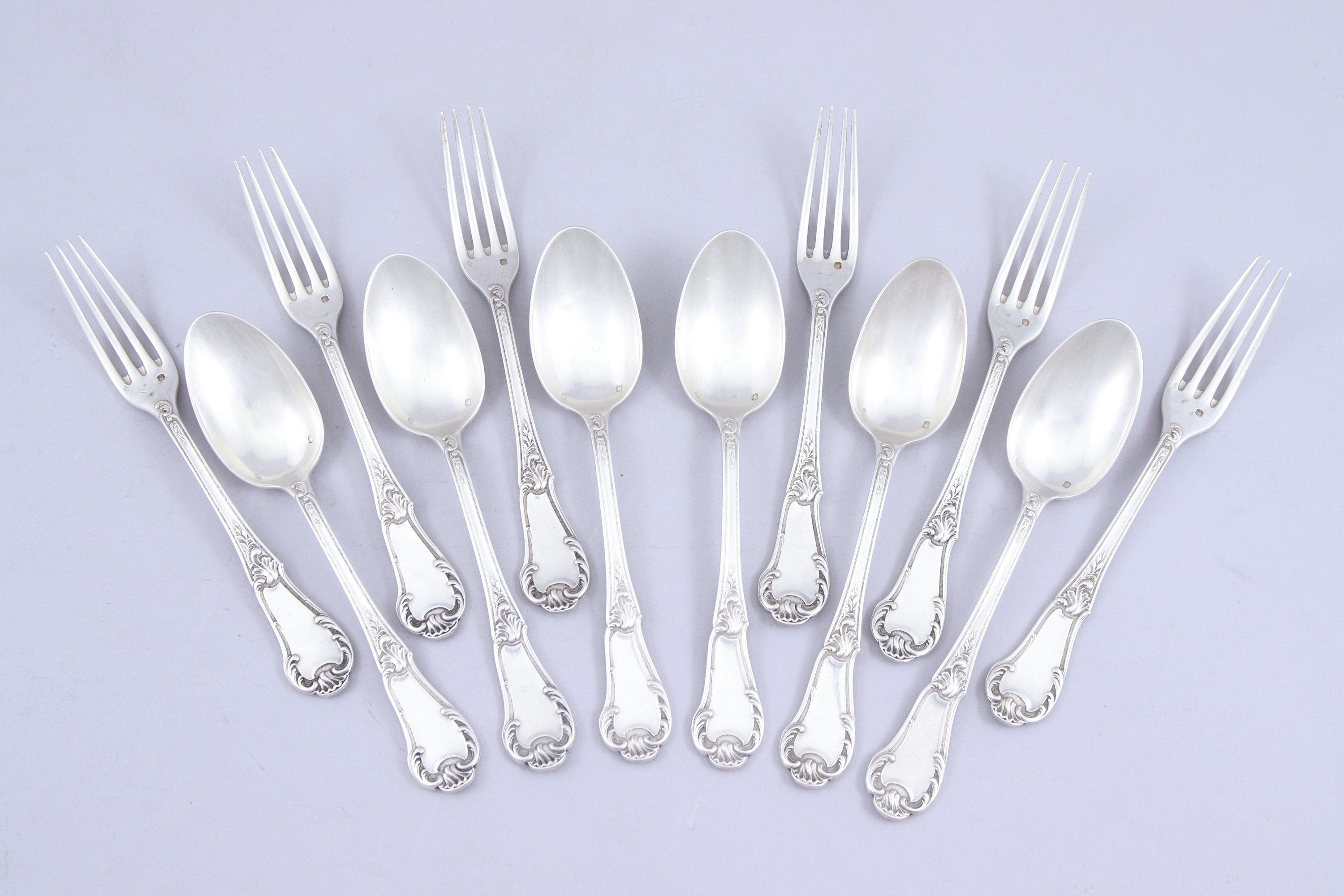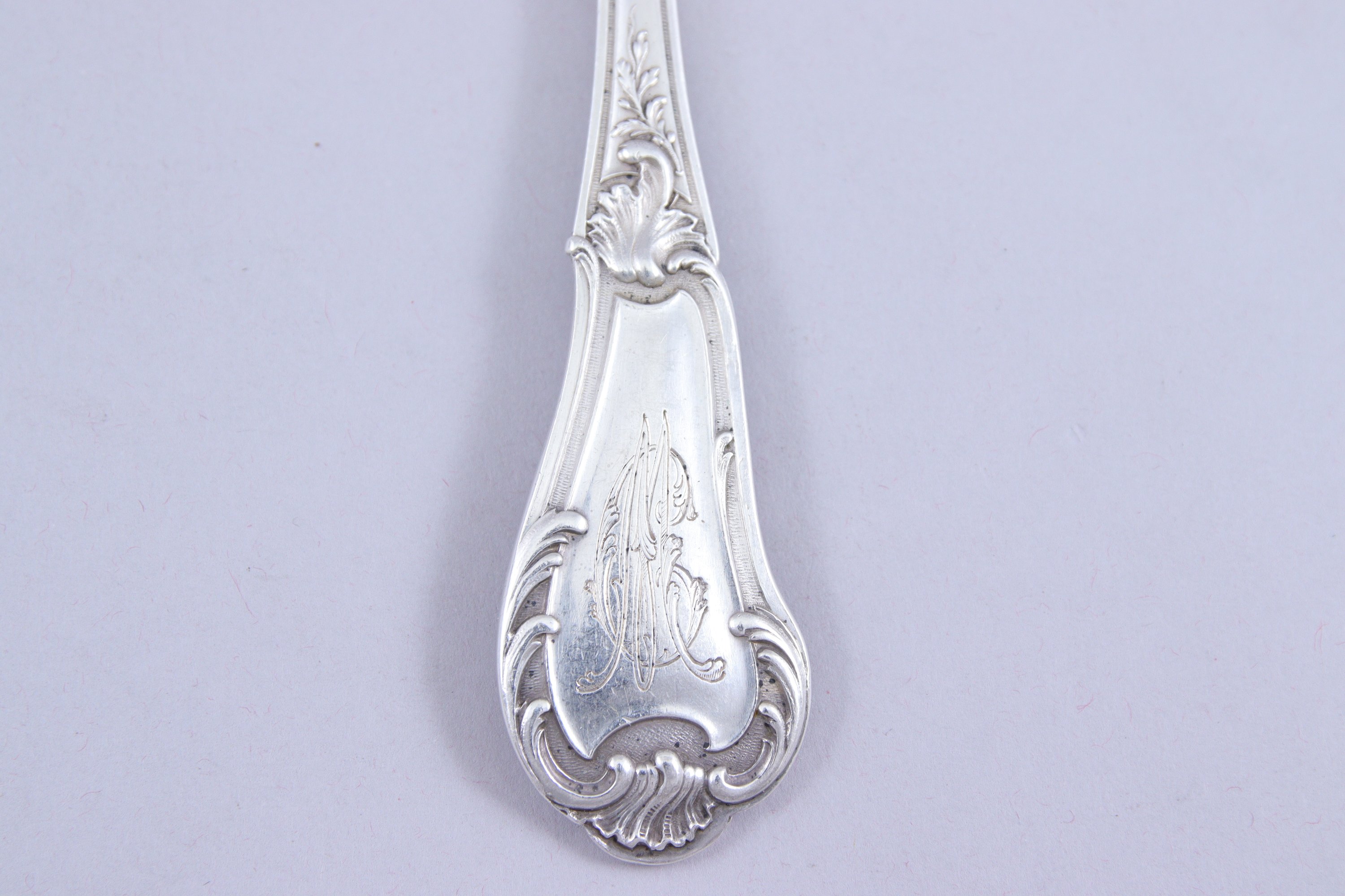 MÉNAGÈRE de SOIXANTE-DOUZE pièces en argent à motifs agrafes et feuillage, monogrammée CM, comprenant DIX-HUIT GRANDS COUVERTS, DIX-HUIT GRANDS COUTEAUX (manche en argent fourré), SIX COUVERTS à DESSERT, SIX COUTEAUX à FROMAGE ET SIX COUTEAUX à FRUIT lame argent (manches en argent fourré)