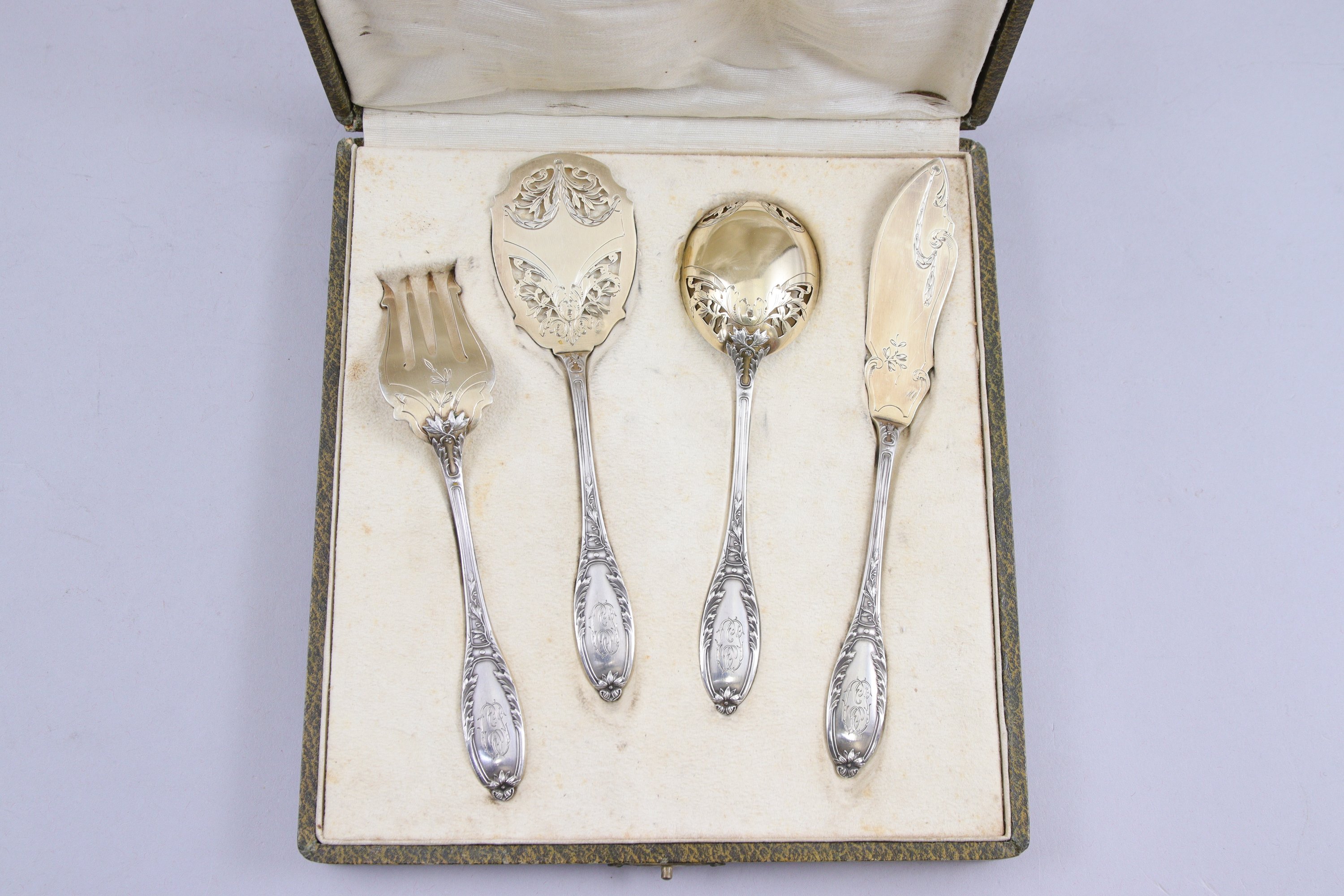 JOINT: SERVICE à ENTREMETS en argent aux spatules vermeillées comprenant quatre pièces. Dans un écrin. Poids: 157 g.