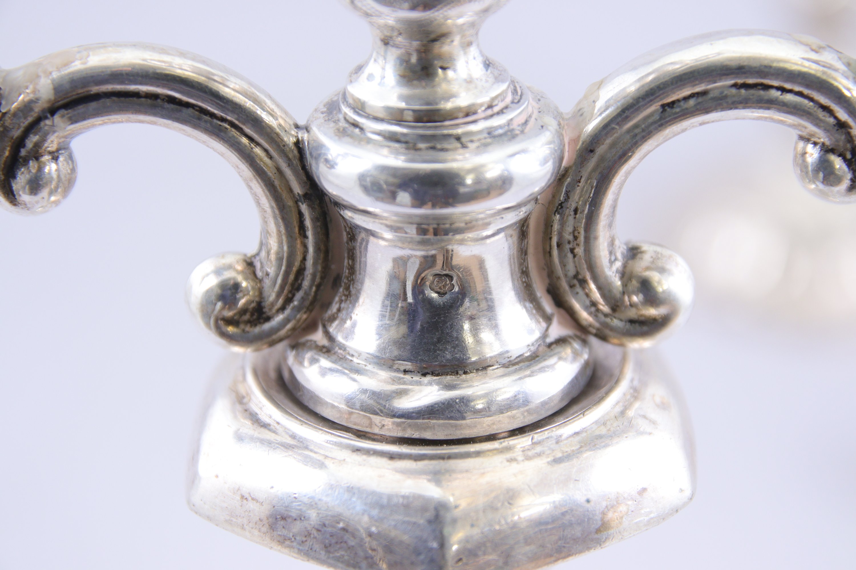 AUTRICHE-HONGRIE. PAIRE de FLAMBEAUX à 3 lumières en argent. Bases chantournées et fûts balustres à pans coupés. Décor en amati et guilloché