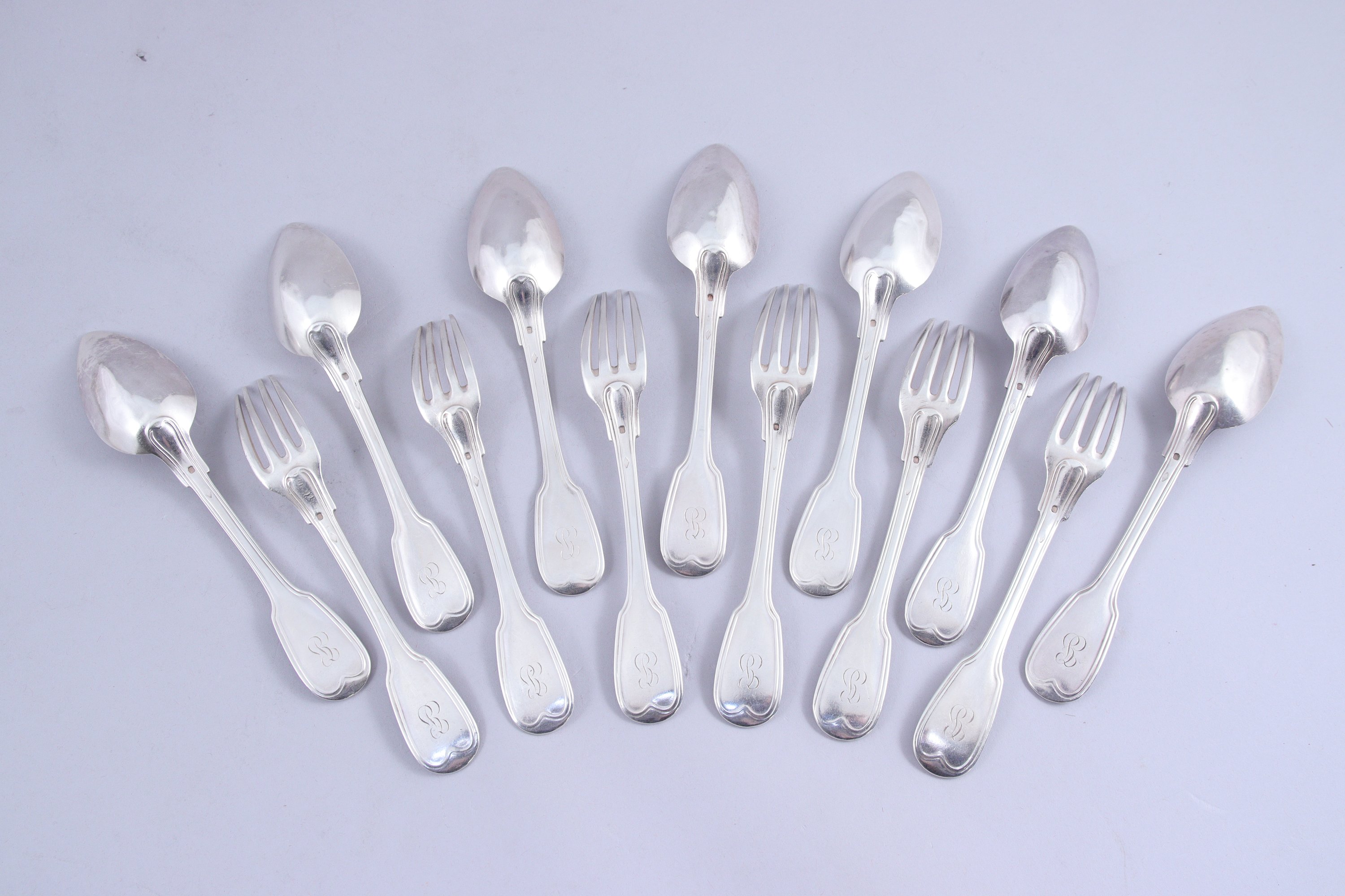MÉNAGÈRE de table argent, modèle filet, initiales., comprenant TREIZE pièces: SIX COUVERTS et UNE CUILLER de TABLE.