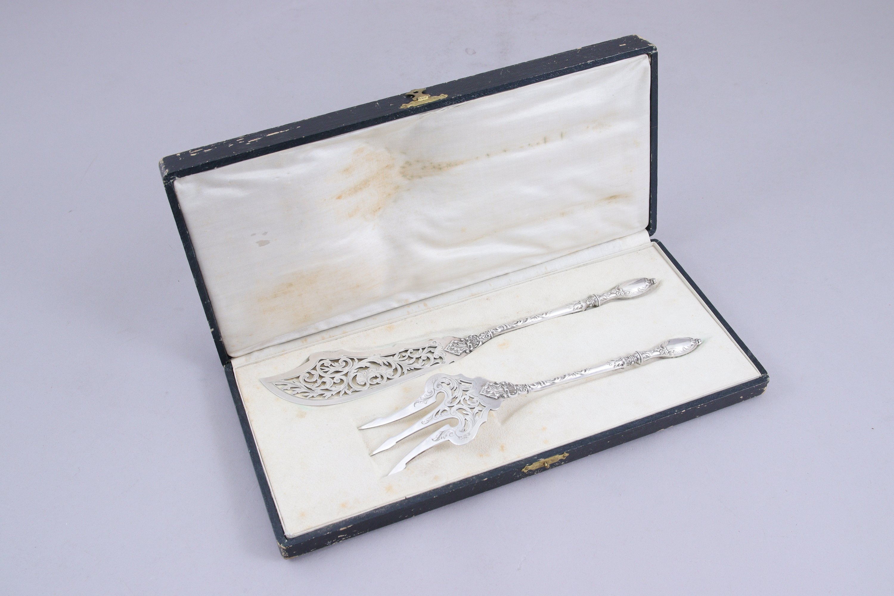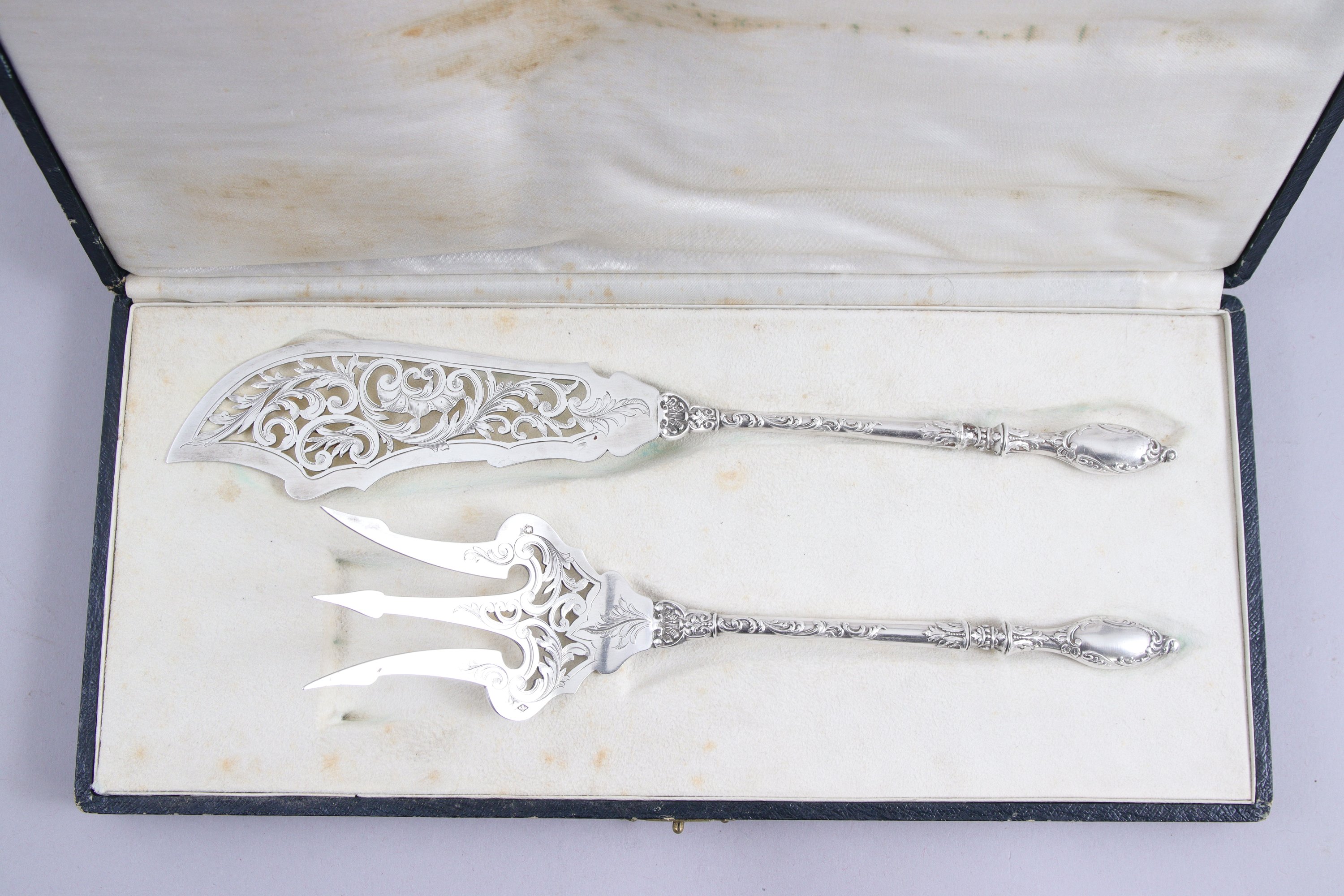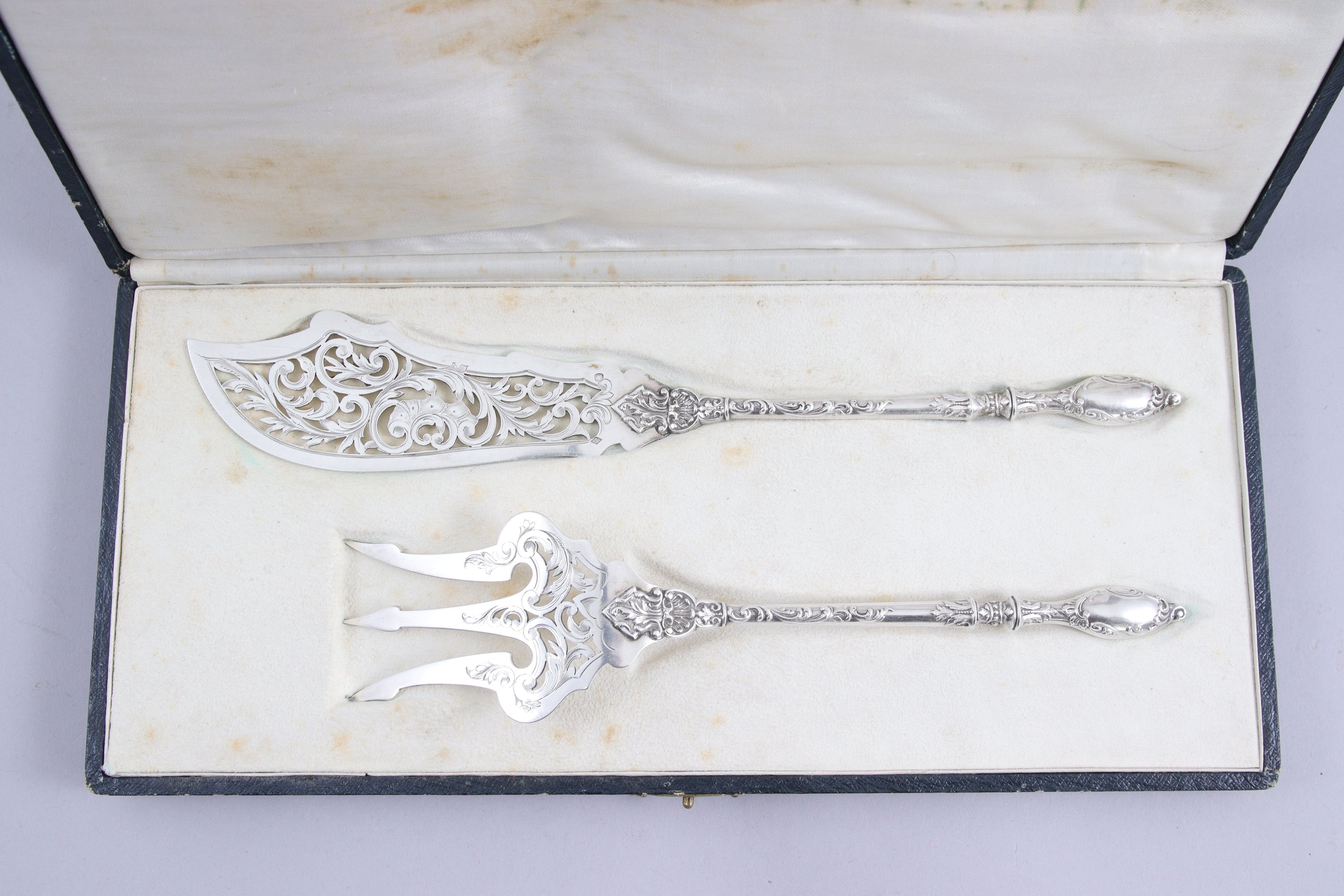 SERVICE à POISSON en argent de style rocaille (écrin de forme en peau et soie crème).