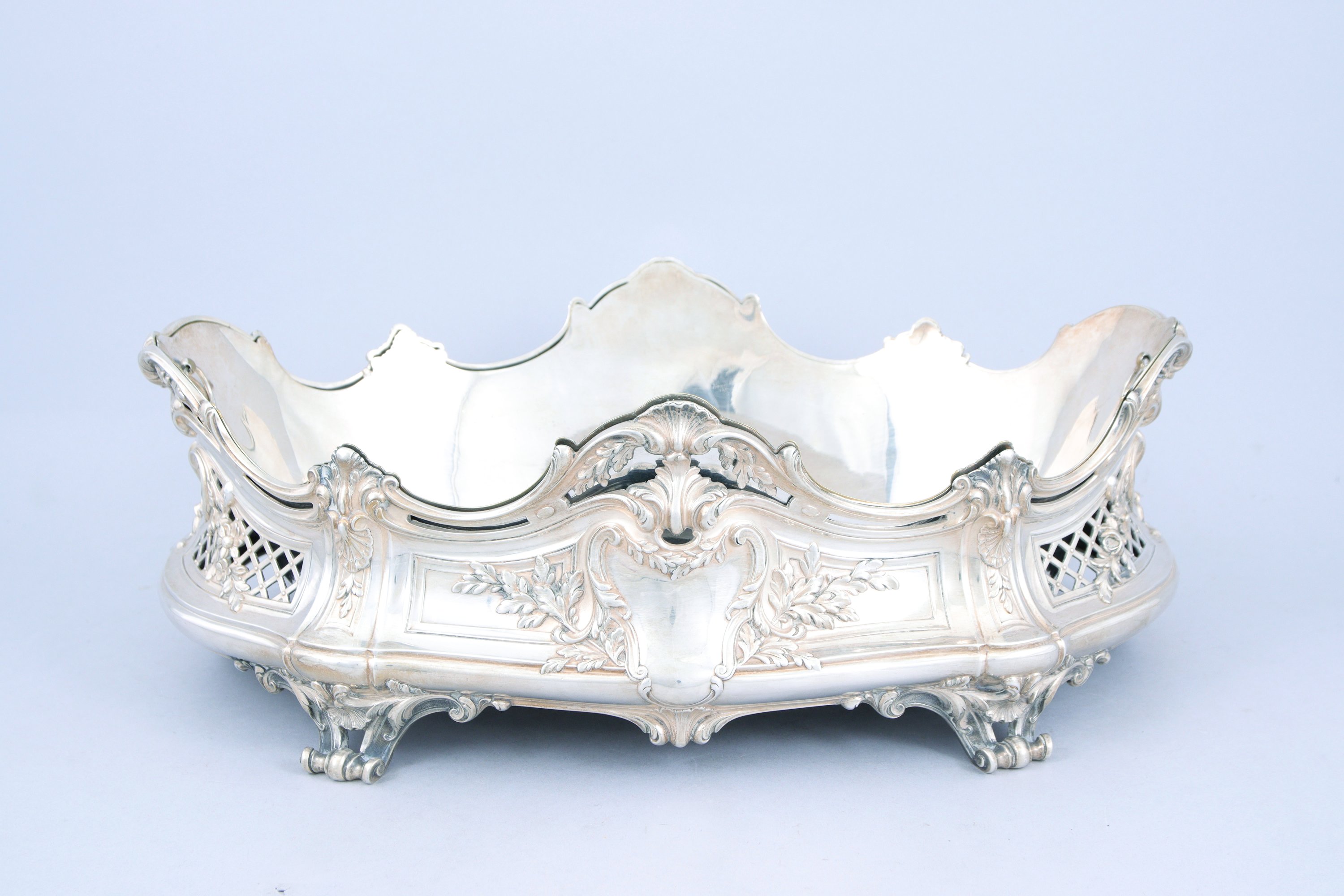 La jardinière ajourée est ornée de cartouches, coquilles, bouquets et chutes feuillagées. Elle repose sur quatre pieds à enroulements chantournés.