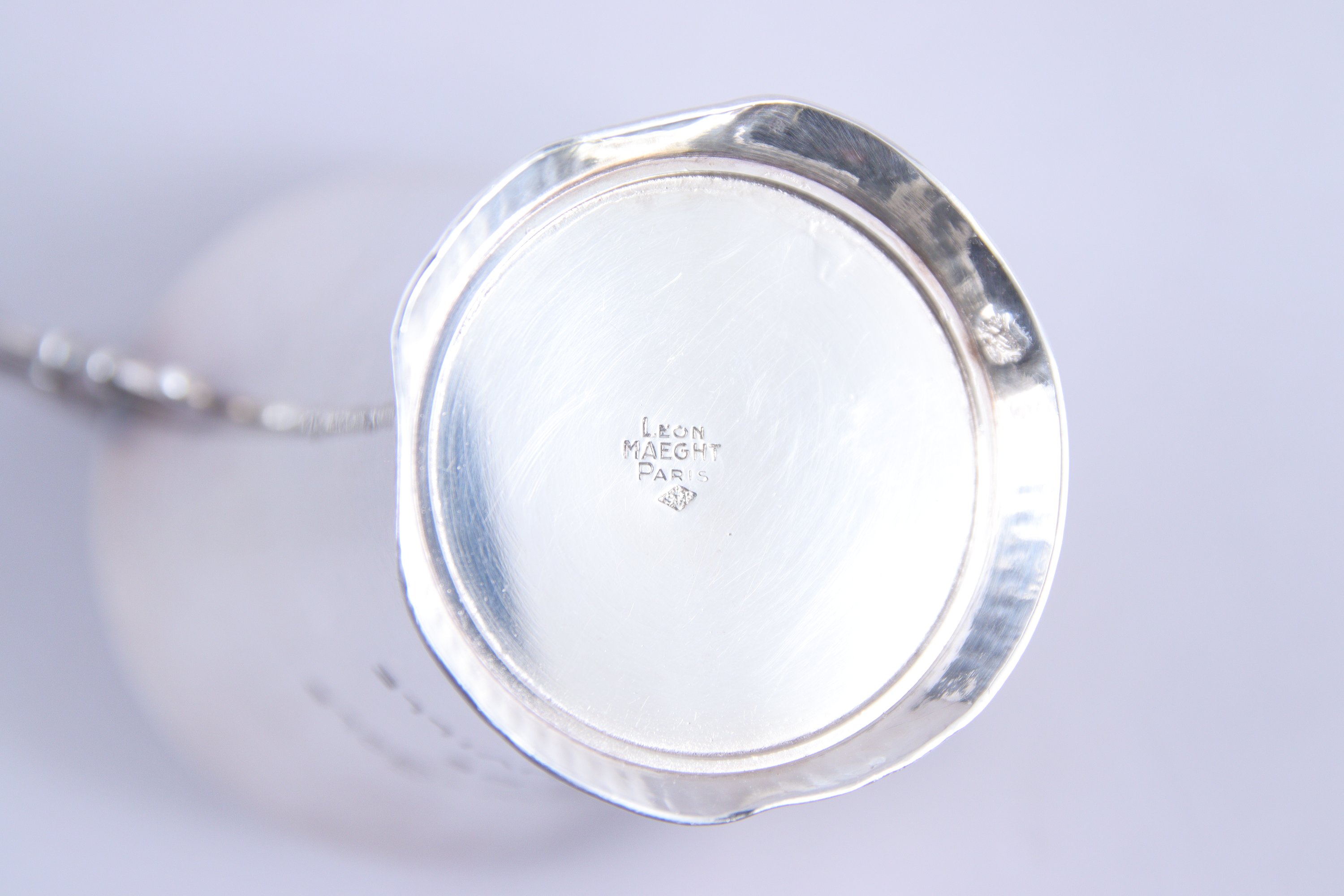 - Petite COUPE à anse en enroulement. Marquée sur la panse New-Golf de Deauville. Poinçon Minerve. Au revers, inscrit Léon Maeght. Haut. 8,5 cm. Poids 55g. (manque une anse).