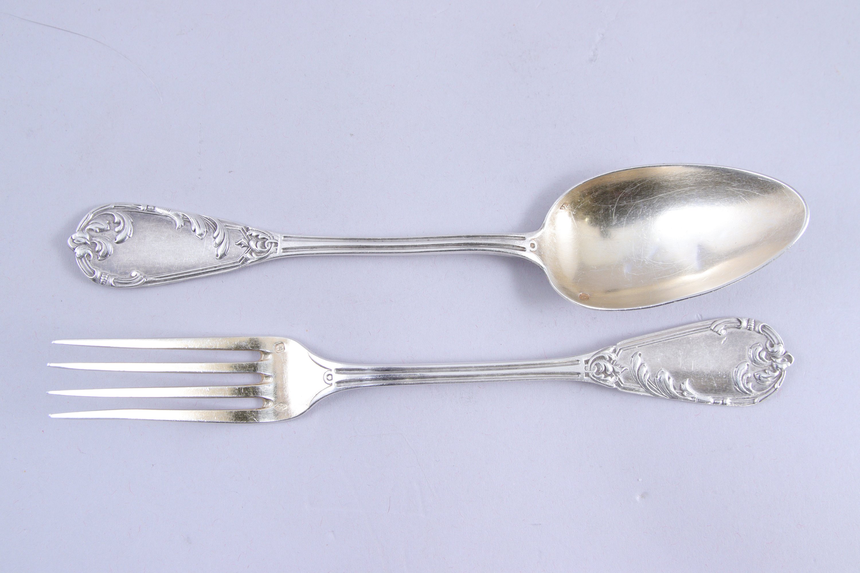 JOINT: Un COUVERT en argent à décor rocaille composé de rinceaux. Poinçon Minerve. Poids 100 g.