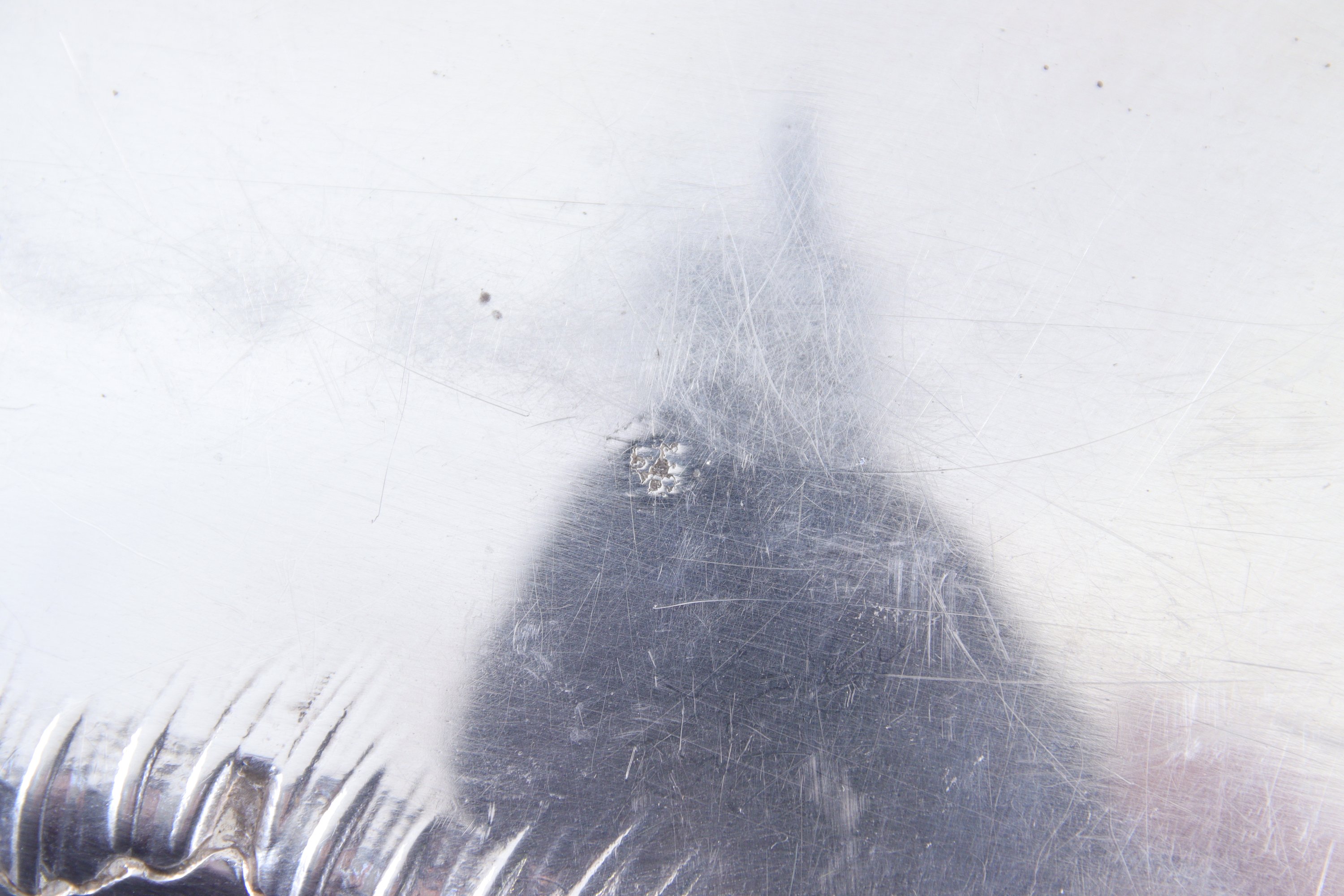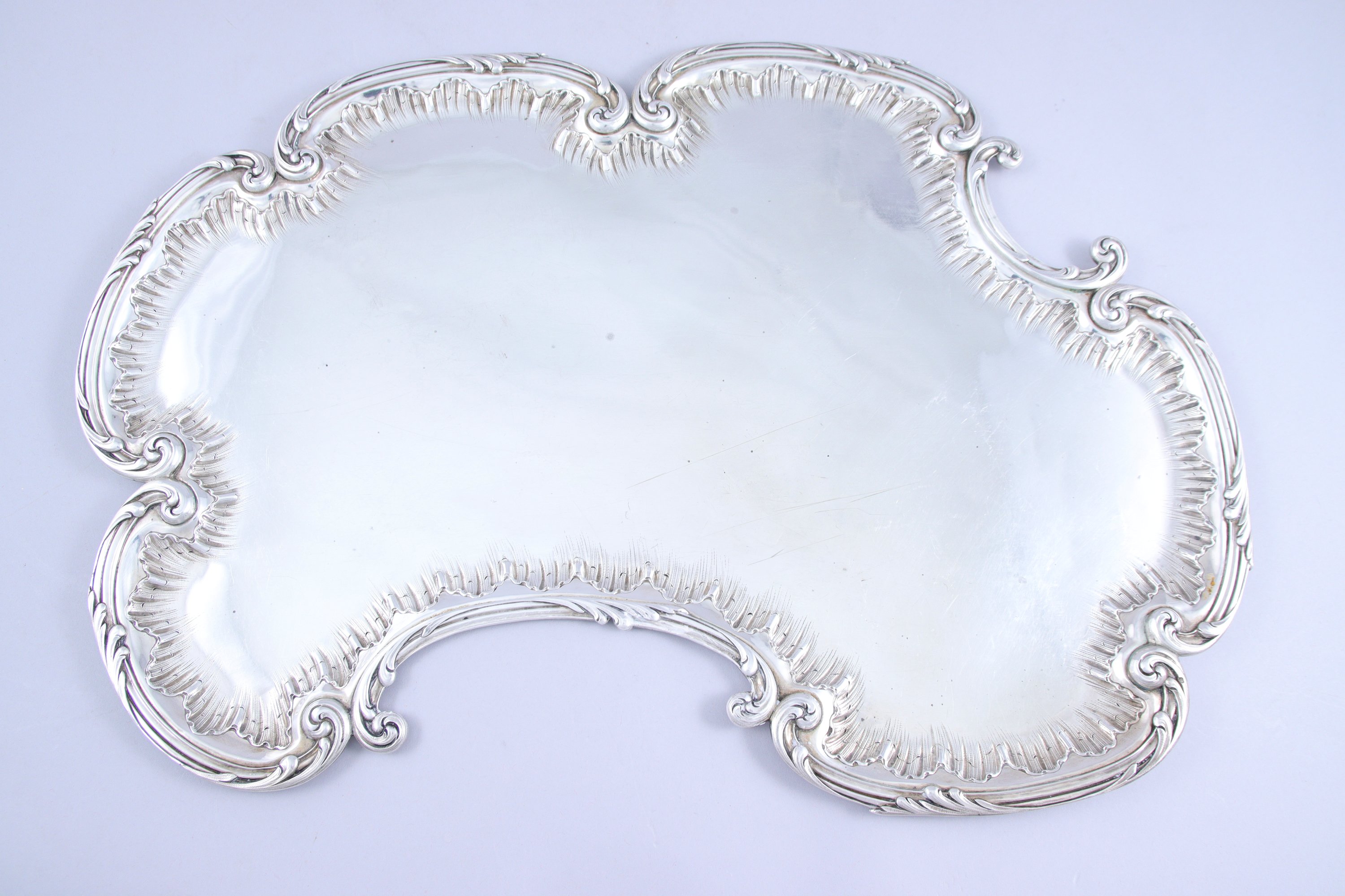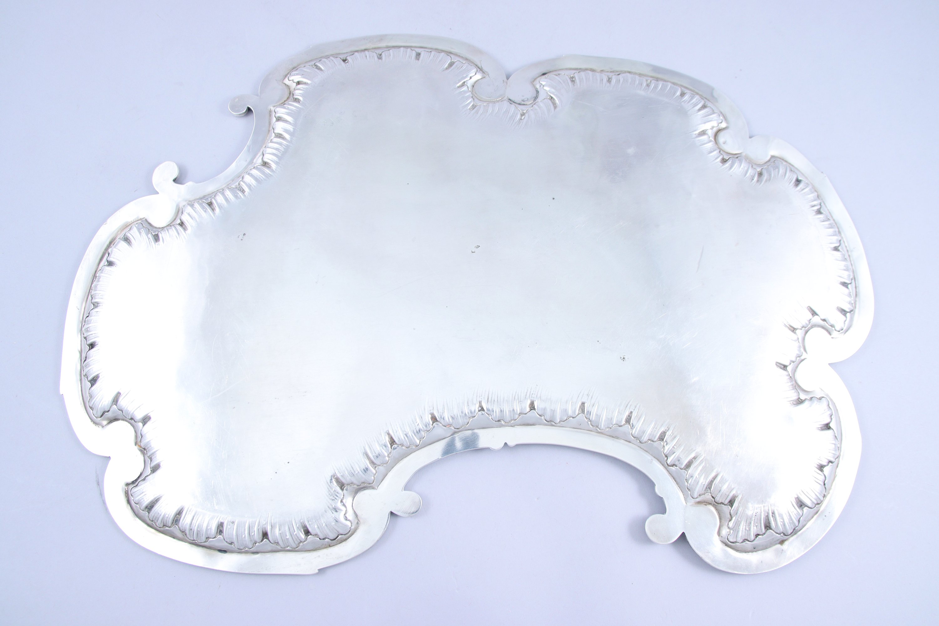 PLATEAU en argent de forme polylobée à décor rocaille comme enroulements, feuillages et feuilles d'eau.