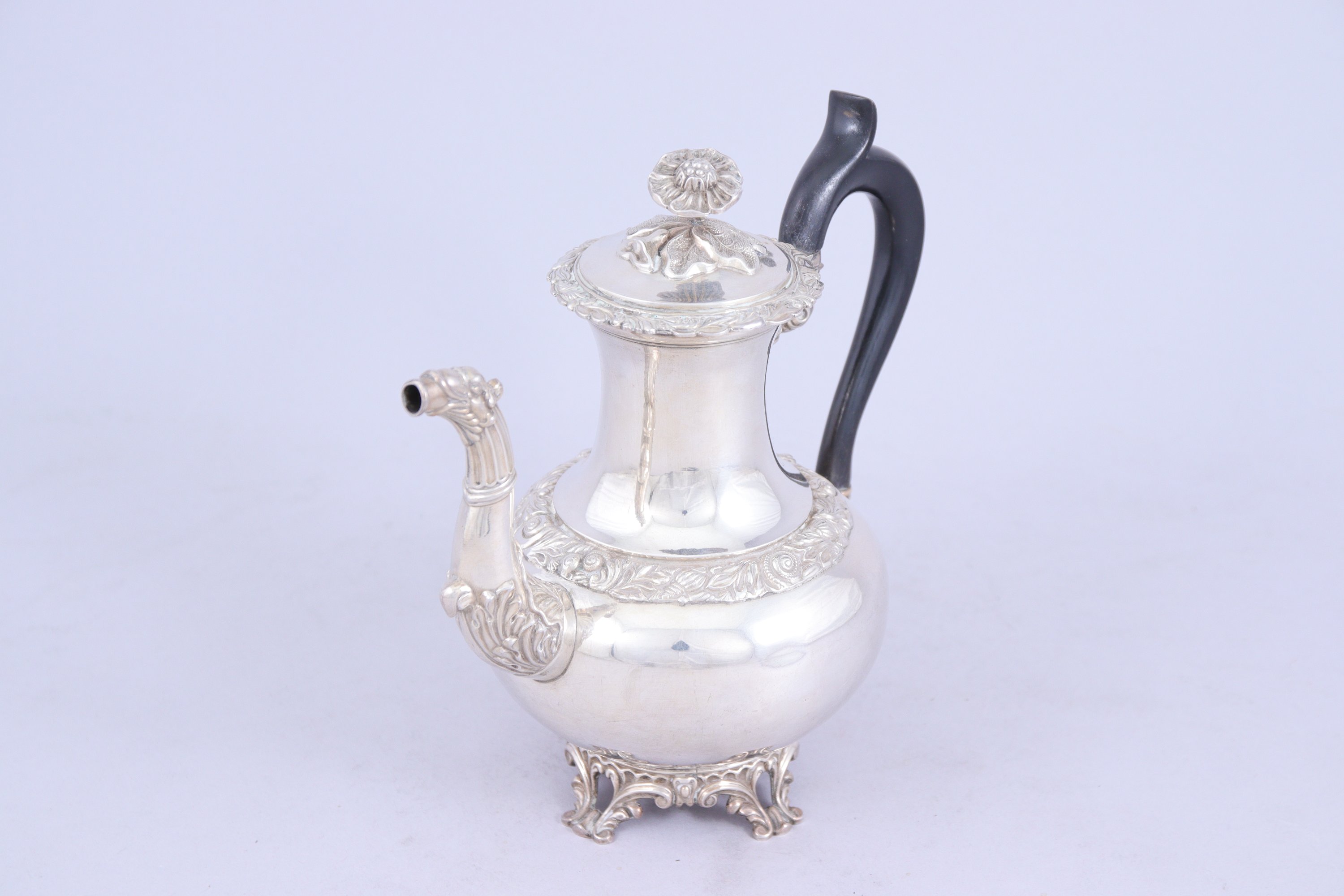 THÉIÈRE en argent, au décor feuillagé en registre. Fretel en forme de fleur épanouie. Bec verseur prenant la forme d'un bec de volatile. Anse en bois noirci.