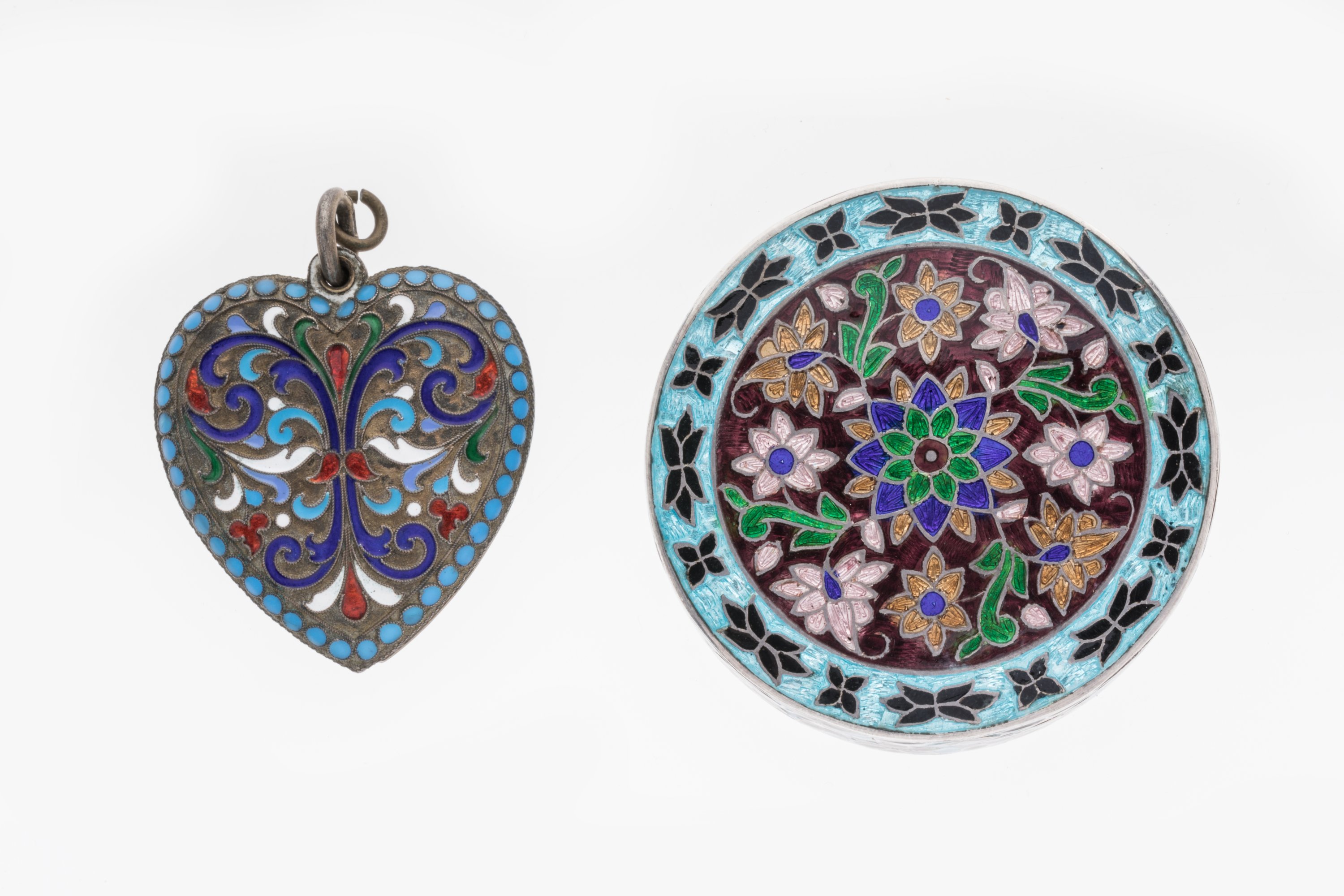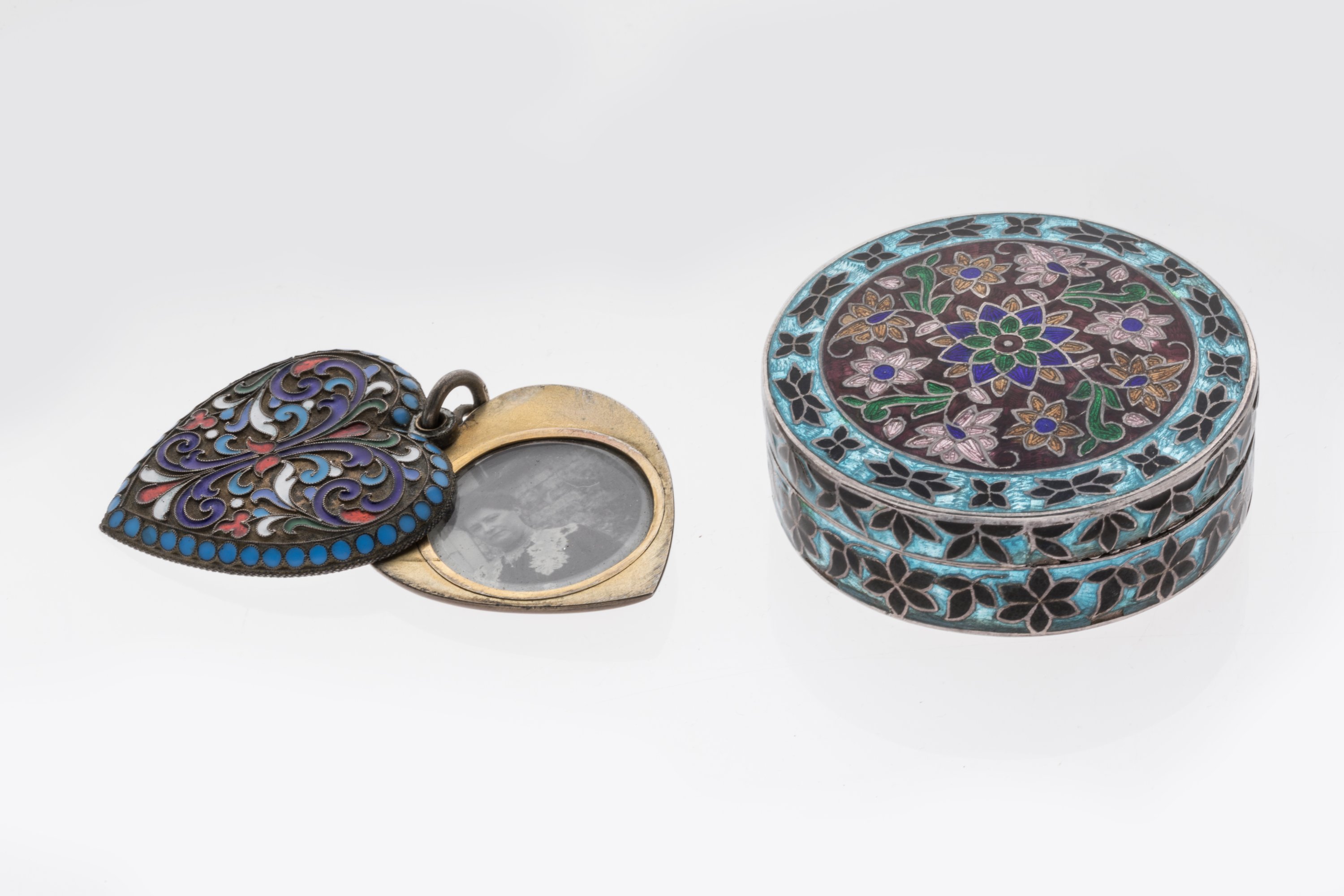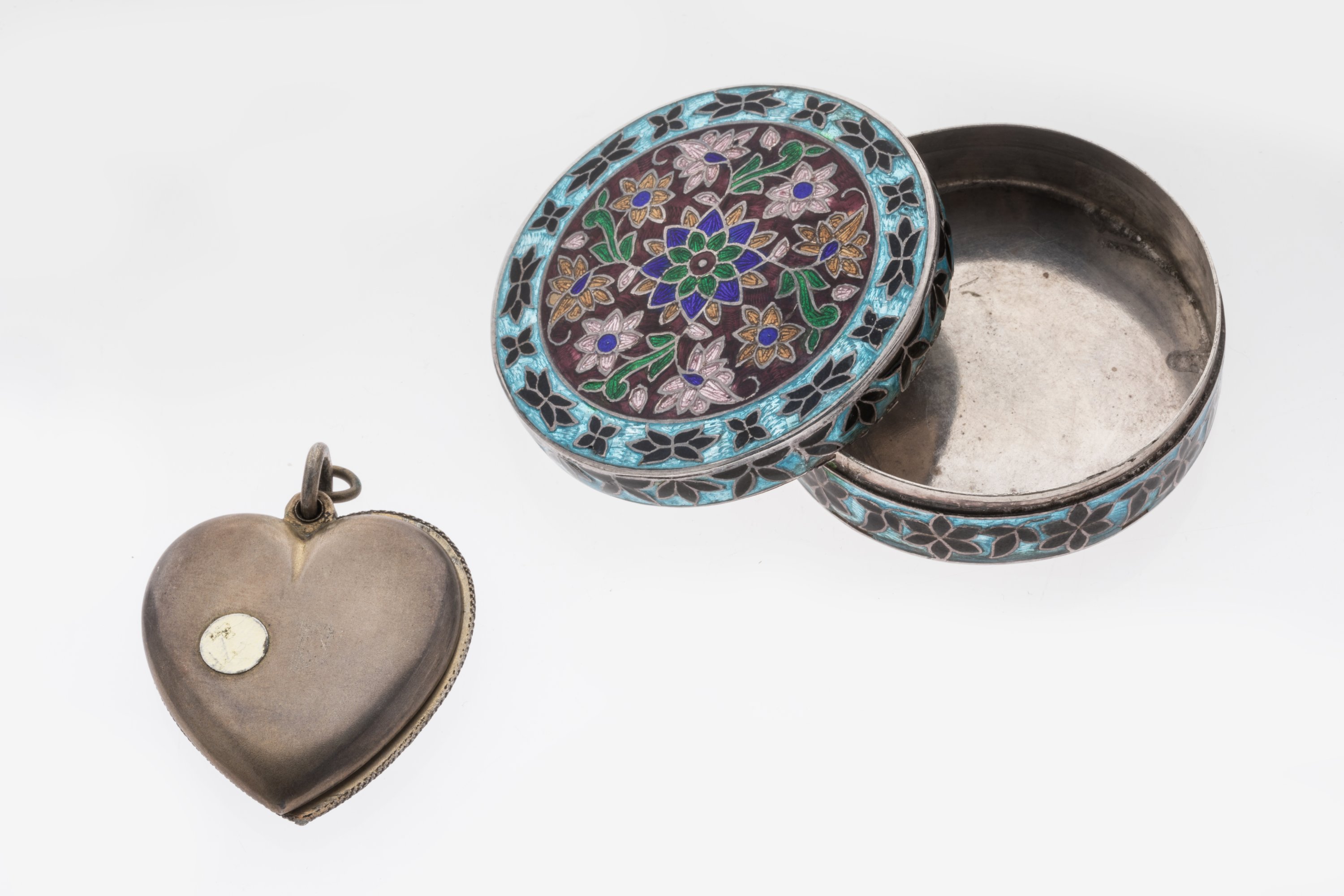 RUSSIE. PORTE PHOTO en argent émaillé en forme de cur orné d'entrelacs. Le boîtier pivotant pour découvrir un cadre circulaire vitré.