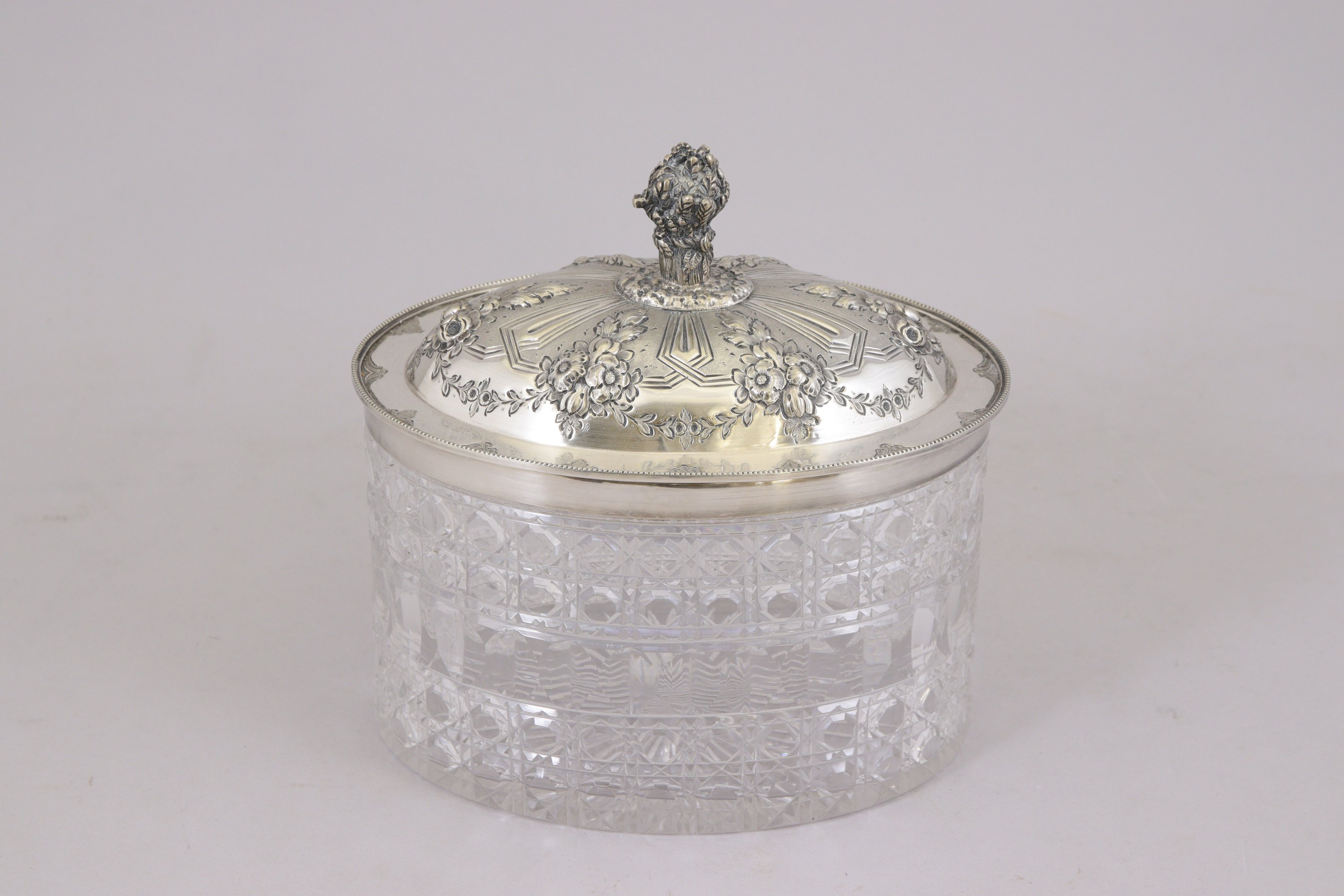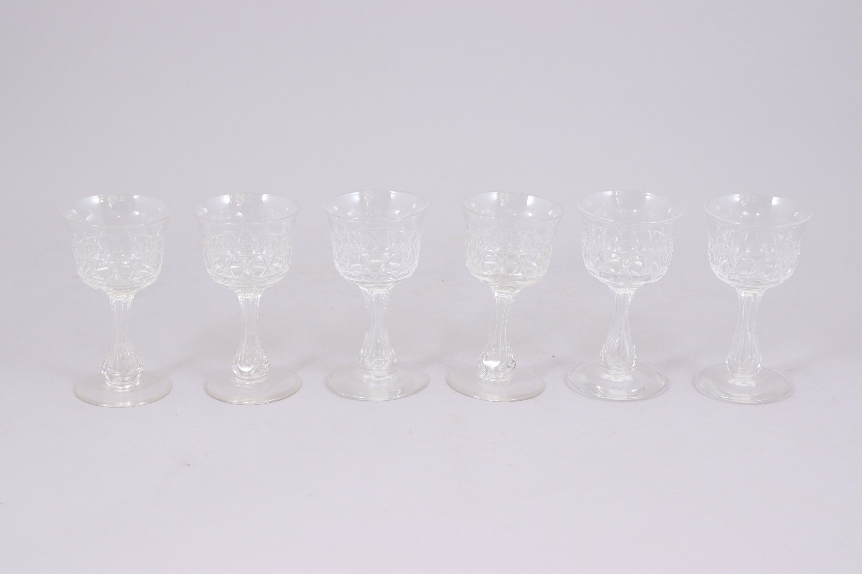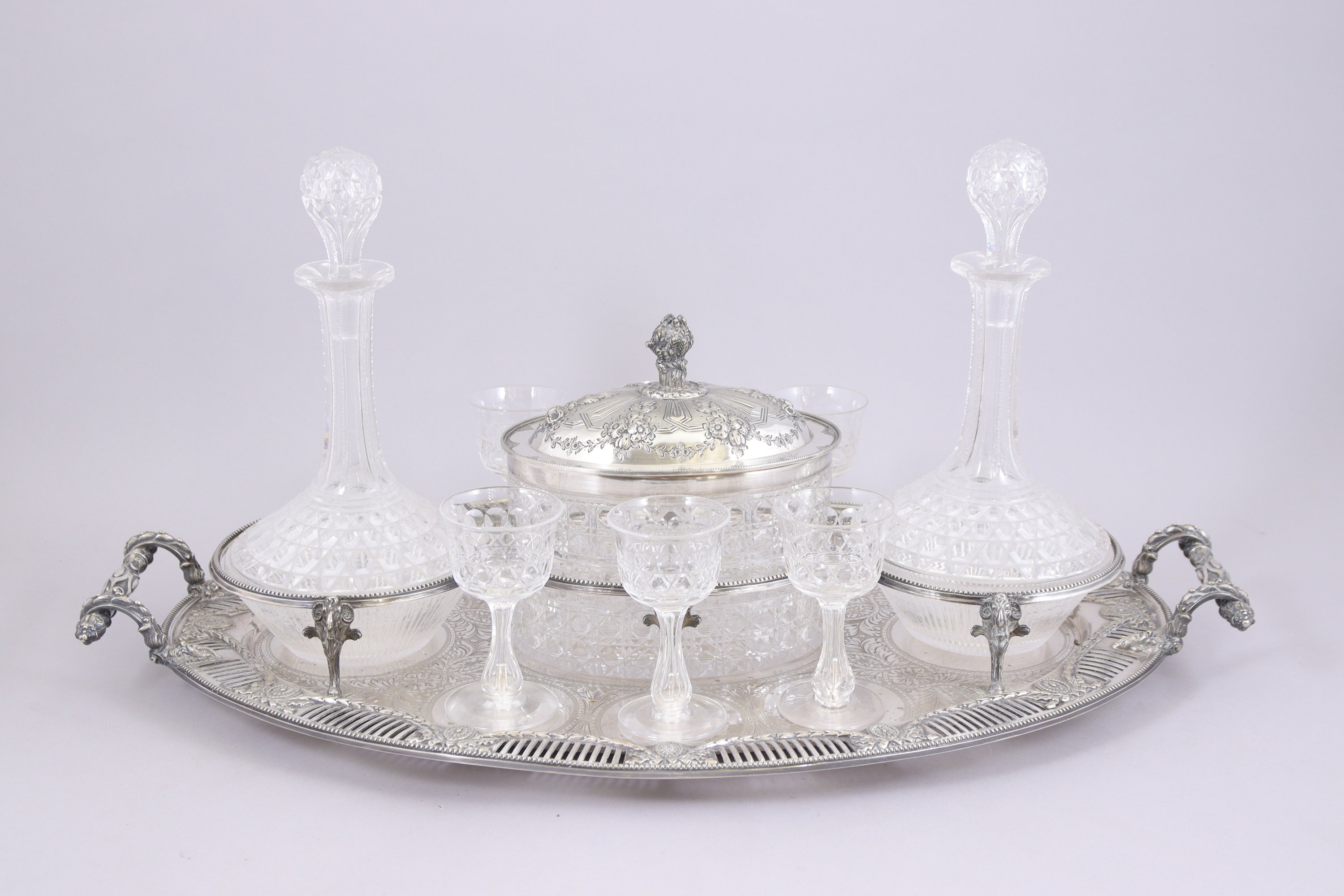 à décor néoclassique de guirlandes et têtes de bélier recevant deux carafes, une boîte à biscuit et six verres en cristal.