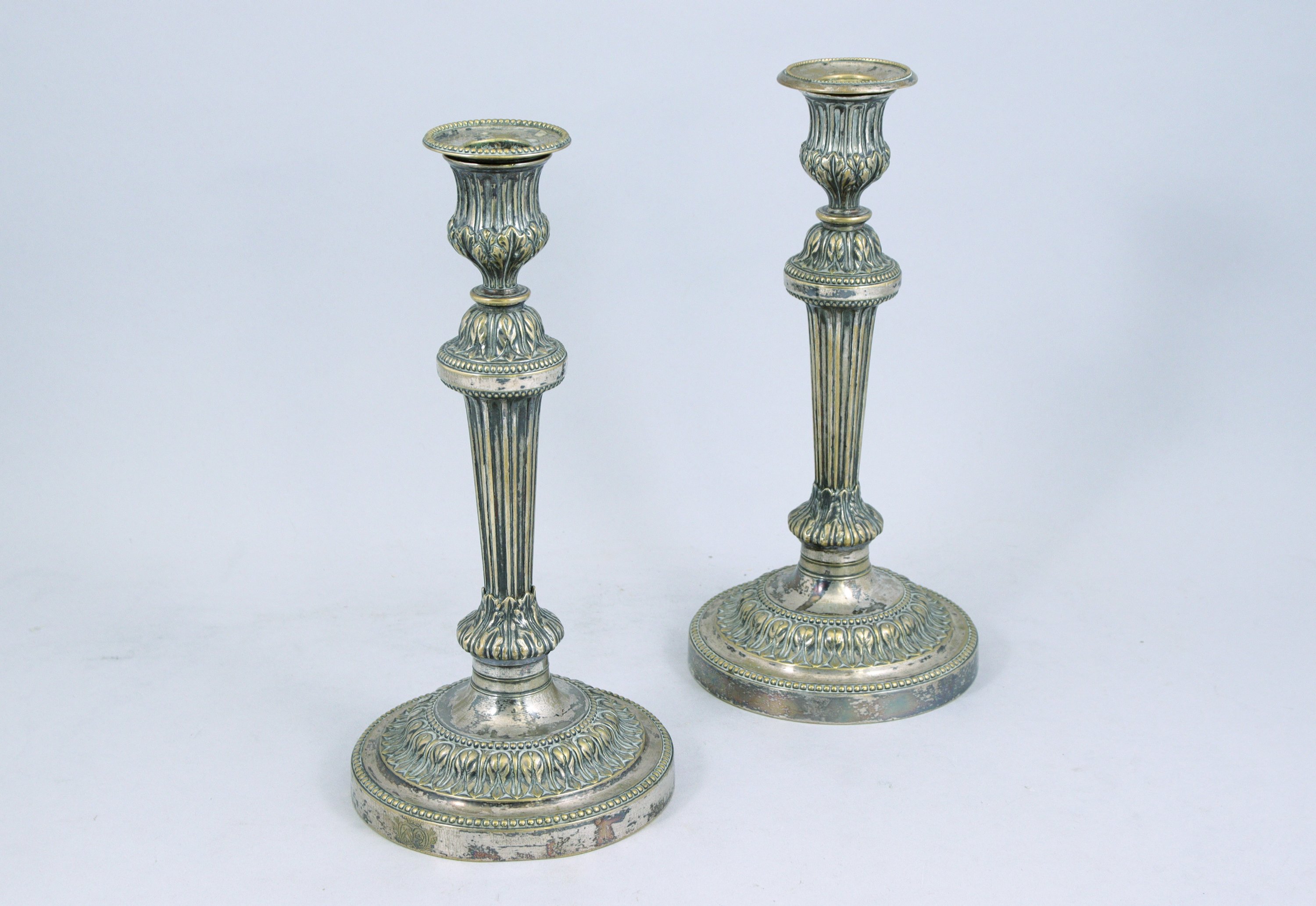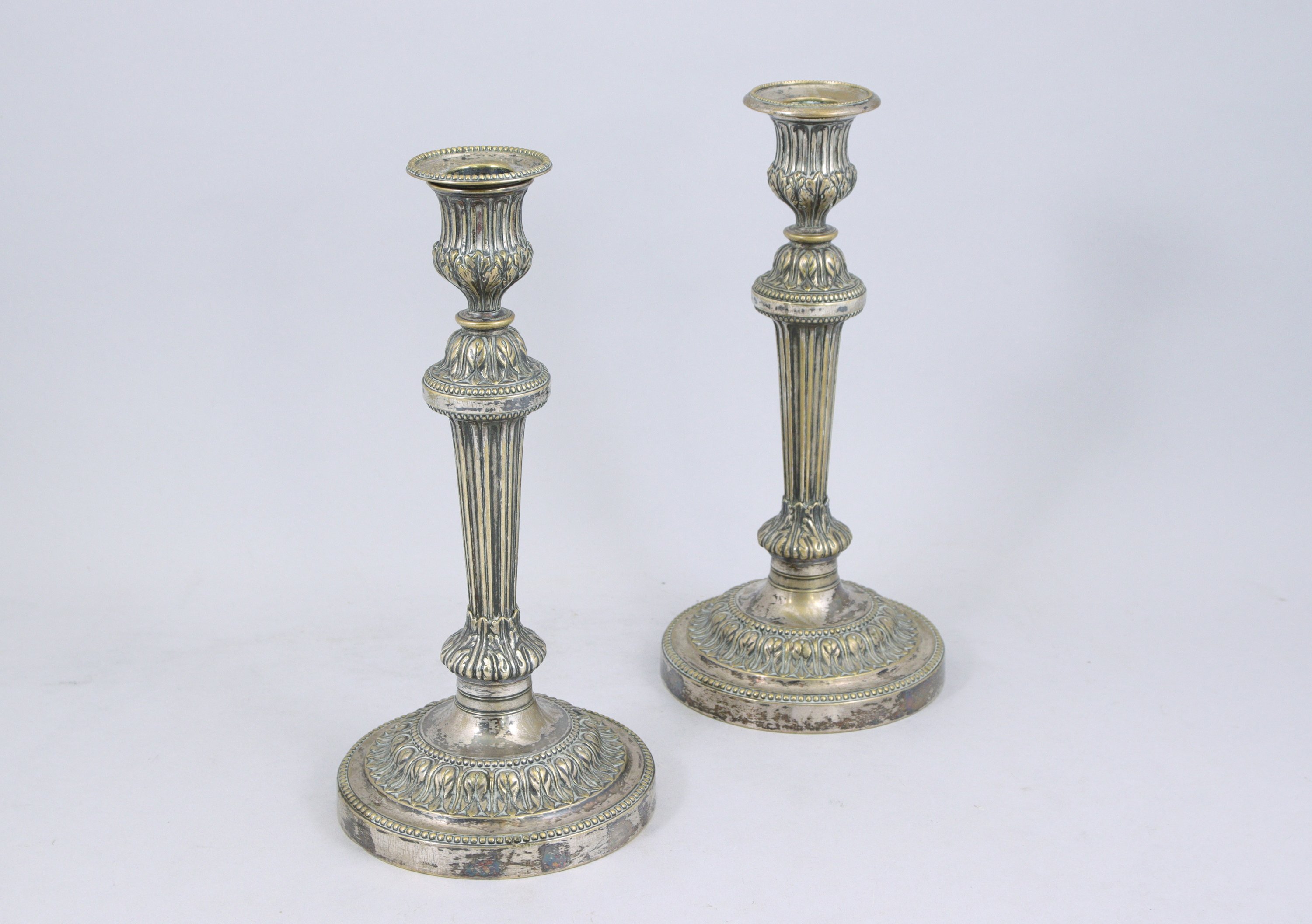 PAIRE DE FLAMBEAUX en métal argenté, reposant sur des bases circulaires à décors de feuilles et de filets de perles. Les nuds sont ornées de feuilles, les fûts sont à cannelures, les binets et les bobèches sont à motifs de feuilles.
