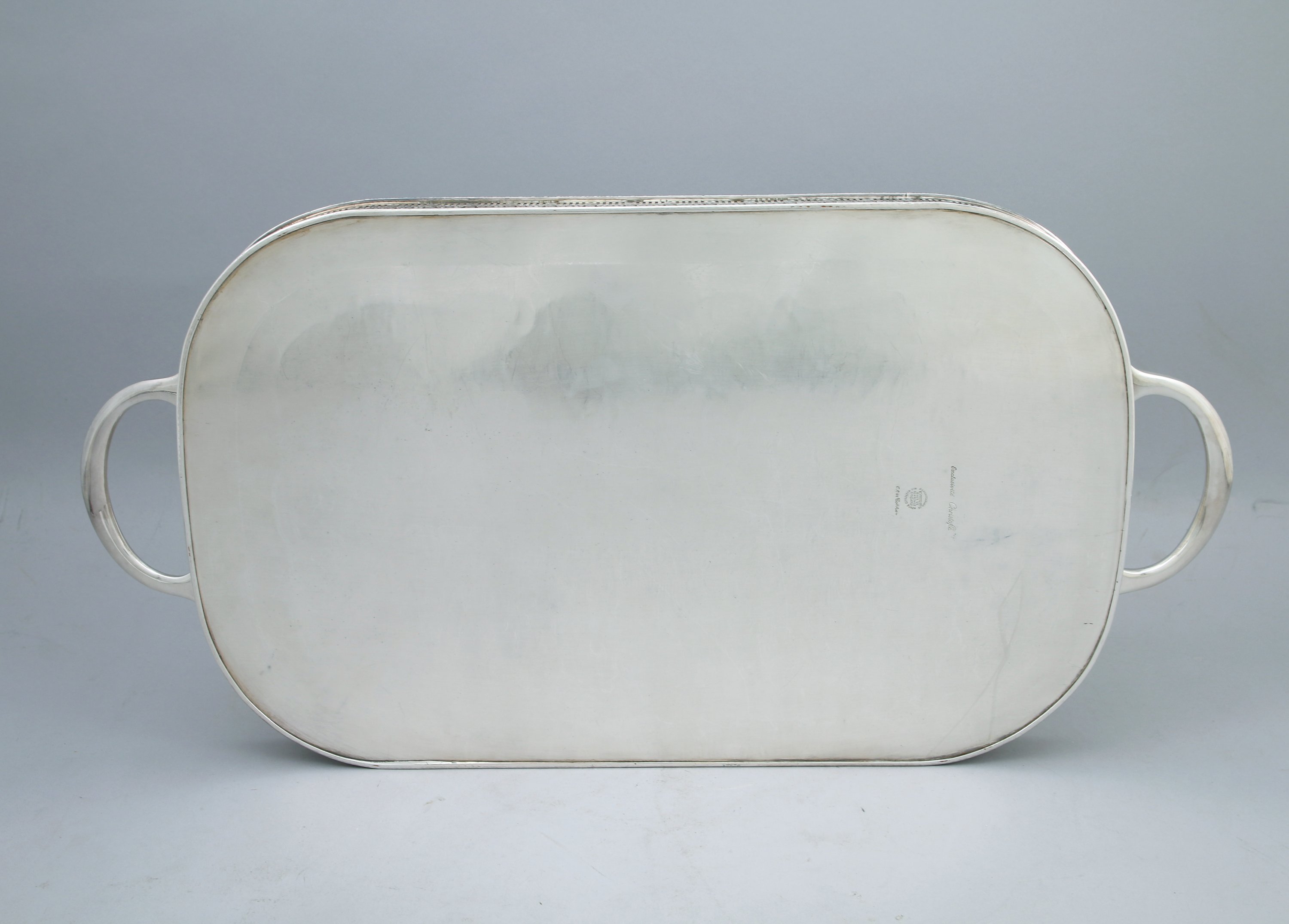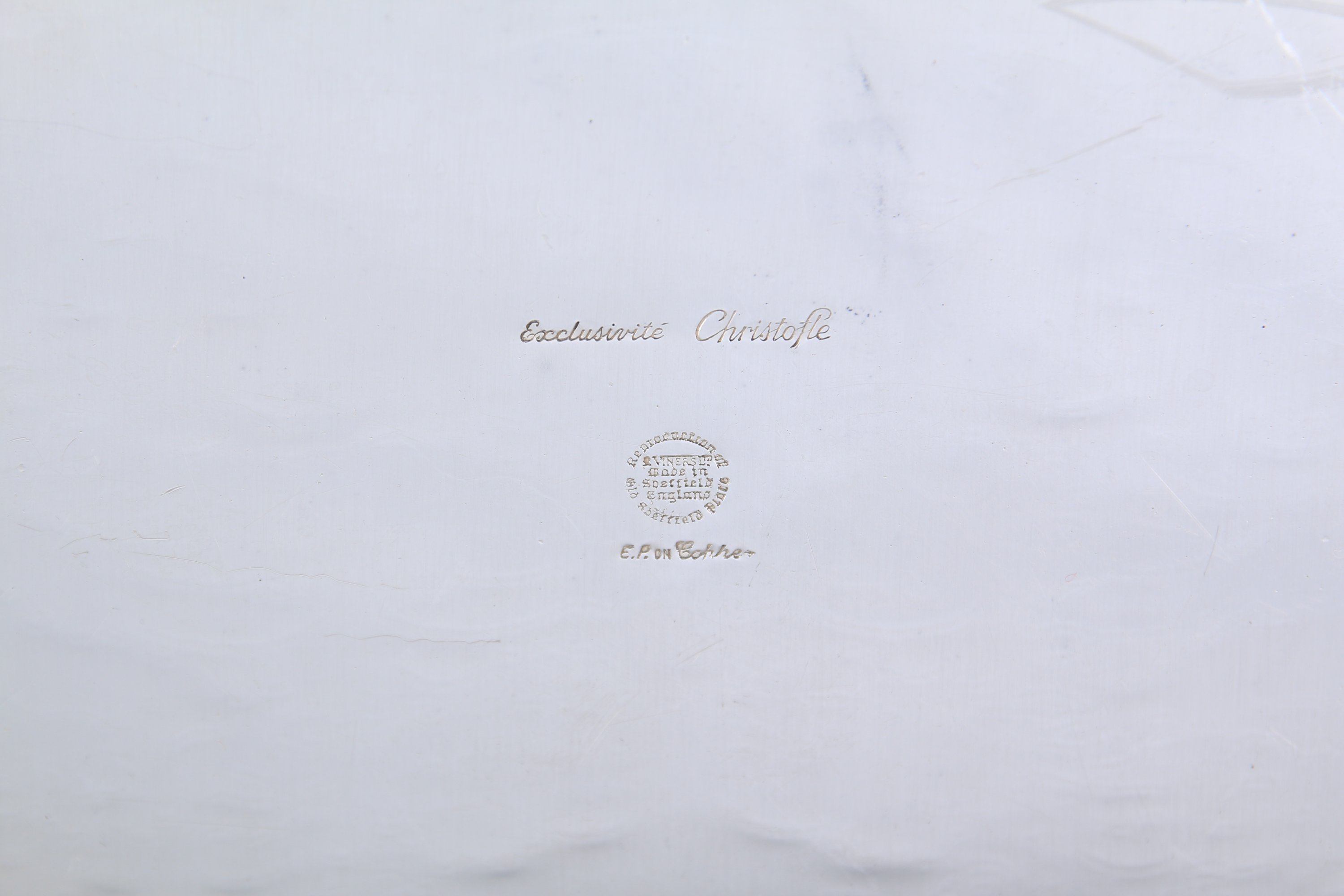 CHRISTOFLE. PLATEAU DE SERVICE en métal argenté. Contour à décor ajouré et orné de guirlandes fleuries et anses à décor de godrons et feuillages stylisés. Le bassin à riche décor de fleurs, croisillons, rinceaux feuillagés et volutes.