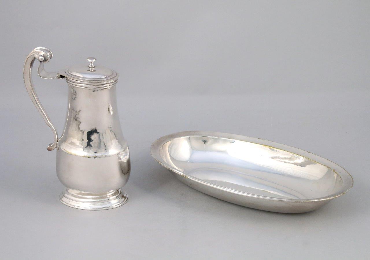Le couvercle de l'aiguière surmonté d'un bouton. Elle repose sur un pied à plusieurs doucines. Le bassin de forme oblongue.