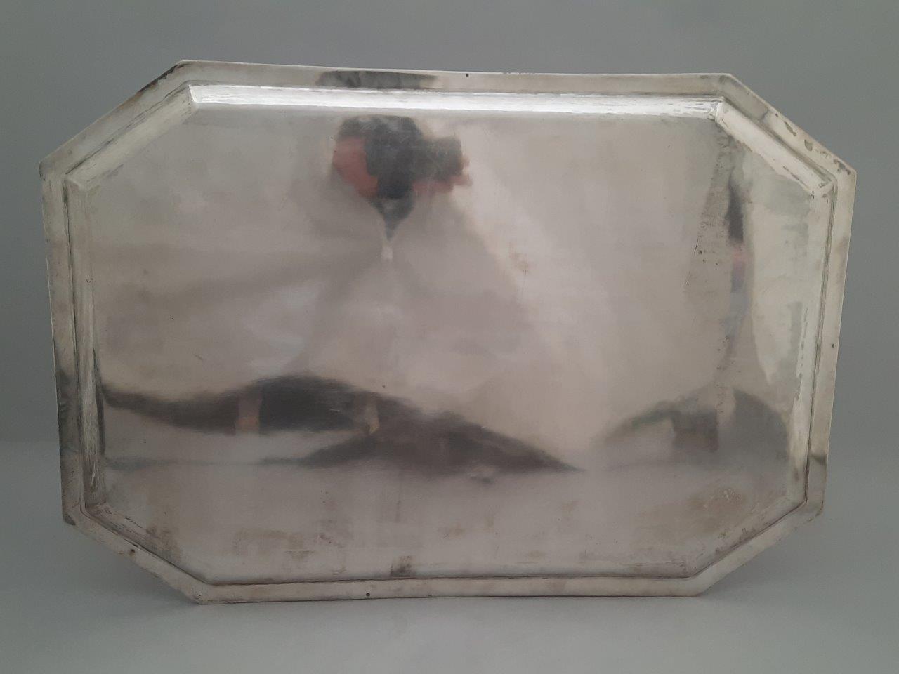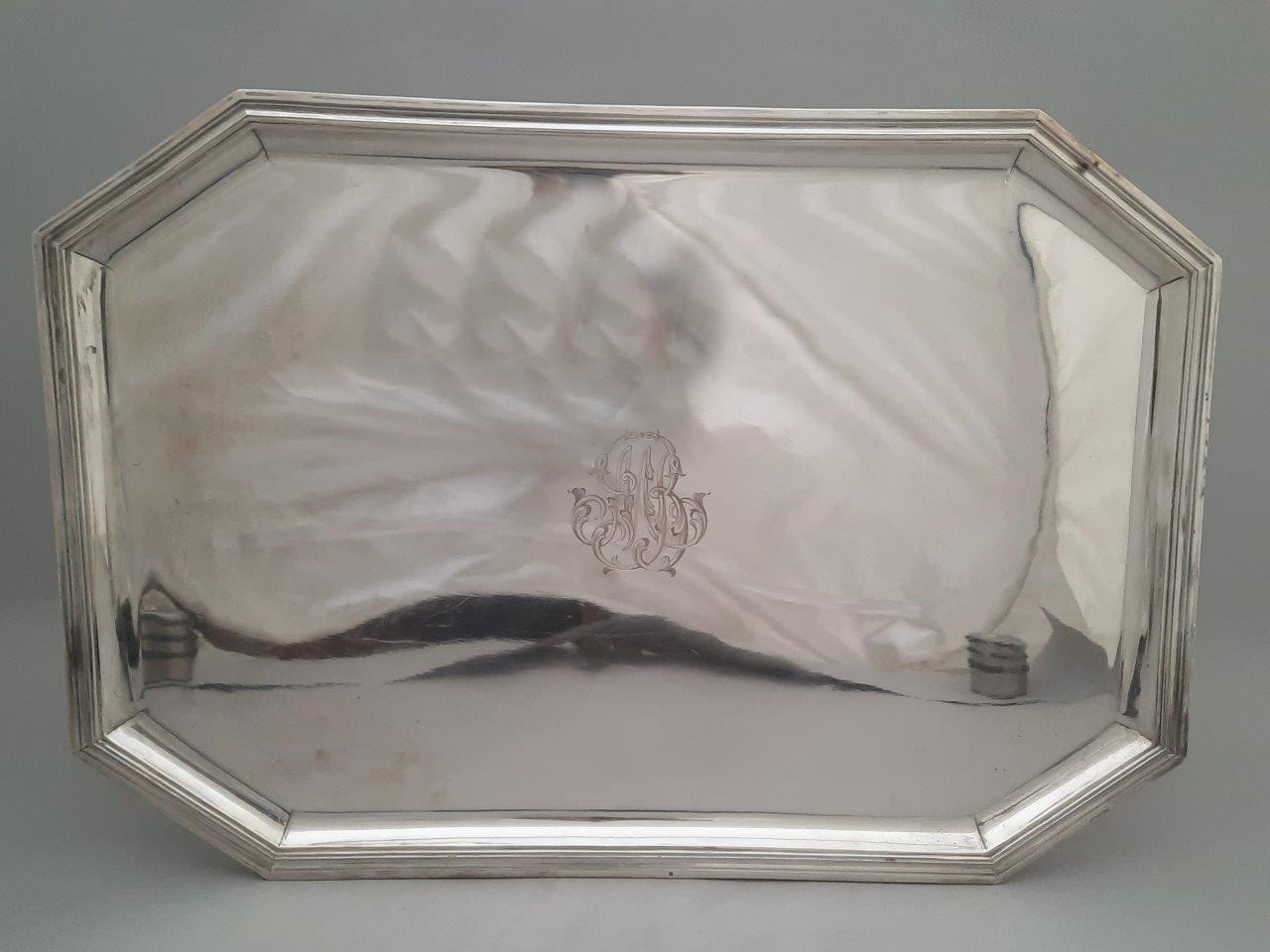 PLATEAU en argent de forme rectangulaire à pans coupés. Monogrammé MB.