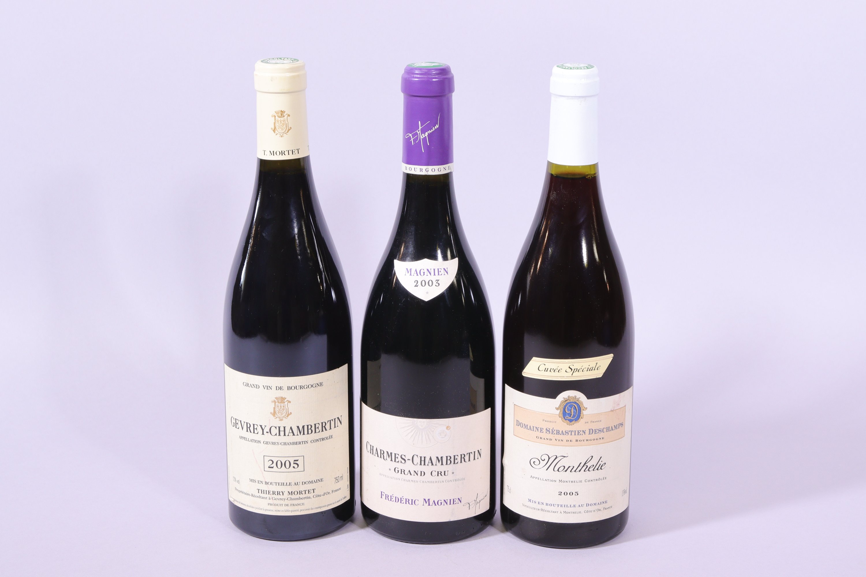 TROIS BOUTEILLES: GEVREY-CHAMBERTIN, Thierry Mortet, 2005, 1 cm ; CHARMES-CHAMBERTIN, Grand Cru, Frédérique Magnien, 2003, 1 cm ; MONTHELIE, Cuvée Spéciale, Sébastien Deschamps, 2005, 1 cm.