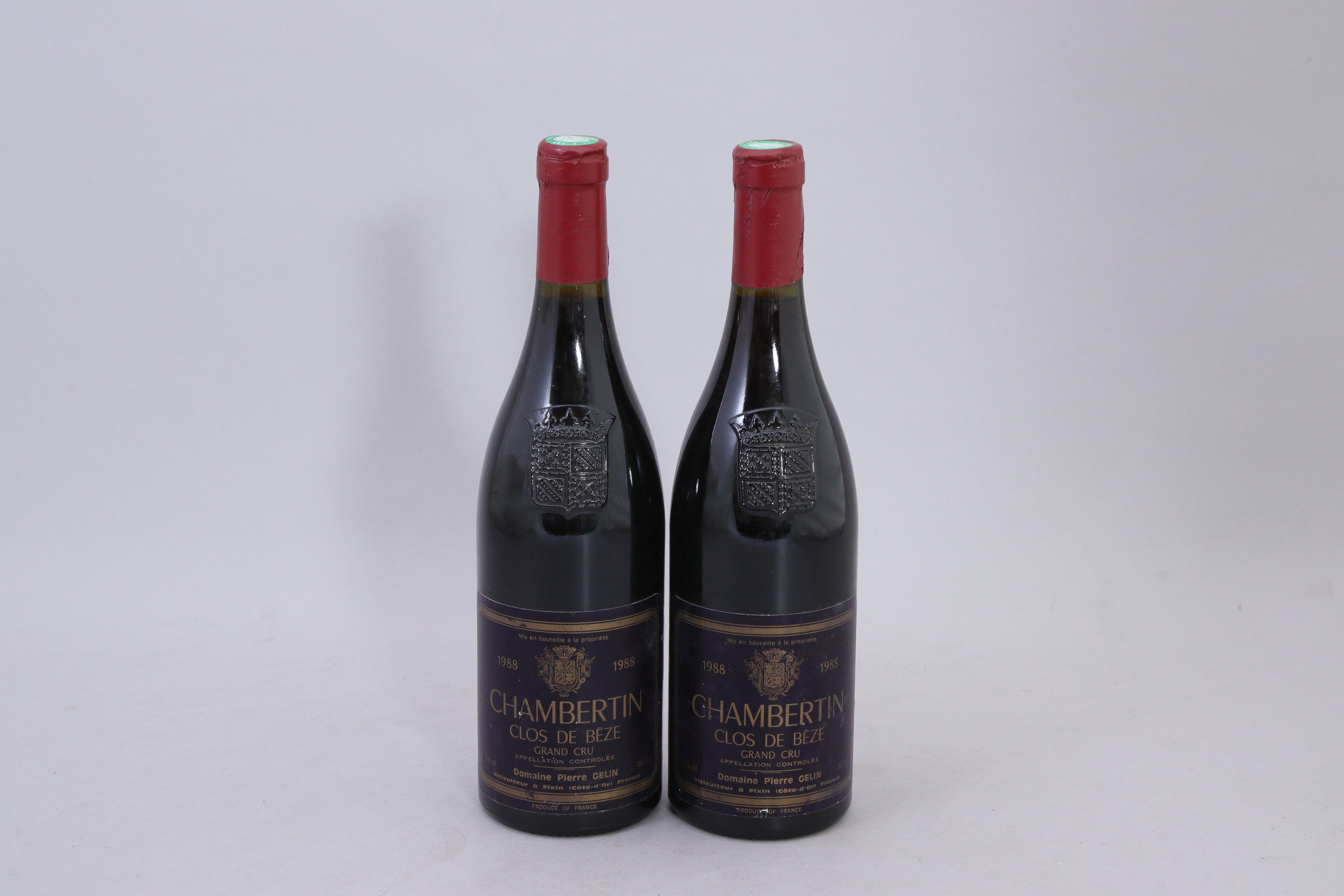 CHAMBERTIN, Clos du Bèze, Grand Cru, Pierre Gelin, 1988, deux bouteilles à 1 et 1,5 cm, une étiquette déchirée.