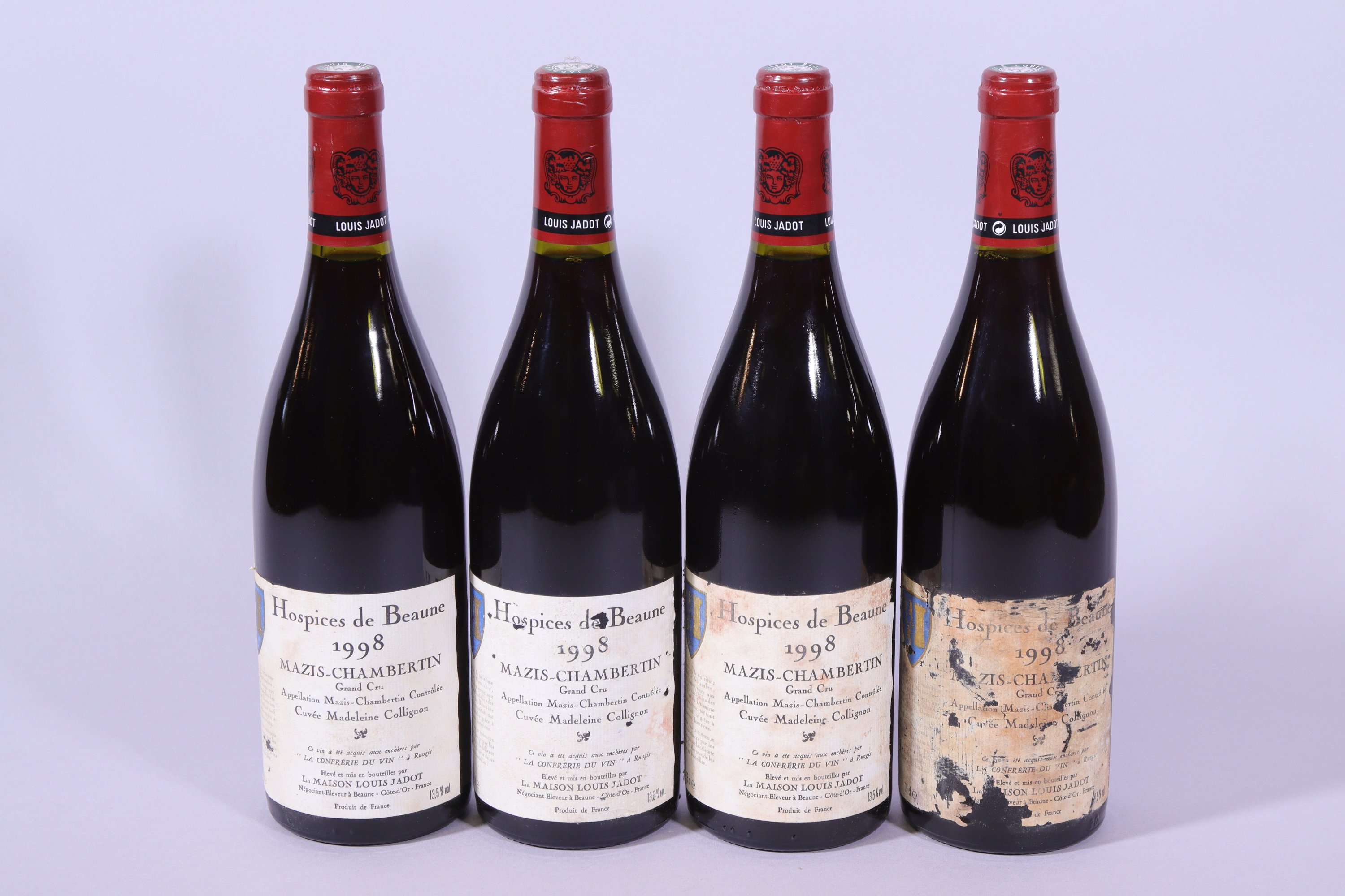 CHAMBERTIN, Mazis-Chambertin, Hospices de Beaune, Grand Cru, Cuvée Madeleine Collignon, Louis Jadot, 1998, quatre bouteilles, étiquettes déchirées et tachées.