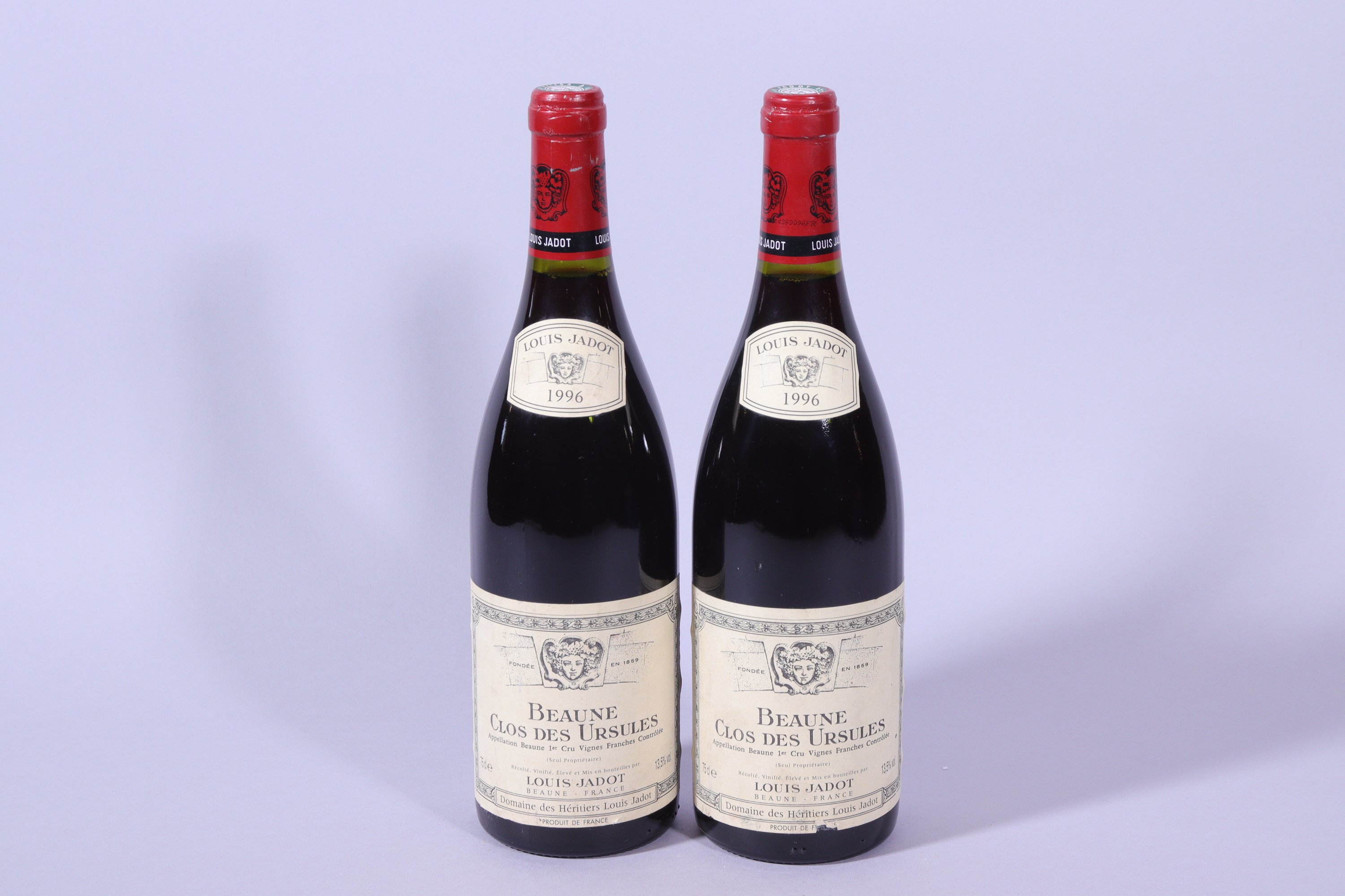 BEAUNE, 1er Cru, Clos des Ursules, Louis Jadot, 1996, deux bouteilles à 1 cm, étiquettes déchirées et tachées.