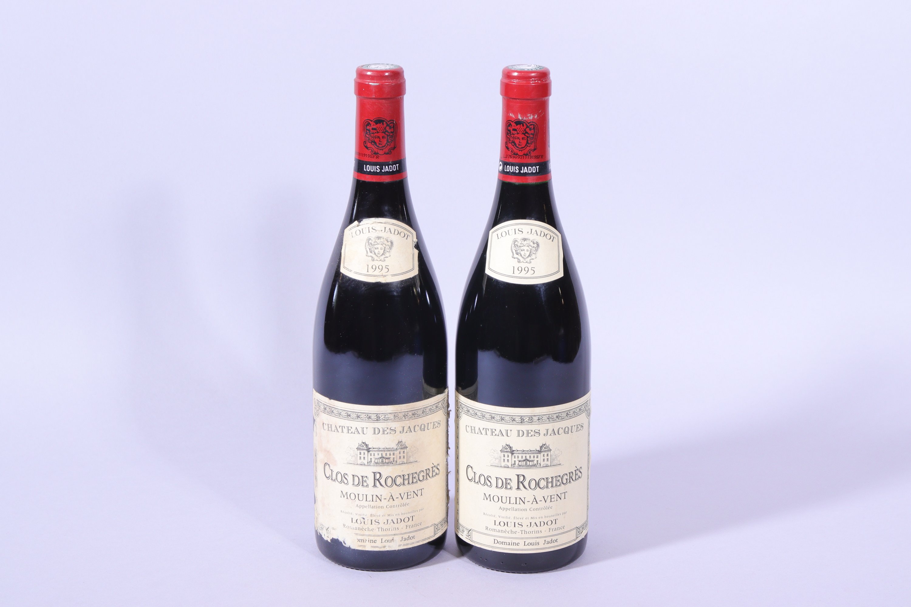 MOULIN-À-VENT, Château des Jacques, Clos de Rochegrès, Louis Jadot, 1995, deux bouteilles, étiquettes déchirées et tachées.