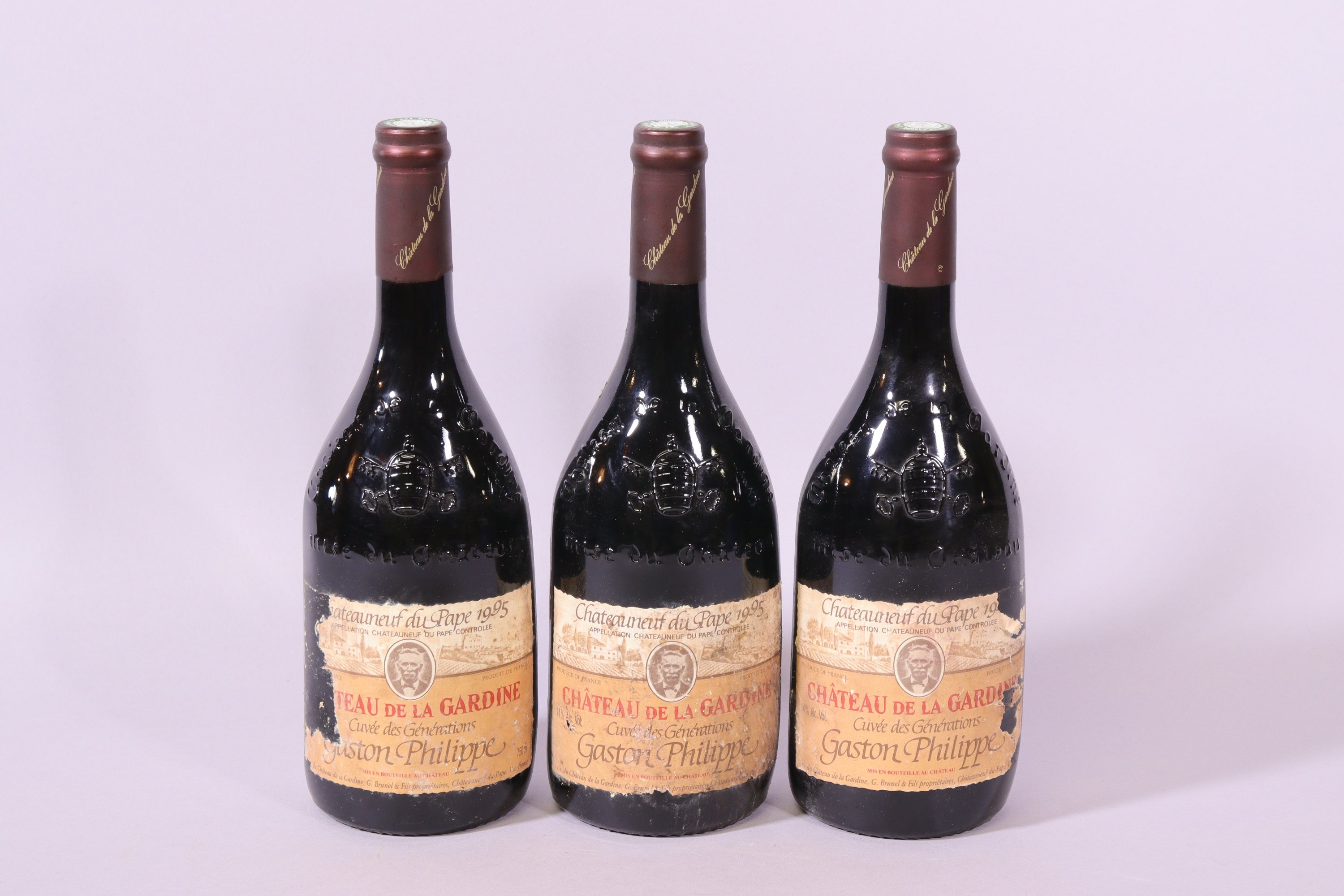 CHÂTEAU-NEUF-DU-PAPE, Château de la Gardine, Cuvée des Générations, Gaston Philippe, 1995, trois bouteilles, 1 cm, étiquettes déchirées.