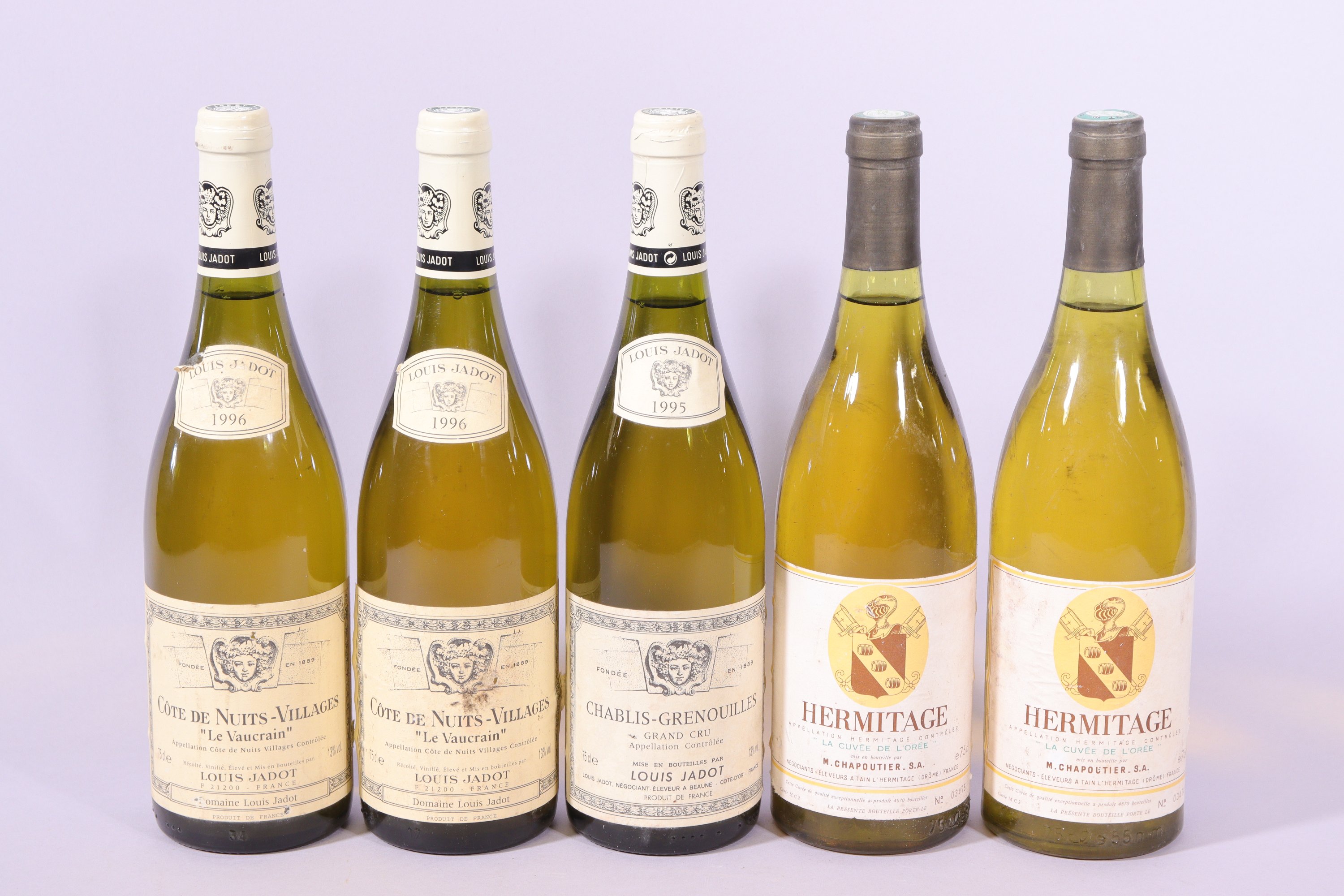 SIX BOUTEILLES: CÔTE de NUITS-VILLAGES, « Le Vaucrain », Louis Jadot, 1996, trois bouteilles, 1 à 2 cm, étiquettes abimées ; CHABLIS-GRENOUILLES, Grand Cru, Louis Jadot, 1995, 2 cm, étiquette abimée ; HERMITAGE, La Cuvée de lOrée, M. Chapoutier, année (?), deux bouteilles 2 cm.