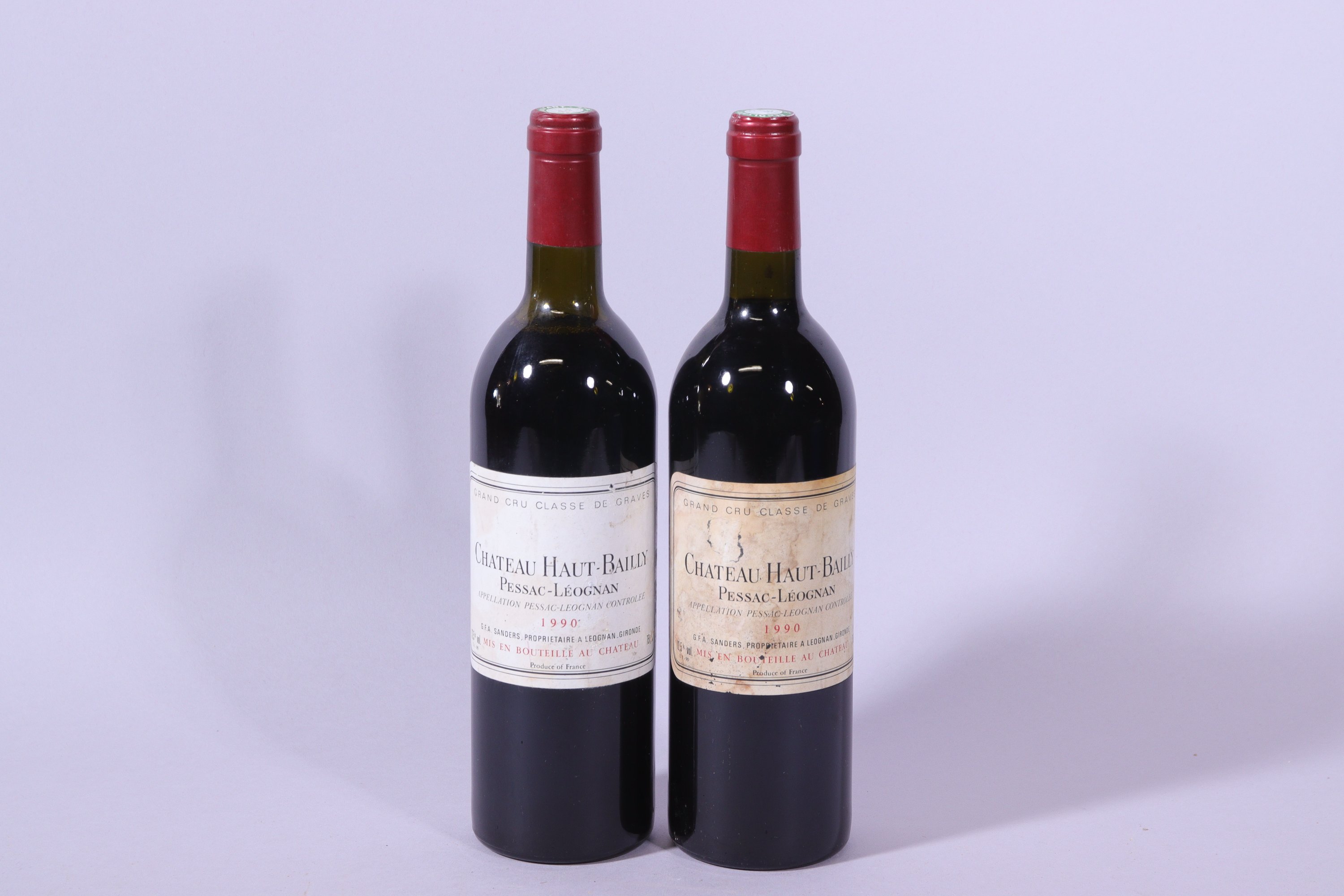 PESSAC-LÉOGNAN, Grand Cru classé, Château Haut-Bailly, G. F. A Sanders, 1990, deux bouteilles, lune BG, lautre DE, étiquettes endommagées.