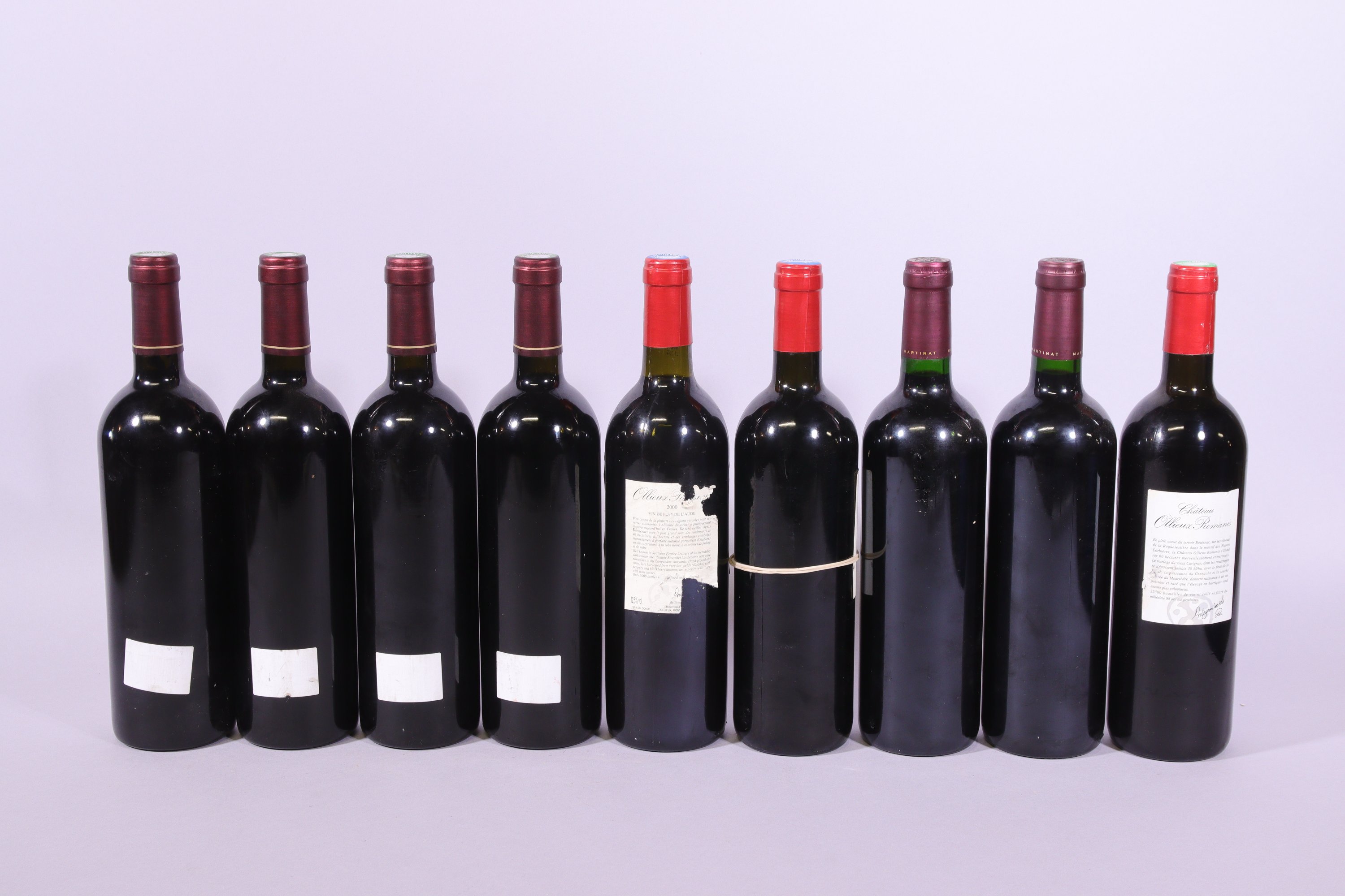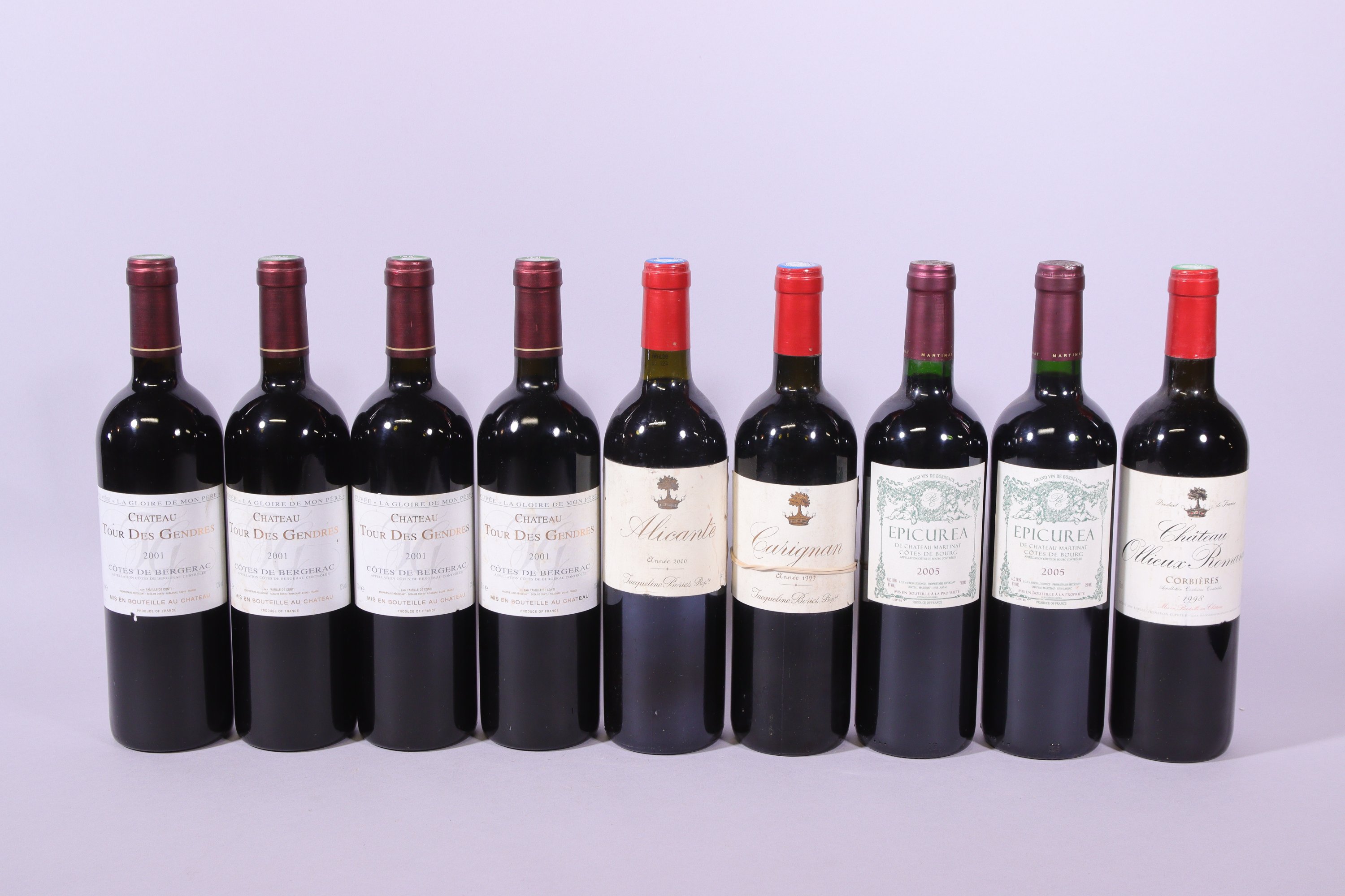 NEUF BOUTEILLES : BORDEAUX, Carignan, Jacqueline Bories, 1999, TLB, étiquette décollée ; BORDEAUX, Alicante, Jacqueline Bories, 2000, étiquette plissée ;CÔTES DE BOURG, Epicurea, Château Martinat, Marsaux Donze, deux bouteilles de 2005 ; CORBIÈRES, Château Ollieux Romanis, 1998, HE ; CÔTES de BERGERAC, Château Tour des Gendres, cuvée La Gloire de mon père, famille de Conti, 2001, quatre bouteilles.