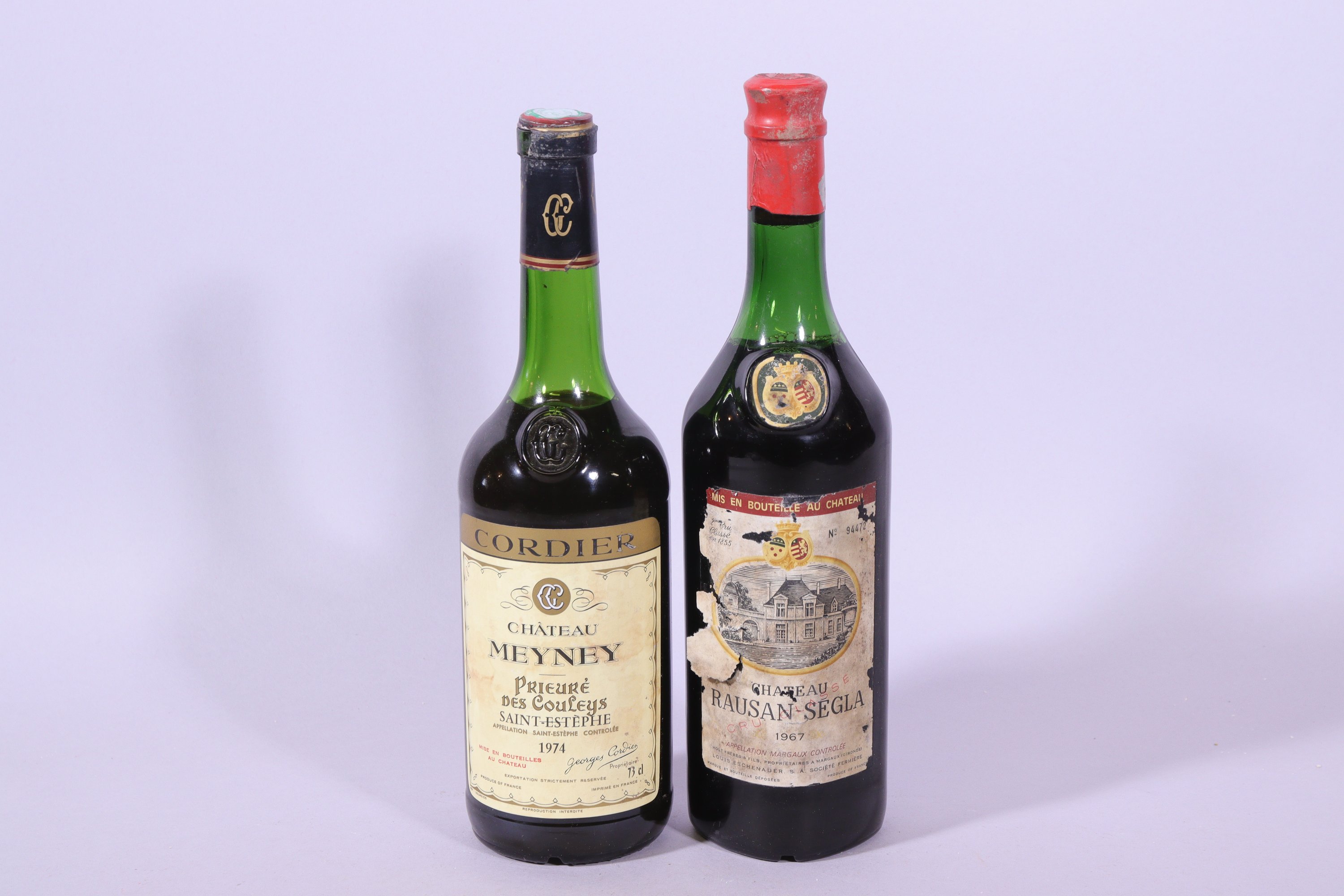 DEUX BOUTEILLES: SAINT-ESTÈPHE, Château Meyney, Prieuré des Couleys, 1974, étiquette abimée, ME ; MARGAUX, Cru classé, Château Raussan-Ségla, 1967, étiquette abîmée, ME.