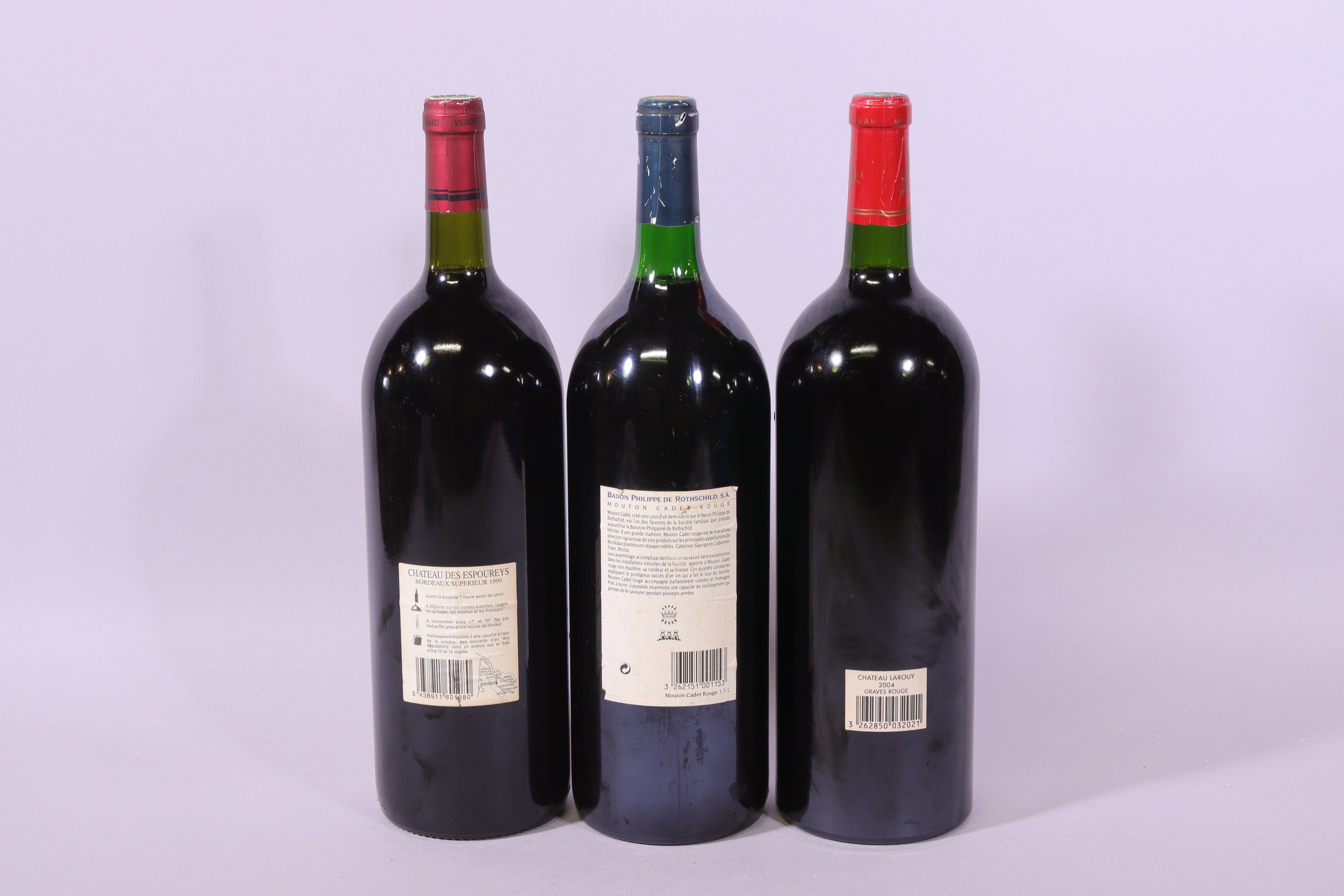 TROIS MAGNUMS: BORDEAUX, Château des Espoureys, 1999, 1,5 L, étiquette tachée, DE ; GRAVES, Château Larouy, 2004, étiquette tachée, 2004, 1,5 L, DE ; BORDEAUX, Mouton-CADET, Baron Philippe de Rothschild, 1991, 1,5 L, DE, étiquette abîmée.