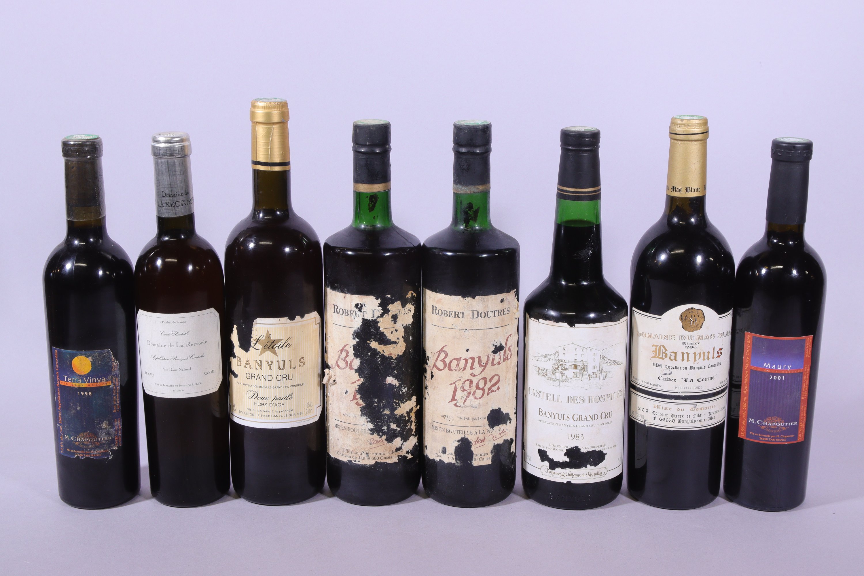 CINQ BOUTEILLES : BANYULS, Château de Jau, Robert Doutres, 1982, étiquette endommagée ; BANYULS, Château de Jau, Robert Doutres, étiquette endommagée ; BANYULS, Grand Cru, Létoile, Doux paillé, Hors dâge, étiquette déchirée ; BANYULS, Domaine du Mas Blanc, Cuvée « La Coume », Docteur Parcé et Fils, 1996, étiquette endommagée ; BANYULS, Grand Cru, Castell des Hospices, 1983, étiquette déchirée.