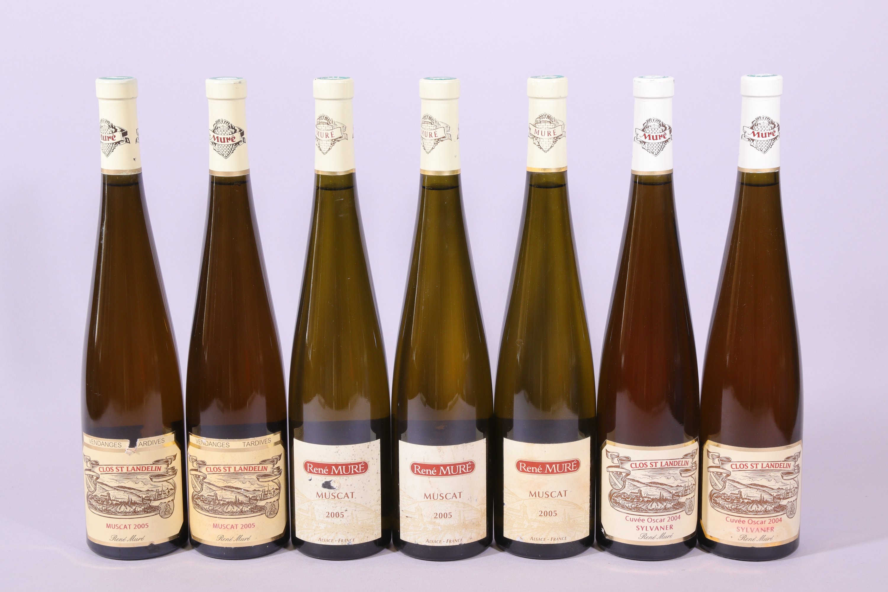 SEPT BOUTEILLES: ALSACE, Muscat, René Murat, 2005, trois bouteilles, 1,5 cm, étiquettes abimées ; ALSACE, Grand Cru, Muscat, Clos St Landelin, René Muré, 2005, deux bouteilles, 1 à 2 cm, étiquettes abîmées ; ALSACE, Sylvaner, Clos St Landelin, René Muré, 2004 deux bouteilles, 1 cm, étiquettes abimées.