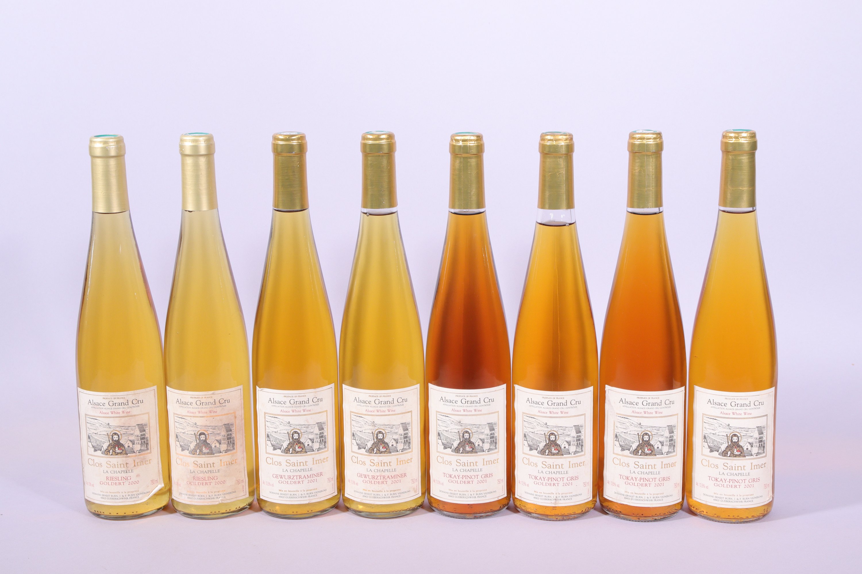 HUIT BOUTEILLES: ALSACE, Grand Cru, Tokay-Pinot Gris, Clos Saint Imer, La Chapelle, 2001, quatre bouteilles, 0,5 cm ; ALSACE, Grand Cru, Riesling, Clos Saint Imer, La Chapelle, 2001, deux bouteilles, 0,5 cm ; ALSACE, Grand Cru, Gewurzstraminer, Clos Saint Imer, La Chapelle, 2001, deux bouteilles, 0,5 cm.