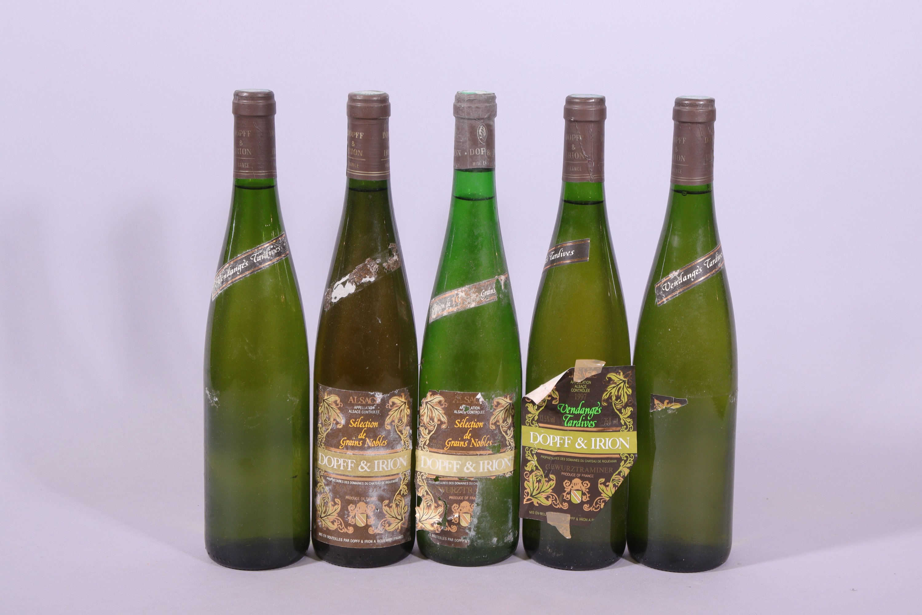 ALSACE, DOPFF & IRION, 1983 (?), cinq bouteilles, 1 à 3 cm, étiquettes abîmées.