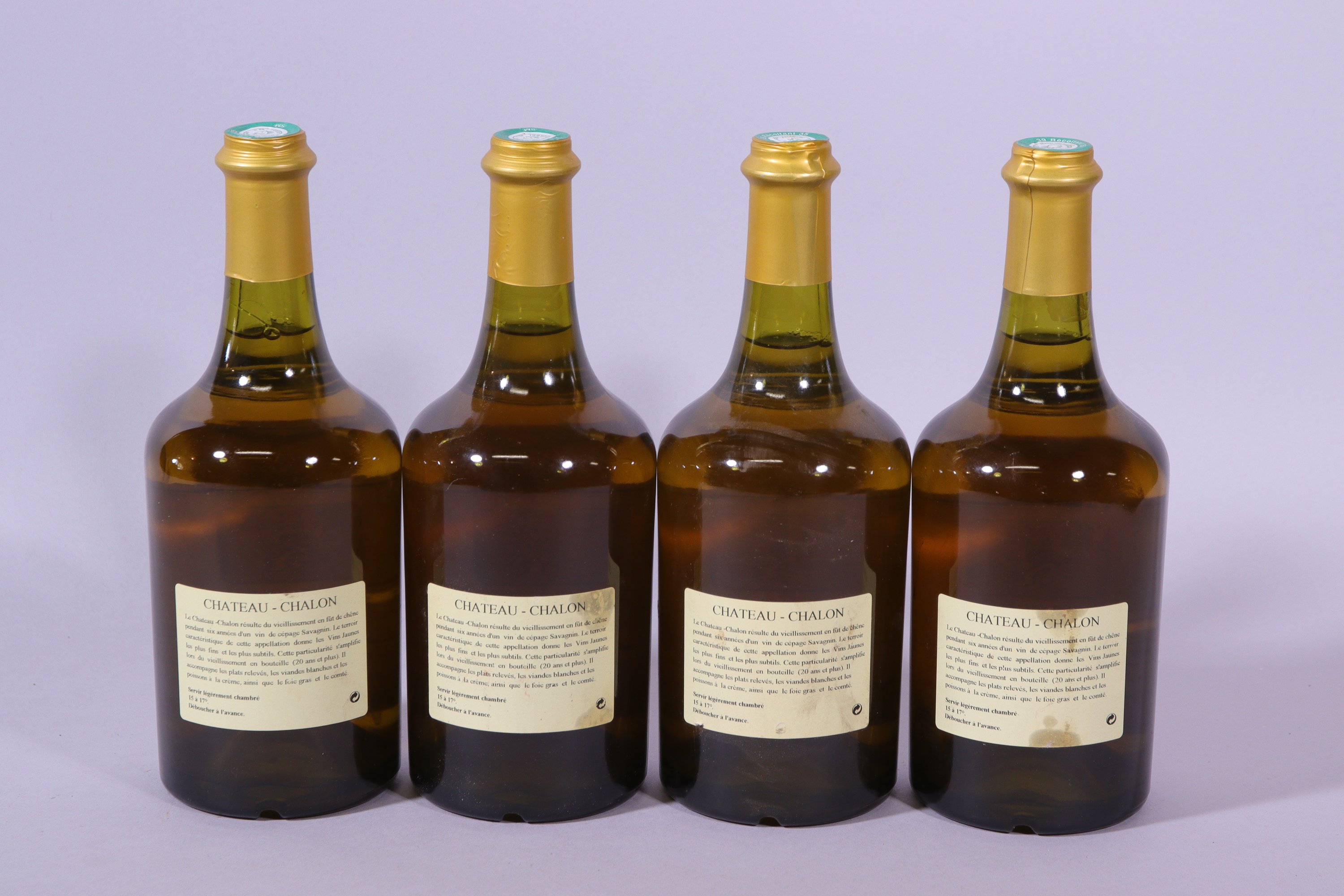 CHÂTEAU-CHALON, Vin Jaune de grande Garde, 1990, quatre bouteilles, 2 à 3 cm, étiquettes abîmées.