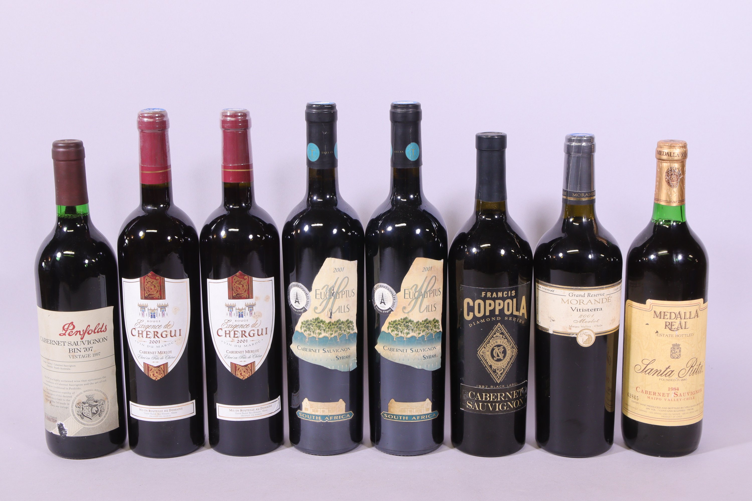 HUIT BOUTEILLES de VINS ROUGE « TOUR du MONDE », 1 à 3,5 cm, étiquettes abîmées.