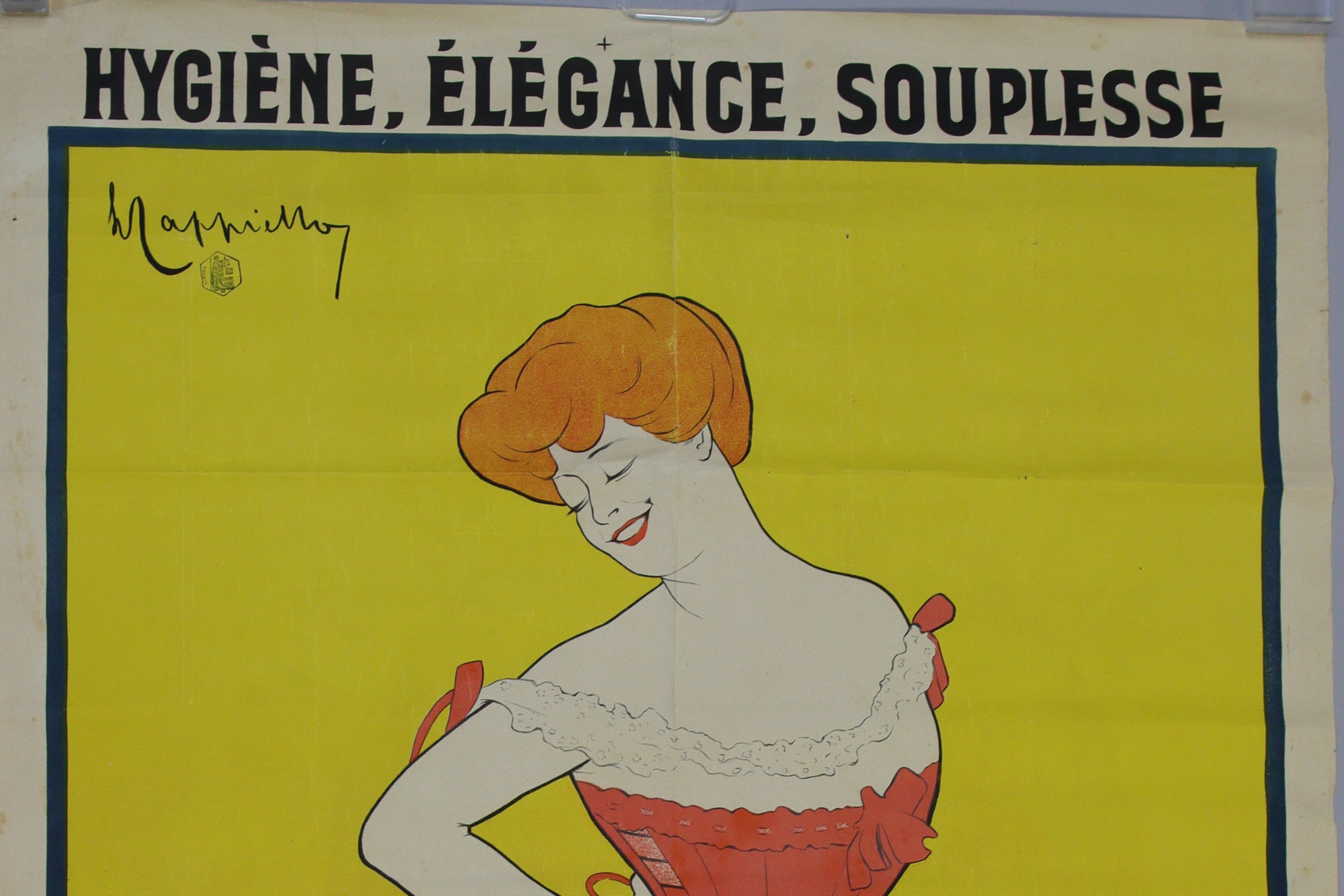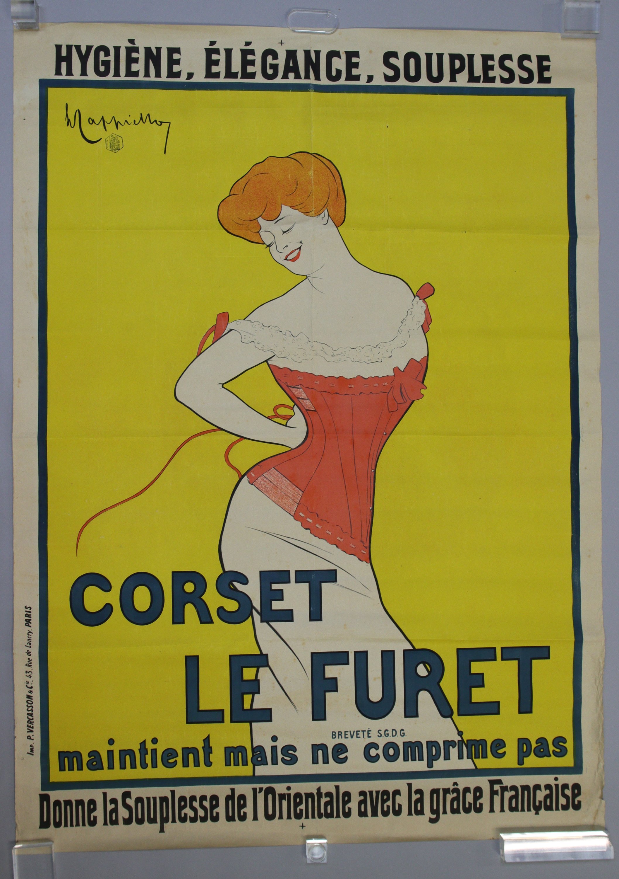 "CORSET LE FURET / Hygiène, Elégance, Souplesse / maintient mais ne comprime pas / Donne la souplesse de lOrientale avec la grâce Française". Signée. [1901]. Epreuve originale imprimée en couleurs "Imp. P. Vercasson & Cie 43 rue de Lancry Paris".
