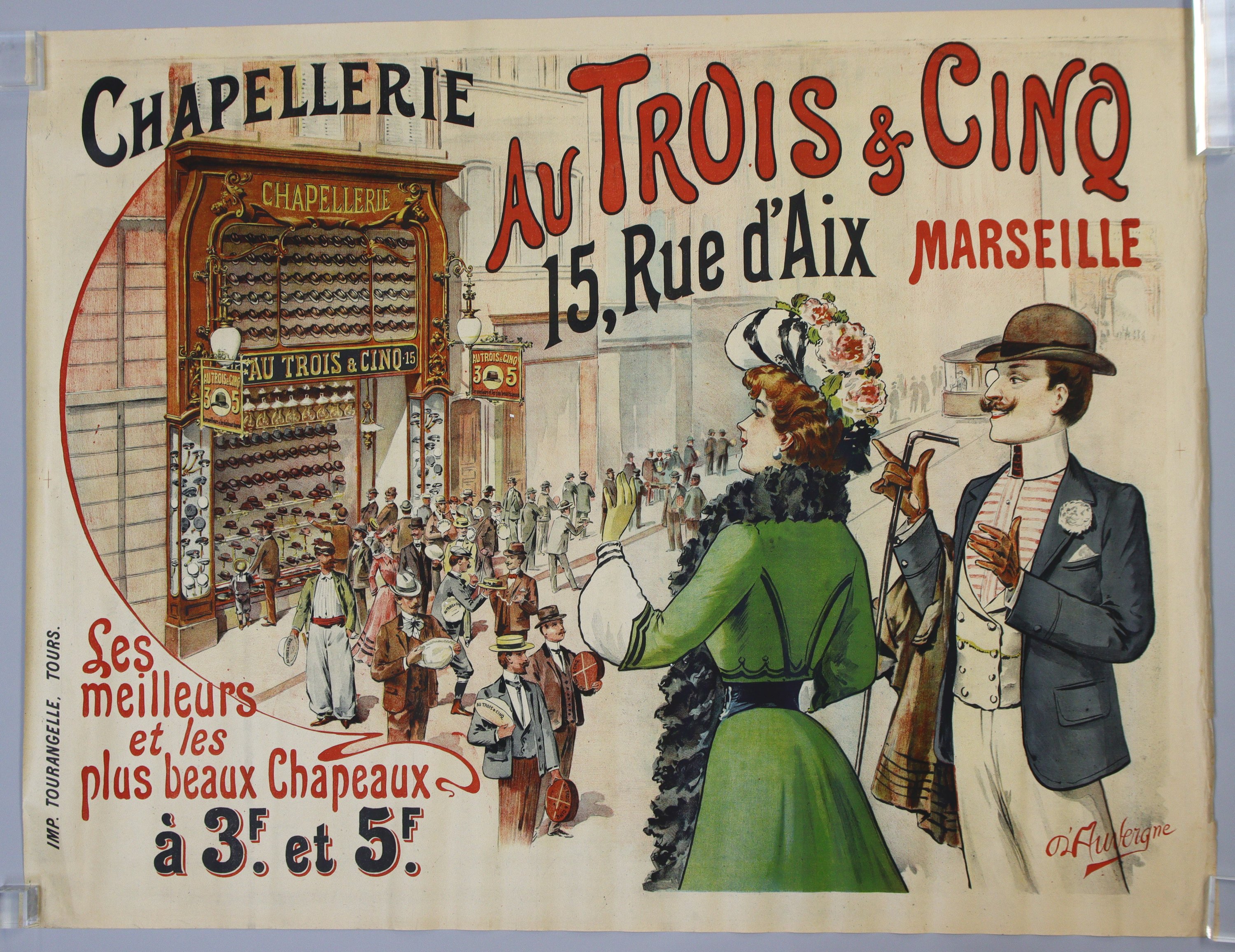 "CHAPELLERIE AU TROIS & CINQ / 15 rue dAix Marseille/ Les meilleurs et les plus beaux chapeaux". Signée. Vers 1900. Epreuve originale imprimée en couleurs. "Imp. Tourangelle, Tours. "