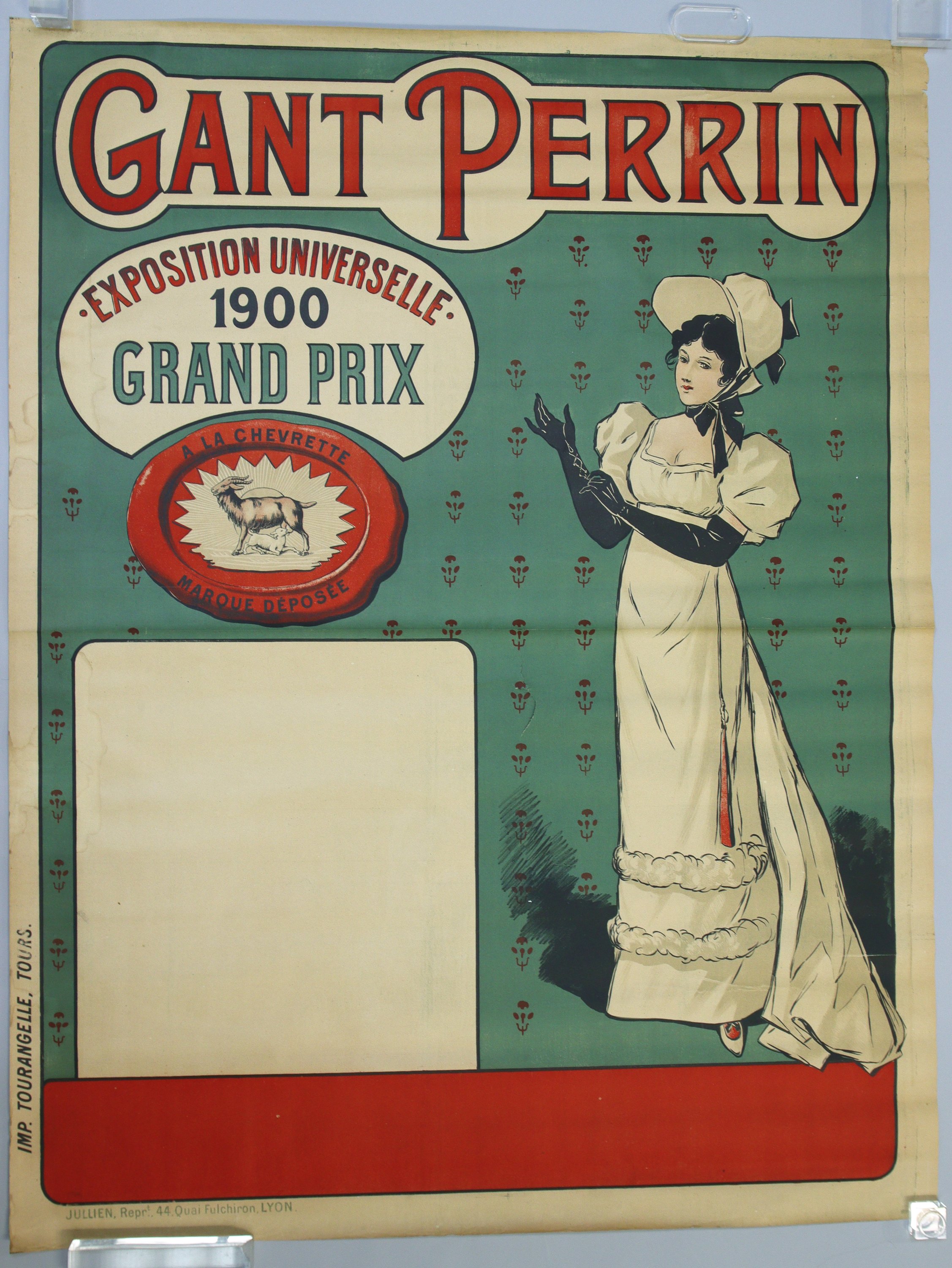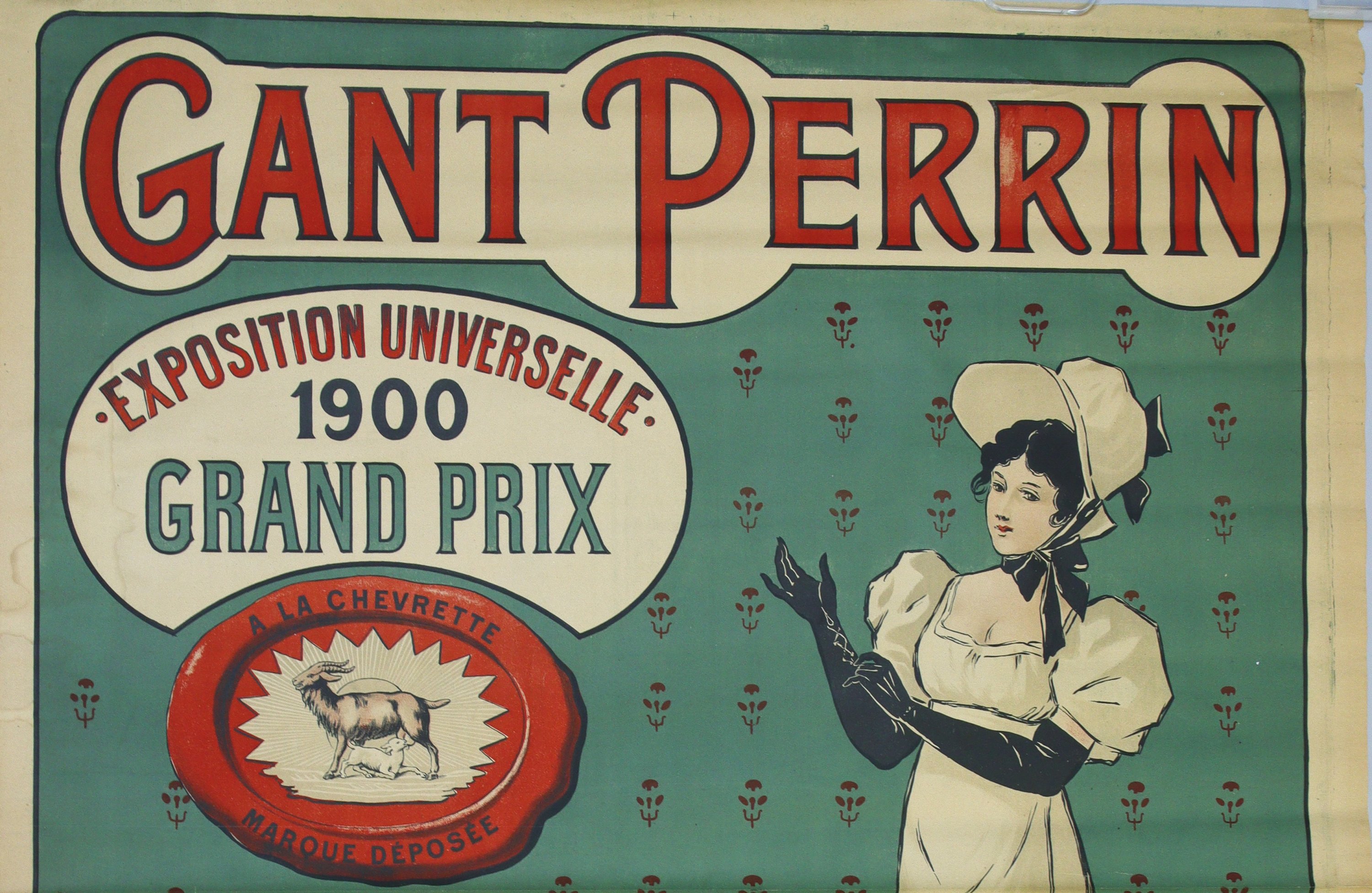 "GANT PERRIN / A la chevrette / marque déposée / Exposition universelle 1900 Grand Prix" Epreuve originale avant la lettre imprimée en couleurs. "Imp. Tourangelle, Tours".