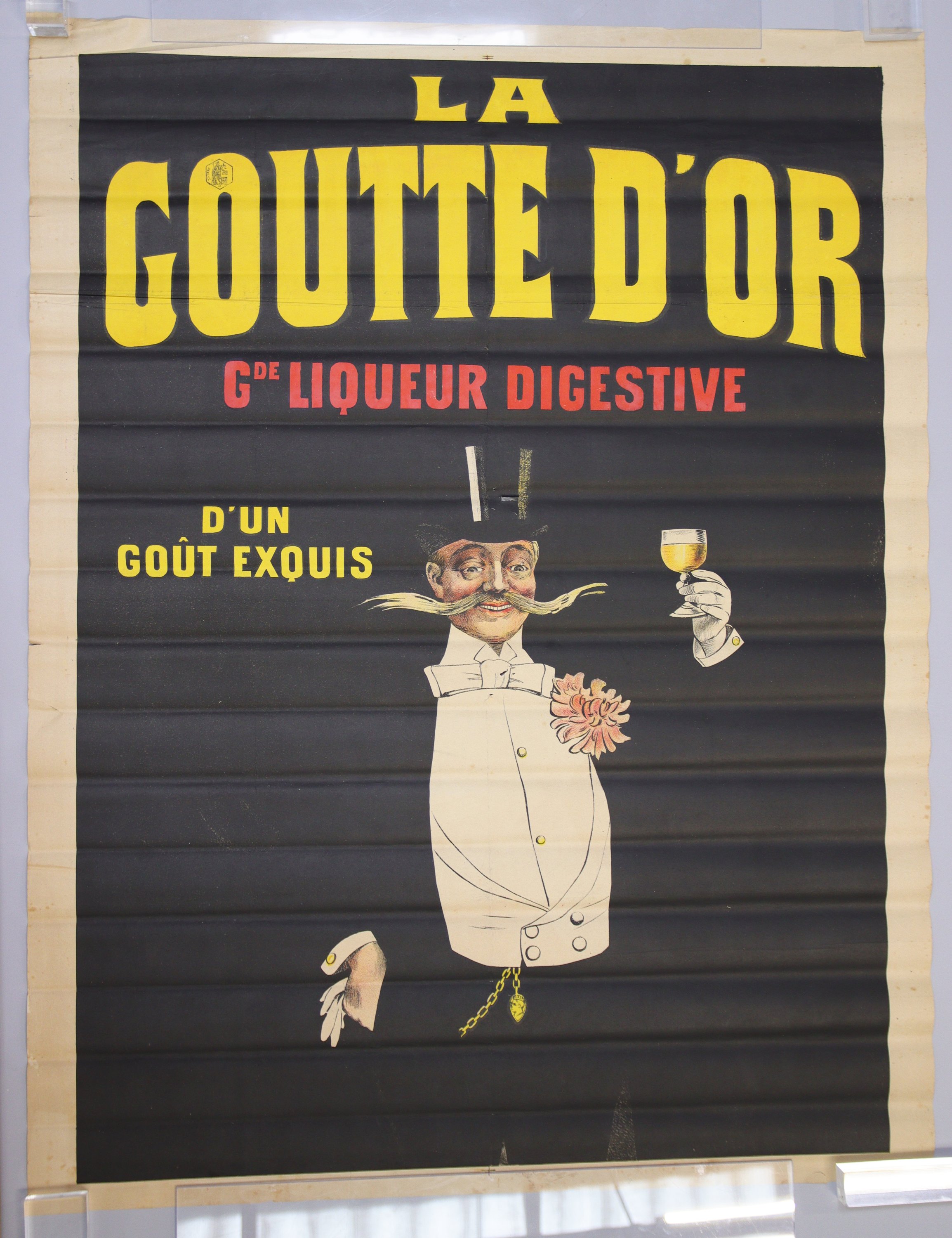 "LA GOUTTE D'OR / Gde liqueur digestive / d'un goût exquis". Signée. Vers 1900. Epreuve originale imprimée en couleurs. Timbre fiscal. Incomplète (Manque la partie inférieure de l'affiche signée par Senard avec l'inscriptio en bas"A. Perdirzet & Cie - Dijon").